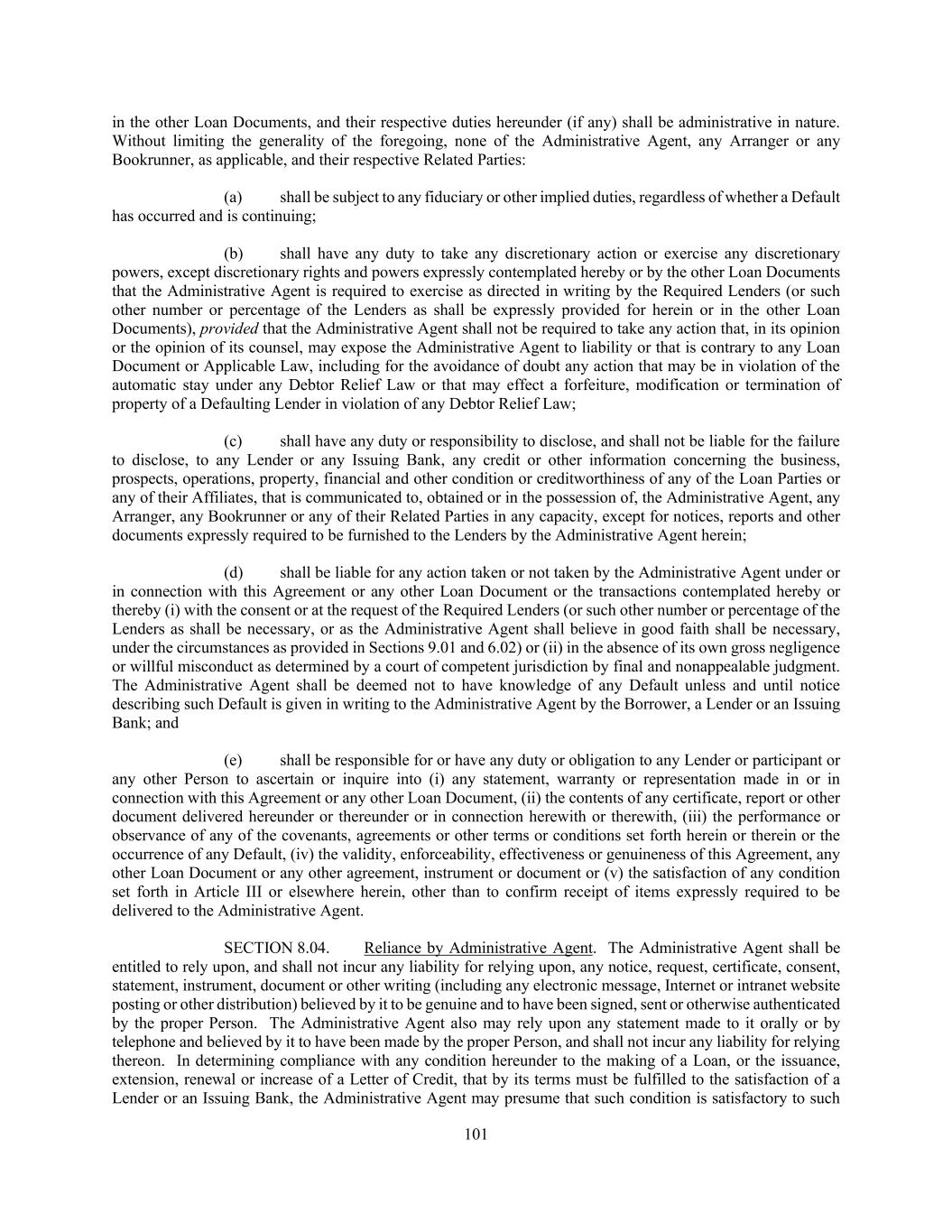 101 in the other Loan Documents, and their respective duties hereunder (if any) shall be administrative in nature. Without limiting the generality of the foregoing, none of the Administrative Agent, any Arranger or any Bookrunner, as applicable, and their respective Related Parties: (a) shall be subject to any fiduciary or other implied duties, regardless of whether a Default has occurred and is continuing; (b) shall have any duty to take any discretionary action or exercise any discretionary powers, except discretionary rights and powers expressly contemplated hereby or by the other Loan Documents that the Administrative Agent is required to exercise as directed in writing by the Required Lenders (or such other number or percentage of the Lenders as shall be expressly provided for herein or in the other Loan Documents), provided that the Administrative Agent shall not be required to take any action that, in its opinion or the opinion of its counsel, may expose the Administrative Agent to liability or that is contrary to any Loan Document or Applicable Law, including for the avoidance of doubt any action that may be in violation of the automatic stay under any Debtor Relief Law or that may effect a forfeiture, modification or termination of property of a Defaulting Lender in violation of any Debtor Relief Law; (c) shall have any duty or responsibility to disclose, and shall not be liable for the failure to disclose, to any Lender or any Issuing Bank, any credit or other information concerning the business, prospects, operations, property, financial and other condition or creditworthiness of any of the Loan Parties or any of their Affiliates, that is communicated to, obtained or in the possession of, the Administrative Agent, any Arranger, any Bookrunner or any of their Related Parties in any capacity, except for notices, reports and other documents expressly required to be furnished to the Lenders by the Administrative Agent herein; (d) shall be liable for any action taken or not taken by the Administrative Agent under or in connection with this Agreement or any other Loan Document or the transactions contemplated hereby or thereby (i) with the consent or at the request of the Required Lenders (or such other number or percentage of the Lenders as shall be necessary, or as the Administrative Agent shall believe in good faith shall be necessary, under the circumstances as provided in Sections 9.01 and 6.02) or (ii) in the absence of its own gross negligence or willful misconduct as determined by a court of competent jurisdiction by final and nonappealable judgment. The Administrative Agent shall be deemed not to have knowledge of any Default unless and until notice describing such Default is given in writing to the Administrative Agent by the Borrower, a Lender or an Issuing Bank; and (e) shall be responsible for or have any duty or obligation to any Lender or participant or any other Person to ascertain or inquire into (i) any statement, warranty or representation made in or in connection with this Agreement or any other Loan Document, (ii) the contents of any certificate, report or other document delivered hereunder or thereunder or in connection herewith or therewith, (iii) the performance or observance of any of the covenants, agreements or other terms or conditions set forth herein or therein or the occurrence of any Default, (iv) the validity, enforceability, effectiveness or genuineness of this Agreement, any other Loan Document or any other agreement, instrument or document or (v) the satisfaction of any condition set forth in Article III or elsewhere herein, other than to confirm receipt of items expressly required to be delivered to the Administrative Agent. SECTION 8.04. Reliance by Administrative Agent. The Administrative Agent shall be entitled to rely upon, and shall not incur any liability for relying upon, any notice, request, certificate, consent, statement, instrument, document or other writing (including any electronic message, Internet or intranet website posting or other distribution) believed by it to be genuine and to have been signed, sent or otherwise authenticated by the proper Person. The Administrative Agent also may rely upon any statement made to it orally or by telephone and believed by it to have been made by the proper Person, and shall not incur any liability for relying thereon. In determining compliance with any condition hereunder to the making of a Loan, or the issuance, extension, renewal or increase of a Letter of Credit, that by its terms must be fulfilled to the satisfaction of a Lender or an Issuing Bank, the Administrative Agent may presume that such condition is satisfactory to such