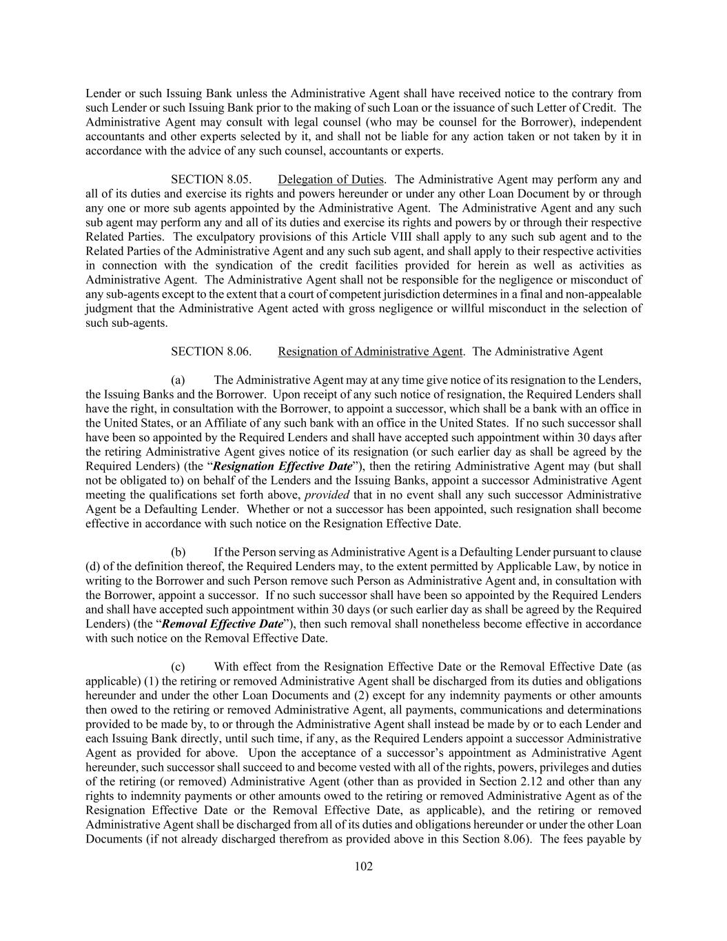 102 Lender or such Issuing Bank unless the Administrative Agent shall have received notice to the contrary from such Lender or such Issuing Bank prior to the making of such Loan or the issuance of such Letter of Credit. The Administrative Agent may consult with legal counsel (who may be counsel for the Borrower), independent accountants and other experts selected by it, and shall not be liable for any action taken or not taken by it in accordance with the advice of any such counsel, accountants or experts. SECTION 8.05. Delegation of Duties. The Administrative Agent may perform any and all of its duties and exercise its rights and powers hereunder or under any other Loan Document by or through any one or more sub agents appointed by the Administrative Agent. The Administrative Agent and any such sub agent may perform any and all of its duties and exercise its rights and powers by or through their respective Related Parties. The exculpatory provisions of this Article VIII shall apply to any such sub agent and to the Related Parties of the Administrative Agent and any such sub agent, and shall apply to their respective activities in connection with the syndication of the credit facilities provided for herein as well as activities as Administrative Agent. The Administrative Agent shall not be responsible for the negligence or misconduct of any sub-agents except to the extent that a court of competent jurisdiction determines in a final and non-appealable judgment that the Administrative Agent acted with gross negligence or willful misconduct in the selection of such sub-agents. SECTION 8.06. Resignation of Administrative Agent. The Administrative Agent (a) The Administrative Agent may at any time give notice of its resignation to the Lenders, the Issuing Banks and the Borrower. Upon receipt of any such notice of resignation, the Required Lenders shall have the right, in consultation with the Borrower, to appoint a successor, which shall be a bank with an office in the United States, or an Affiliate of any such bank with an office in the United States. If no such successor shall have been so appointed by the Required Lenders and shall have accepted such appointment within 30 days after the retiring Administrative Agent gives notice of its resignation (or such earlier day as shall be agreed by the Required Lenders) (the “Resignation Effective Date”), then the retiring Administrative Agent may (but shall not be obligated to) on behalf of the Lenders and the Issuing Banks, appoint a successor Administrative Agent meeting the qualifications set forth above, provided that in no event shall any such successor Administrative Agent be a Defaulting Lender. Whether or not a successor has been appointed, such resignation shall become effective in accordance with such notice on the Resignation Effective Date. (b) If the Person serving as Administrative Agent is a Defaulting Lender pursuant to clause (d) of the definition thereof, the Required Lenders may, to the extent permitted by Applicable Law, by notice in writing to the Borrower and such Person remove such Person as Administrative Agent and, in consultation with the Borrower, appoint a successor. If no such successor shall have been so appointed by the Required Lenders and shall have accepted such appointment within 30 days (or such earlier day as shall be agreed by the Required Lenders) (the “Removal Effective Date”), then such removal shall nonetheless become effective in accordance with such notice on the Removal Effective Date. (c) With effect from the Resignation Effective Date or the Removal Effective Date (as applicable) (1) the retiring or removed Administrative Agent shall be discharged from its duties and obligations hereunder and under the other Loan Documents and (2) except for any indemnity payments or other amounts then owed to the retiring or removed Administrative Agent, all payments, communications and determinations provided to be made by, to or through the Administrative Agent shall instead be made by or to each Lender and each Issuing Bank directly, until such time, if any, as the Required Lenders appoint a successor Administrative Agent as provided for above. Upon the acceptance of a successor’s appointment as Administrative Agent hereunder, such successor shall succeed to and become vested with all of the rights, powers, privileges and duties of the retiring (or removed) Administrative Agent (other than as provided in Section 2.12 and other than any rights to indemnity payments or other amounts owed to the retiring or removed Administrative Agent as of the Resignation Effective Date or the Removal Effective Date, as applicable), and the retiring or removed Administrative Agent shall be discharged from all of its duties and obligations hereunder or under the other Loan Documents (if not already discharged therefrom as provided above in this Section 8.06). The fees payable by