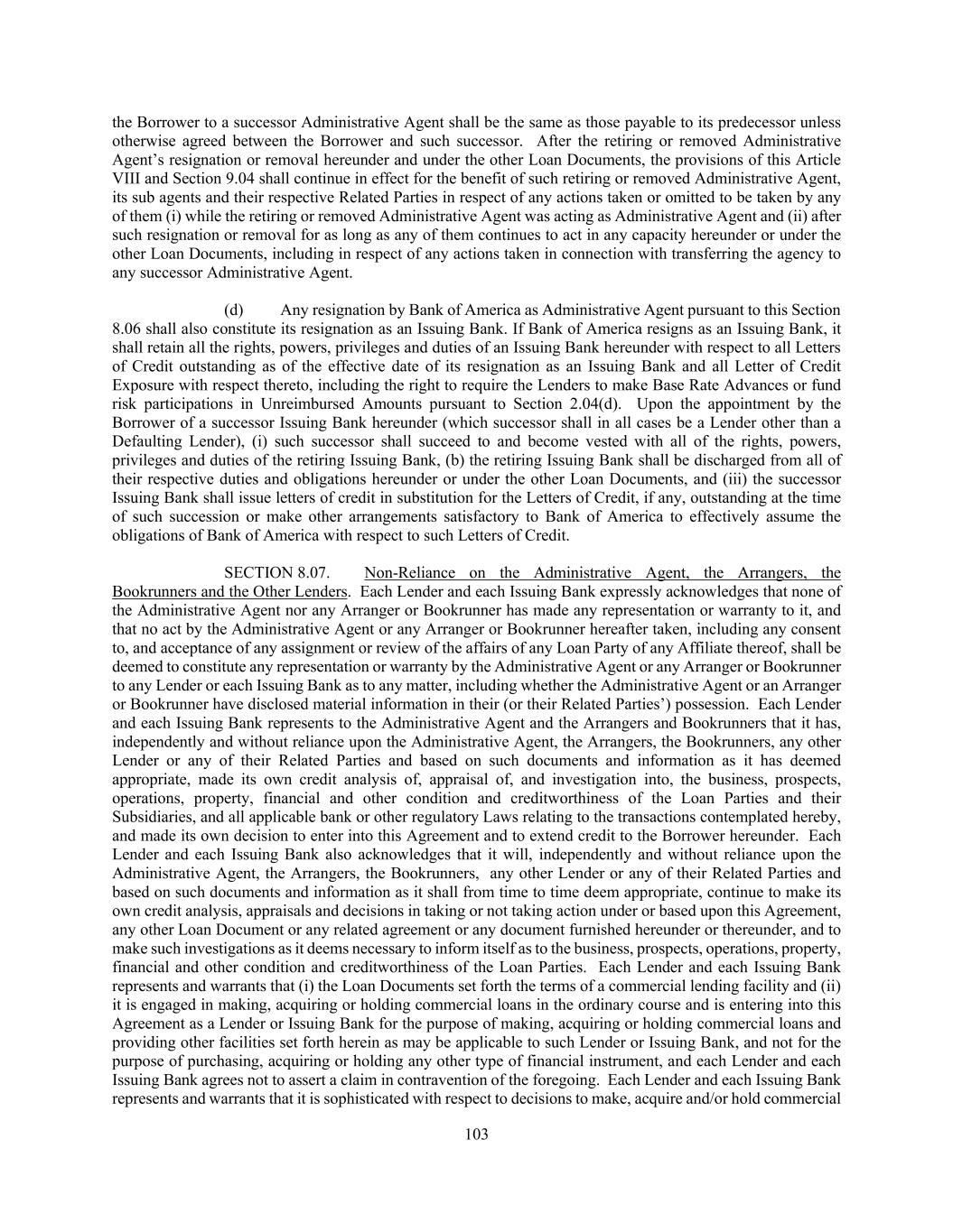 103 the Borrower to a successor Administrative Agent shall be the same as those payable to its predecessor unless otherwise agreed between the Borrower and such successor. After the retiring or removed Administrative Agent’s resignation or removal hereunder and under the other Loan Documents, the provisions of this Article VIII and Section 9.04 shall continue in effect for the benefit of such retiring or removed Administrative Agent, its sub agents and their respective Related Parties in respect of any actions taken or omitted to be taken by any of them (i) while the retiring or removed Administrative Agent was acting as Administrative Agent and (ii) after such resignation or removal for as long as any of them continues to act in any capacity hereunder or under the other Loan Documents, including in respect of any actions taken in connection with transferring the agency to any successor Administrative Agent. (d) Any resignation by Bank of America as Administrative Agent pursuant to this Section 8.06 shall also constitute its resignation as an Issuing Bank. If Bank of America resigns as an Issuing Bank, it shall retain all the rights, powers, privileges and duties of an Issuing Bank hereunder with respect to all Letters of Credit outstanding as of the effective date of its resignation as an Issuing Bank and all Letter of Credit Exposure with respect thereto, including the right to require the Lenders to make Base Rate Advances or fund risk participations in Unreimbursed Amounts pursuant to Section 2.04(d). Upon the appointment by the Borrower of a successor Issuing Bank hereunder (which successor shall in all cases be a Lender other than a Defaulting Lender), (i) such successor shall succeed to and become vested with all of the rights, powers, privileges and duties of the retiring Issuing Bank, (b) the retiring Issuing Bank shall be discharged from all of their respective duties and obligations hereunder or under the other Loan Documents, and (iii) the successor Issuing Bank shall issue letters of credit in substitution for the Letters of Credit, if any, outstanding at the time of such succession or make other arrangements satisfactory to Bank of America to effectively assume the obligations of Bank of America with respect to such Letters of Credit. SECTION 8.07. Non-Reliance on the Administrative Agent, the Arrangers, the Bookrunners and the Other Lenders. Each Lender and each Issuing Bank expressly acknowledges that none of the Administrative Agent nor any Arranger or Bookrunner has made any representation or warranty to it, and that no act by the Administrative Agent or any Arranger or Bookrunner hereafter taken, including any consent to, and acceptance of any assignment or review of the affairs of any Loan Party of any Affiliate thereof, shall be deemed to constitute any representation or warranty by the Administrative Agent or any Arranger or Bookrunner to any Lender or each Issuing Bank as to any matter, including whether the Administrative Agent or an Arranger or Bookrunner have disclosed material information in their (or their Related Parties’) possession. Each Lender and each Issuing Bank represents to the Administrative Agent and the Arrangers and Bookrunners that it has, independently and without reliance upon the Administrative Agent, the Arrangers, the Bookrunners, any other Lender or any of their Related Parties and based on such documents and information as it has deemed appropriate, made its own credit analysis of, appraisal of, and investigation into, the business, prospects, operations, property, financial and other condition and creditworthiness of the Loan Parties and their Subsidiaries, and all applicable bank or other regulatory Laws relating to the transactions contemplated hereby, and made its own decision to enter into this Agreement and to extend credit to the Borrower hereunder. Each Lender and each Issuing Bank also acknowledges that it will, independently and without reliance upon the Administrative Agent, the Arrangers, the Bookrunners, any other Lender or any of their Related Parties and based on such documents and information as it shall from time to time deem appropriate, continue to make its own credit analysis, appraisals and decisions in taking or not taking action under or based upon this Agreement, any other Loan Document or any related agreement or any document furnished hereunder or thereunder, and to make such investigations as it deems necessary to inform itself as to the business, prospects, operations, property, financial and other condition and creditworthiness of the Loan Parties. Each Lender and each Issuing Bank represents and warrants that (i) the Loan Documents set forth the terms of a commercial lending facility and (ii) it is engaged in making, acquiring or holding commercial loans in the ordinary course and is entering into this Agreement as a Lender or Issuing Bank for the purpose of making, acquiring or holding commercial loans and providing other facilities set forth herein as may be applicable to such Lender or Issuing Bank, and not for the purpose of purchasing, acquiring or holding any other type of financial instrument, and each Lender and each Issuing Bank agrees not to assert a claim in contravention of the foregoing. Each Lender and each Issuing Bank represents and warrants that it is sophisticated with respect to decisions to make, acquire and/or hold commercial