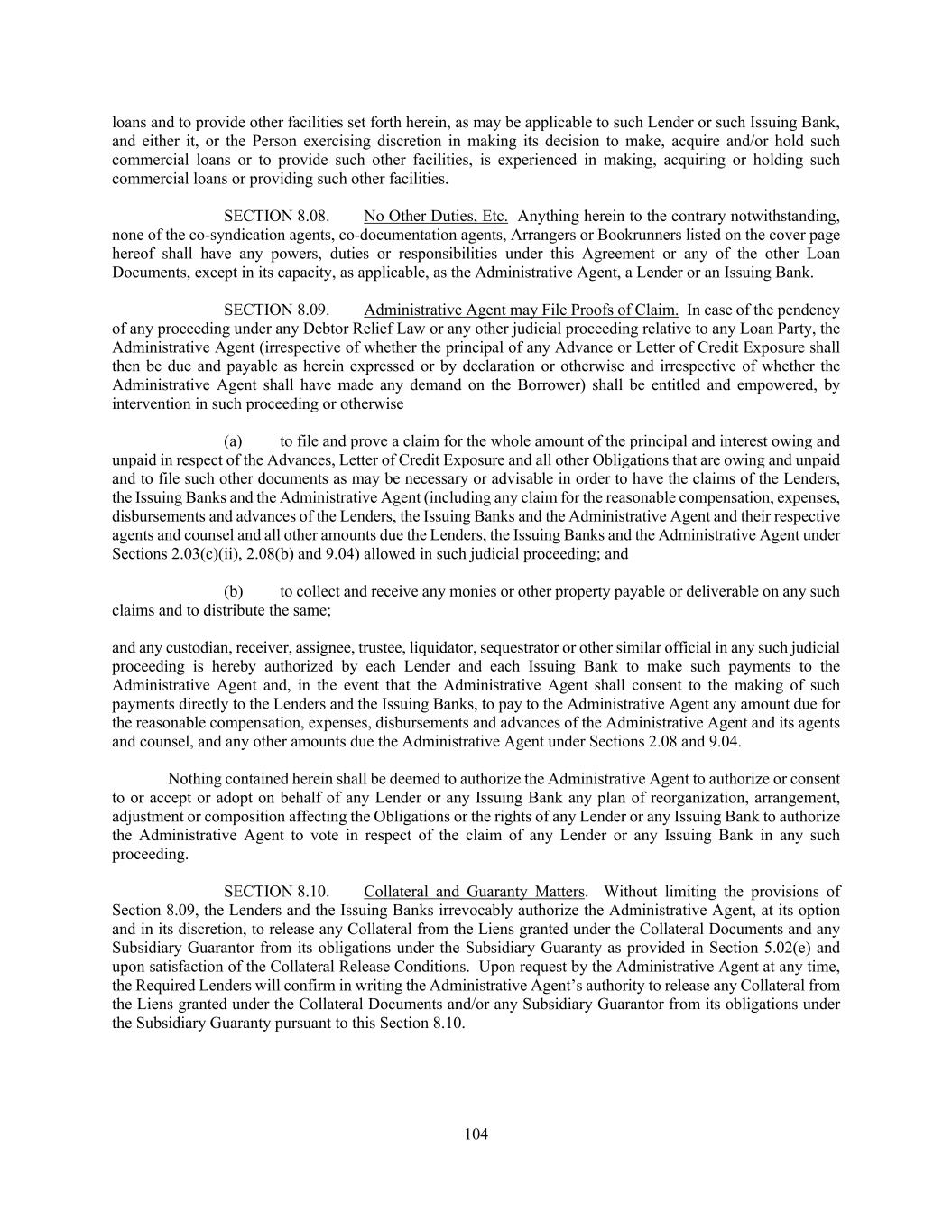 104 loans and to provide other facilities set forth herein, as may be applicable to such Lender or such Issuing Bank, and either it, or the Person exercising discretion in making its decision to make, acquire and/or hold such commercial loans or to provide such other facilities, is experienced in making, acquiring or holding such commercial loans or providing such other facilities. SECTION 8.08. No Other Duties, Etc. Anything herein to the contrary notwithstanding, none of the co-syndication agents, co-documentation agents, Arrangers or Bookrunners listed on the cover page hereof shall have any powers, duties or responsibilities under this Agreement or any of the other Loan Documents, except in its capacity, as applicable, as the Administrative Agent, a Lender or an Issuing Bank. SECTION 8.09. Administrative Agent may File Proofs of Claim. In case of the pendency of any proceeding under any Debtor Relief Law or any other judicial proceeding relative to any Loan Party, the Administrative Agent (irrespective of whether the principal of any Advance or Letter of Credit Exposure shall then be due and payable as herein expressed or by declaration or otherwise and irrespective of whether the Administrative Agent shall have made any demand on the Borrower) shall be entitled and empowered, by intervention in such proceeding or otherwise (a) to file and prove a claim for the whole amount of the principal and interest owing and unpaid in respect of the Advances, Letter of Credit Exposure and all other Obligations that are owing and unpaid and to file such other documents as may be necessary or advisable in order to have the claims of the Lenders, the Issuing Banks and the Administrative Agent (including any claim for the reasonable compensation, expenses, disbursements and advances of the Lenders, the Issuing Banks and the Administrative Agent and their respective agents and counsel and all other amounts due the Lenders, the Issuing Banks and the Administrative Agent under Sections 2.03(c)(ii), 2.08(b) and 9.04) allowed in such judicial proceeding; and (b) to collect and receive any monies or other property payable or deliverable on any such claims and to distribute the same; and any custodian, receiver, assignee, trustee, liquidator, sequestrator or other similar official in any such judicial proceeding is hereby authorized by each Lender and each Issuing Bank to make such payments to the Administrative Agent and, in the event that the Administrative Agent shall consent to the making of such payments directly to the Lenders and the Issuing Banks, to pay to the Administrative Agent any amount due for the reasonable compensation, expenses, disbursements and advances of the Administrative Agent and its agents and counsel, and any other amounts due the Administrative Agent under Sections 2.08 and 9.04. Nothing contained herein shall be deemed to authorize the Administrative Agent to authorize or consent to or accept or adopt on behalf of any Lender or any Issuing Bank any plan of reorganization, arrangement, adjustment or composition affecting the Obligations or the rights of any Lender or any Issuing Bank to authorize the Administrative Agent to vote in respect of the claim of any Lender or any Issuing Bank in any such proceeding. SECTION 8.10. Collateral and Guaranty Matters. Without limiting the provisions of Section 8.09, the Lenders and the Issuing Banks irrevocably authorize the Administrative Agent, at its option and in its discretion, to release any Collateral from the Liens granted under the Collateral Documents and any Subsidiary Guarantor from its obligations under the Subsidiary Guaranty as provided in Section 5.02(e) and upon satisfaction of the Collateral Release Conditions. Upon request by the Administrative Agent at any time, the Required Lenders will confirm in writing the Administrative Agent’s authority to release any Collateral from the Liens granted under the Collateral Documents and/or any Subsidiary Guarantor from its obligations under the Subsidiary Guaranty pursuant to this Section 8.10.