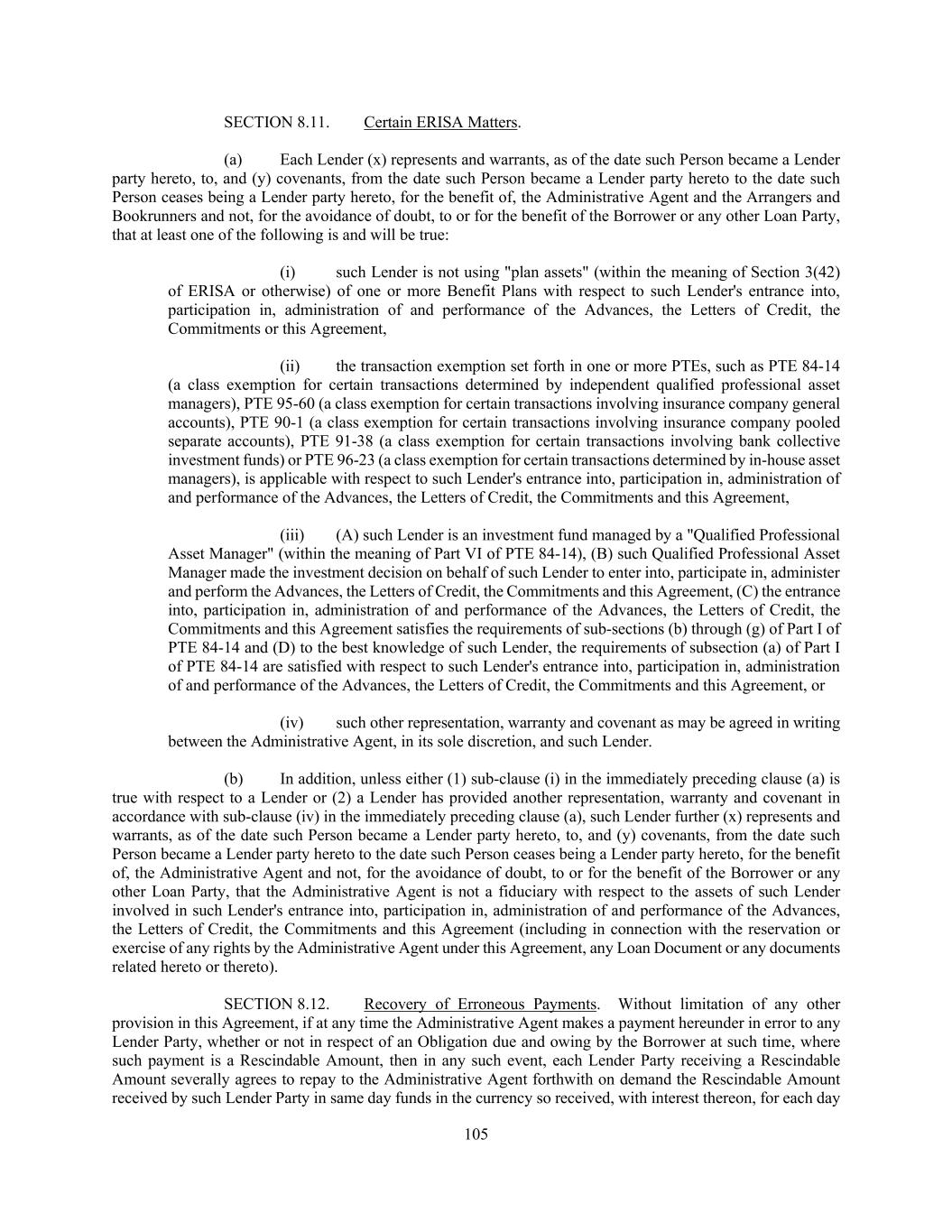 105 SECTION 8.11. Certain ERISA Matters. (a) Each Lender (x) represents and warrants, as of the date such Person became a Lender party hereto, to, and (y) covenants, from the date such Person became a Lender party hereto to the date such Person ceases being a Lender party hereto, for the benefit of, the Administrative Agent and the Arrangers and Bookrunners and not, for the avoidance of doubt, to or for the benefit of the Borrower or any other Loan Party, that at least one of the following is and will be true: (i) such Lender is not using "plan assets" (within the meaning of Section 3(42) of ERISA or otherwise) of one or more Benefit Plans with respect to such Lender's entrance into, participation in, administration of and performance of the Advances, the Letters of Credit, the Commitments or this Agreement, (ii) the transaction exemption set forth in one or more PTEs, such as PTE 84-14 (a class exemption for certain transactions determined by independent qualified professional asset managers), PTE 95-60 (a class exemption for certain transactions involving insurance company general accounts), PTE 90-1 (a class exemption for certain transactions involving insurance company pooled separate accounts), PTE 91-38 (a class exemption for certain transactions involving bank collective investment funds) or PTE 96-23 (a class exemption for certain transactions determined by in-house asset managers), is applicable with respect to such Lender's entrance into, participation in, administration of and performance of the Advances, the Letters of Credit, the Commitments and this Agreement, (iii) (A) such Lender is an investment fund managed by a "Qualified Professional Asset Manager" (within the meaning of Part VI of PTE 84-14), (B) such Qualified Professional Asset Manager made the investment decision on behalf of such Lender to enter into, participate in, administer and perform the Advances, the Letters of Credit, the Commitments and this Agreement, (C) the entrance into, participation in, administration of and performance of the Advances, the Letters of Credit, the Commitments and this Agreement satisfies the requirements of sub-sections (b) through (g) of Part I of PTE 84-14 and (D) to the best knowledge of such Lender, the requirements of subsection (a) of Part I of PTE 84-14 are satisfied with respect to such Lender's entrance into, participation in, administration of and performance of the Advances, the Letters of Credit, the Commitments and this Agreement, or (iv) such other representation, warranty and covenant as may be agreed in writing between the Administrative Agent, in its sole discretion, and such Lender. (b) In addition, unless either (1) sub-clause (i) in the immediately preceding clause (a) is true with respect to a Lender or (2) a Lender has provided another representation, warranty and covenant in accordance with sub-clause (iv) in the immediately preceding clause (a), such Lender further (x) represents and warrants, as of the date such Person became a Lender party hereto, to, and (y) covenants, from the date such Person became a Lender party hereto to the date such Person ceases being a Lender party hereto, for the benefit of, the Administrative Agent and not, for the avoidance of doubt, to or for the benefit of the Borrower or any other Loan Party, that the Administrative Agent is not a fiduciary with respect to the assets of such Lender involved in such Lender's entrance into, participation in, administration of and performance of the Advances, the Letters of Credit, the Commitments and this Agreement (including in connection with the reservation or exercise of any rights by the Administrative Agent under this Agreement, any Loan Document or any documents related hereto or thereto). SECTION 8.12. Recovery of Erroneous Payments. Without limitation of any other provision in this Agreement, if at any time the Administrative Agent makes a payment hereunder in error to any Lender Party, whether or not in respect of an Obligation due and owing by the Borrower at such time, where such payment is a Rescindable Amount, then in any such event, each Lender Party receiving a Rescindable Amount severally agrees to repay to the Administrative Agent forthwith on demand the Rescindable Amount received by such Lender Party in same day funds in the currency so received, with interest thereon, for each day