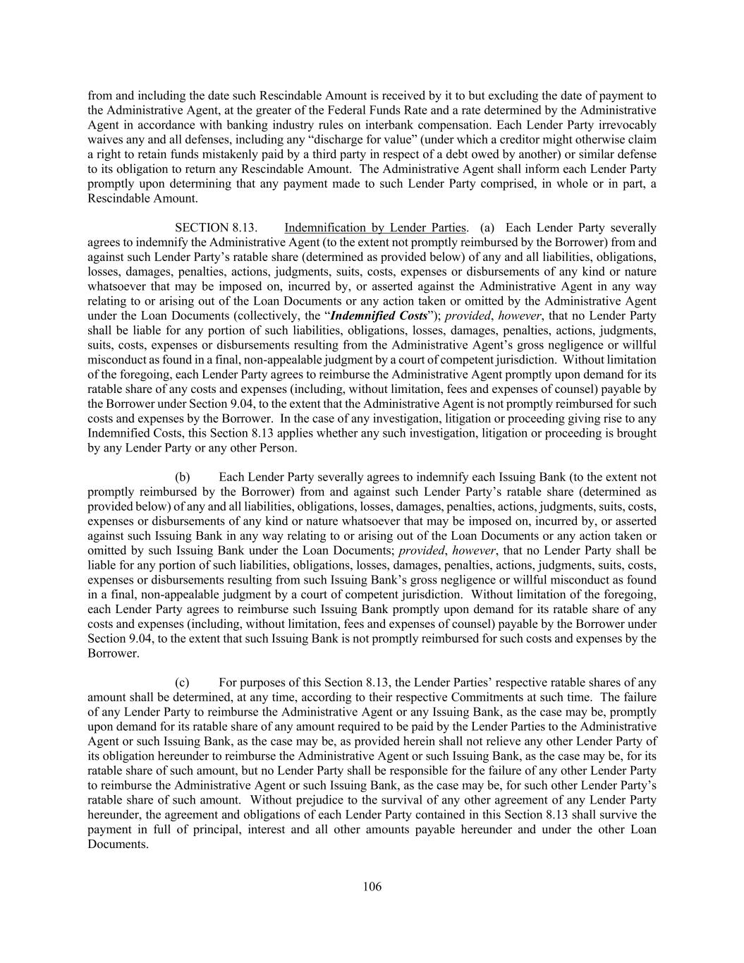 106 from and including the date such Rescindable Amount is received by it to but excluding the date of payment to the Administrative Agent, at the greater of the Federal Funds Rate and a rate determined by the Administrative Agent in accordance with banking industry rules on interbank compensation. Each Lender Party irrevocably waives any and all defenses, including any “discharge for value” (under which a creditor might otherwise claim a right to retain funds mistakenly paid by a third party in respect of a debt owed by another) or similar defense to its obligation to return any Rescindable Amount. The Administrative Agent shall inform each Lender Party promptly upon determining that any payment made to such Lender Party comprised, in whole or in part, a Rescindable Amount. SECTION 8.13. Indemnification by Lender Parties. (a) Each Lender Party severally agrees to indemnify the Administrative Agent (to the extent not promptly reimbursed by the Borrower) from and against such Lender Party’s ratable share (determined as provided below) of any and all liabilities, obligations, losses, damages, penalties, actions, judgments, suits, costs, expenses or disbursements of any kind or nature whatsoever that may be imposed on, incurred by, or asserted against the Administrative Agent in any way relating to or arising out of the Loan Documents or any action taken or omitted by the Administrative Agent under the Loan Documents (collectively, the “Indemnified Costs”); provided, however, that no Lender Party shall be liable for any portion of such liabilities, obligations, losses, damages, penalties, actions, judgments, suits, costs, expenses or disbursements resulting from the Administrative Agent’s gross negligence or willful misconduct as found in a final, non-appealable judgment by a court of competent jurisdiction. Without limitation of the foregoing, each Lender Party agrees to reimburse the Administrative Agent promptly upon demand for its ratable share of any costs and expenses (including, without limitation, fees and expenses of counsel) payable by the Borrower under Section 9.04, to the extent that the Administrative Agent is not promptly reimbursed for such costs and expenses by the Borrower. In the case of any investigation, litigation or proceeding giving rise to any Indemnified Costs, this Section 8.13 applies whether any such investigation, litigation or proceeding is brought by any Lender Party or any other Person. (b) Each Lender Party severally agrees to indemnify each Issuing Bank (to the extent not promptly reimbursed by the Borrower) from and against such Lender Party’s ratable share (determined as provided below) of any and all liabilities, obligations, losses, damages, penalties, actions, judgments, suits, costs, expenses or disbursements of any kind or nature whatsoever that may be imposed on, incurred by, or asserted against such Issuing Bank in any way relating to or arising out of the Loan Documents or any action taken or omitted by such Issuing Bank under the Loan Documents; provided, however, that no Lender Party shall be liable for any portion of such liabilities, obligations, losses, damages, penalties, actions, judgments, suits, costs, expenses or disbursements resulting from such Issuing Bank’s gross negligence or willful misconduct as found in a final, non-appealable judgment by a court of competent jurisdiction. Without limitation of the foregoing, each Lender Party agrees to reimburse such Issuing Bank promptly upon demand for its ratable share of any costs and expenses (including, without limitation, fees and expenses of counsel) payable by the Borrower under Section 9.04, to the extent that such Issuing Bank is not promptly reimbursed for such costs and expenses by the Borrower. (c) For purposes of this Section 8.13, the Lender Parties’ respective ratable shares of any amount shall be determined, at any time, according to their respective Commitments at such time. The failure of any Lender Party to reimburse the Administrative Agent or any Issuing Bank, as the case may be, promptly upon demand for its ratable share of any amount required to be paid by the Lender Parties to the Administrative Agent or such Issuing Bank, as the case may be, as provided herein shall not relieve any other Lender Party of its obligation hereunder to reimburse the Administrative Agent or such Issuing Bank, as the case may be, for its ratable share of such amount, but no Lender Party shall be responsible for the failure of any other Lender Party to reimburse the Administrative Agent or such Issuing Bank, as the case may be, for such other Lender Party’s ratable share of such amount. Without prejudice to the survival of any other agreement of any Lender Party hereunder, the agreement and obligations of each Lender Party contained in this Section 8.13 shall survive the payment in full of principal, interest and all other amounts payable hereunder and under the other Loan Documents.