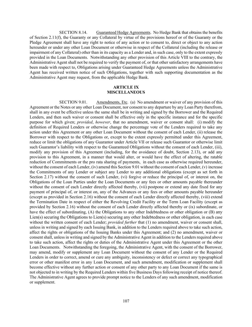 107 SECTION 8.14. Guaranteed Hedge Agreements. No Hedge Bank that obtains the benefits of Section 2.11(f), the Guaranty or any Collateral by virtue of the provisions hereof or of the Guaranty or the Pledge Agreement shall have any right to notice of any action or to consent to, direct or object to any action hereunder or under any other Loan Document or otherwise in respect of the Collateral (including the release or impairment of any Collateral) other than in its capacity as a Lender and, in such case, only to the extent expressly provided in the Loan Documents. Notwithstanding any other provision of this Article VIII to the contrary, the Administrative Agent shall not be required to verify the payment of, or that other satisfactory arrangements have been made with respect to, Obligations arising under Guaranteed Hedge Agreements unless the Administrative Agent has received written notice of such Obligations, together with such supporting documentation as the Administrative Agent may request, from the applicable Hedge Bank. ARTICLE IX MISCELLANEOUS SECTION 9.01. Amendments, Etc. (a) No amendment or waiver of any provision of this Agreement or the Notes or any other Loan Document, nor consent to any departure by any Loan Party therefrom, shall in any event be effective unless the same shall be in writing and signed by the Borrower and the Required Lenders, and then such waiver or consent shall be effective only in the specific instance and for the specific purpose for which given; provided, however, that no amendment, waiver or consent shall: (i) modify the definition of Required Lenders or otherwise change the percentage vote of the Lenders required to take any action under this Agreement or any other Loan Document without the consent of each Lender, (ii) release the Borrower with respect to the Obligations or, except to the extent expressly permitted under this Agreement, reduce or limit the obligations of any Guarantor under Article VII or release such Guarantor or otherwise limit such Guarantor’s liability with respect to the Guaranteed Obligations without the consent of each Lender, (iii), modify any provision of this Agreement (including, for the avoidance of doubt, Section 2.13), or add any provision to this Agreement, in a manner that would alter, or would have the effect of altering, the ratable reduction of Commitments or the pro rata sharing of payments, in each case as otherwise required hereunder, without the consent of each Lender, (iv) amend this Section 9.01 without the consent of each Lender, (v) increase the Commitments of any Lender or subject any Lender to any additional obligations (except as set forth in Section 2.17) without the consent of such Lender, (vi) forgive or reduce the principal of, or interest on, the Obligations of the Loan Parties under the Loan Documents or any fees or other amounts payable thereunder without the consent of each Lender directly affected thereby, (vii) postpone or extend any date fixed for any payment of principal of, or interest on, any of the Advances or any fees or other amounts payable hereunder (except as provided in Section 2.16) without the consent of each Lender directly affected thereby, (viii) extend the Termination Date in respect of either the Revolving Credit Facility or the Term Loan Facility (except as provided by Section 2.16) without the consent of each Lender directly affected thereby or (ix) subordinate, or have the effect of subordinating, (A) the Obligations to any other Indebtedness or other obligation or (B) any Lien(s) securing the Obligations to Lien(s) securing any other Indebtedness or other obligation, in each case without the written consent of each Lender; provided further that (1) no amendment, waiver or consent shall, unless in writing and signed by each Issuing Bank, in addition to the Lenders required above to take such action, affect the rights or obligations of the Issuing Banks under this Agreement; and (2) no amendment, waiver or consent shall, unless in writing and signed by the Administrative Agent in addition to the Lenders required above to take such action, affect the rights or duties of the Administrative Agent under this Agreement or the other Loan Documents. Notwithstanding the foregoing, the Administrative Agent, with the consent of the Borrower, may amend, modify or supplement any Loan Document without the consent of any Lender or the Required Lenders in order to correct, amend or cure any ambiguity, inconsistency or defect or correct any typographical error or other manifest error in any Loan Document, and such amendment, modification or supplement shall become effective without any further action or consent of any other party to any Loan Document if the same is not objected to in writing by the Required Lenders within five Business Days following receipt of notice thereof. The Administrative Agent agrees to provide prompt notice to the Lenders of any such amendment, modification or supplement.