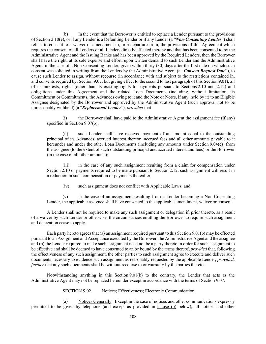 108 (b) In the event that the Borrower is entitled to replace a Lender pursuant to the provisions of Section 2.10(e), or if any Lender is a Defaulting Lender or if any Lender (a “Non-Consenting Lender”) shall refuse to consent to a waiver or amendment to, or a departure from, the provisions of this Agreement which requires the consent of all Lenders or all Lenders directly affected thereby and that has been consented to by the Administrative Agent and the Issuing Banks and has been approved by the Required Lenders, then the Borrower shall have the right, at its sole expense and effort, upon written demand to such Lender and the Administrative Agent, in the case of a Non-Consenting Lender, given within thirty (30) days after the first date on which such consent was solicited in writing from the Lenders by the Administrative Agent (a “Consent Request Date”), to cause such Lender to assign, without recourse (in accordance with and subject to the restrictions contained in, and consents required by, Section 9.07, but giving effect to the second to last paragraph of this Section 9.01), all of its interests, rights (other than its existing rights to payments pursuant to Sections 2.10 and 2.12) and obligations under this Agreement and the related Loan Documents (including, without limitation, its Commitment or Commitments, the Advances owing to it and the Note or Notes, if any, held by it) to an Eligible Assignee designated by the Borrower and approved by the Administrative Agent (such approval not to be unreasonably withheld) (a “Replacement Lender”), provided that (i) the Borrower shall have paid to the Administrative Agent the assignment fee (if any) specified in Section 9.07(b); (ii) such Lender shall have received payment of an amount equal to the outstanding principal of its Advances, accrued interest thereon, accrued fees and all other amounts payable to it hereunder and under the other Loan Documents (including any amounts under Section 9.04(c)) from the assignee (to the extent of such outstanding principal and accrued interest and fees) or the Borrower (in the case of all other amounts); (iii) in the case of any such assignment resulting from a claim for compensation under Section 2.10 or payments required to be made pursuant to Section 2.12, such assignment will result in a reduction in such compensation or payments thereafter; (iv) such assignment does not conflict with Applicable Laws; and (v) in the case of an assignment resulting from a Lender becoming a Non-Consenting Lender, the applicable assignee shall have consented to the applicable amendment, waiver or consent. A Lender shall not be required to make any such assignment or delegation if, prior thereto, as a result of a waiver by such Lender or otherwise, the circumstances entitling the Borrower to require such assignment and delegation cease to apply. Each party hereto agrees that (a) an assignment required pursuant to this Section 9.01(b) may be effected pursuant to an Assignment and Acceptance executed by the Borrower, the Administrative Agent and the assignee and (b) the Lender required to make such assignment need not be a party thereto in order for such assignment to be effective and shall be deemed to have consented to an be bound by the terms thereof; provided that, following the effectiveness of any such assignment, the other parties to such assignment agree to execute and deliver such documents necessary to evidence such assignment as reasonably requested by the applicable Lender, provided, further that any such documents shall be without recourse to or warranty by the parties thereto. Notwithstanding anything in this Section 9.01(b) to the contrary, the Lender that acts as the Administrative Agent may not be replaced hereunder except in accordance with the terms of Section 9.07. SECTION 9.02. Notices; Effectiveness; Electronic Communication. (a) Notices Generally. Except in the case of notices and other communications expressly permitted to be given by telephone (and except as provided in clause (b) below), all notices and other