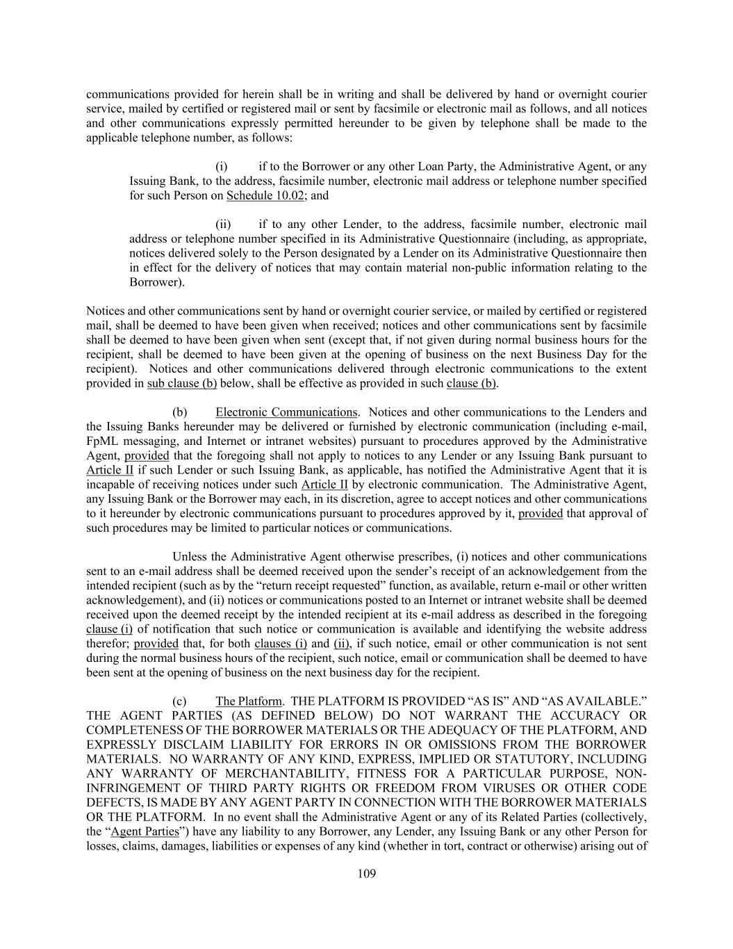109 communications provided for herein shall be in writing and shall be delivered by hand or overnight courier service, mailed by certified or registered mail or sent by facsimile or electronic mail as follows, and all notices and other communications expressly permitted hereunder to be given by telephone shall be made to the applicable telephone number, as follows: (i) if to the Borrower or any other Loan Party, the Administrative Agent, or any Issuing Bank, to the address, facsimile number, electronic mail address or telephone number specified for such Person on Schedule 10.02; and (ii) if to any other Lender, to the address, facsimile number, electronic mail address or telephone number specified in its Administrative Questionnaire (including, as appropriate, notices delivered solely to the Person designated by a Lender on its Administrative Questionnaire then in effect for the delivery of notices that may contain material non-public information relating to the Borrower). Notices and other communications sent by hand or overnight courier service, or mailed by certified or registered mail, shall be deemed to have been given when received; notices and other communications sent by facsimile shall be deemed to have been given when sent (except that, if not given during normal business hours for the recipient, shall be deemed to have been given at the opening of business on the next Business Day for the recipient). Notices and other communications delivered through electronic communications to the extent provided in sub clause (b) below, shall be effective as provided in such clause (b). (b) Electronic Communications. Notices and other communications to the Lenders and the Issuing Banks hereunder may be delivered or furnished by electronic communication (including e-mail, FpML messaging, and Internet or intranet websites) pursuant to procedures approved by the Administrative Agent, provided that the foregoing shall not apply to notices to any Lender or any Issuing Bank pursuant to Article II if such Lender or such Issuing Bank, as applicable, has notified the Administrative Agent that it is incapable of receiving notices under such Article II by electronic communication. The Administrative Agent, any Issuing Bank or the Borrower may each, in its discretion, agree to accept notices and other communications to it hereunder by electronic communications pursuant to procedures approved by it, provided that approval of such procedures may be limited to particular notices or communications. Unless the Administrative Agent otherwise prescribes, (i) notices and other communications sent to an e-mail address shall be deemed received upon the sender’s receipt of an acknowledgement from the intended recipient (such as by the “return receipt requested” function, as available, return e-mail or other written acknowledgement), and (ii) notices or communications posted to an Internet or intranet website shall be deemed received upon the deemed receipt by the intended recipient at its e-mail address as described in the foregoing clause (i) of notification that such notice or communication is available and identifying the website address therefor; provided that, for both clauses (i) and (ii), if such notice, email or other communication is not sent during the normal business hours of the recipient, such notice, email or communication shall be deemed to have been sent at the opening of business on the next business day for the recipient. (c) The Platform. THE PLATFORM IS PROVIDED “AS IS” AND “AS AVAILABLE.” THE AGENT PARTIES (AS DEFINED BELOW) DO NOT WARRANT THE ACCURACY OR COMPLETENESS OF THE BORROWER MATERIALS OR THE ADEQUACY OF THE PLATFORM, AND EXPRESSLY DISCLAIM LIABILITY FOR ERRORS IN OR OMISSIONS FROM THE BORROWER MATERIALS. NO WARRANTY OF ANY KIND, EXPRESS, IMPLIED OR STATUTORY, INCLUDING ANY WARRANTY OF MERCHANTABILITY, FITNESS FOR A PARTICULAR PURPOSE, NON- INFRINGEMENT OF THIRD PARTY RIGHTS OR FREEDOM FROM VIRUSES OR OTHER CODE DEFECTS, IS MADE BY ANY AGENT PARTY IN CONNECTION WITH THE BORROWER MATERIALS OR THE PLATFORM. In no event shall the Administrative Agent or any of its Related Parties (collectively, the “Agent Parties”) have any liability to any Borrower, any Lender, any Issuing Bank or any other Person for losses, claims, damages, liabilities or expenses of any kind (whether in tort, contract or otherwise) arising out of