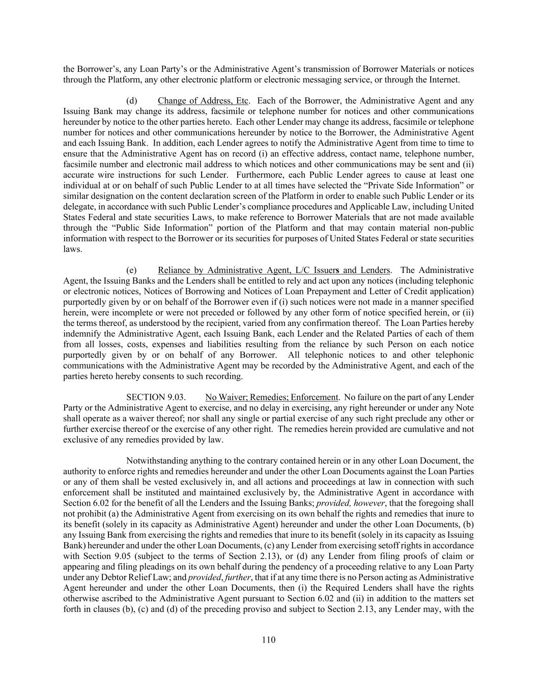 110 the Borrower’s, any Loan Party’s or the Administrative Agent’s transmission of Borrower Materials or notices through the Platform, any other electronic platform or electronic messaging service, or through the Internet. (d) Change of Address, Etc. Each of the Borrower, the Administrative Agent and any Issuing Bank may change its address, facsimile or telephone number for notices and other communications hereunder by notice to the other parties hereto. Each other Lender may change its address, facsimile or telephone number for notices and other communications hereunder by notice to the Borrower, the Administrative Agent and each Issuing Bank. In addition, each Lender agrees to notify the Administrative Agent from time to time to ensure that the Administrative Agent has on record (i) an effective address, contact name, telephone number, facsimile number and electronic mail address to which notices and other communications may be sent and (ii) accurate wire instructions for such Lender. Furthermore, each Public Lender agrees to cause at least one individual at or on behalf of such Public Lender to at all times have selected the “Private Side Information” or similar designation on the content declaration screen of the Platform in order to enable such Public Lender or its delegate, in accordance with such Public Lender’s compliance procedures and Applicable Law, including United States Federal and state securities Laws, to make reference to Borrower Materials that are not made available through the “Public Side Information” portion of the Platform and that may contain material non-public information with respect to the Borrower or its securities for purposes of United States Federal or state securities laws. (e) Reliance by Administrative Agent, L/C Issuers and Lenders. The Administrative Agent, the Issuing Banks and the Lenders shall be entitled to rely and act upon any notices (including telephonic or electronic notices, Notices of Borrowing and Notices of Loan Prepayment and Letter of Credit application) purportedly given by or on behalf of the Borrower even if (i) such notices were not made in a manner specified herein, were incomplete or were not preceded or followed by any other form of notice specified herein, or (ii) the terms thereof, as understood by the recipient, varied from any confirmation thereof. The Loan Parties hereby indemnify the Administrative Agent, each Issuing Bank, each Lender and the Related Parties of each of them from all losses, costs, expenses and liabilities resulting from the reliance by such Person on each notice purportedly given by or on behalf of any Borrower. All telephonic notices to and other telephonic communications with the Administrative Agent may be recorded by the Administrative Agent, and each of the parties hereto hereby consents to such recording. SECTION 9.03. No Waiver; Remedies; Enforcement. No failure on the part of any Lender Party or the Administrative Agent to exercise, and no delay in exercising, any right hereunder or under any Note shall operate as a waiver thereof; nor shall any single or partial exercise of any such right preclude any other or further exercise thereof or the exercise of any other right. The remedies herein provided are cumulative and not exclusive of any remedies provided by law. Notwithstanding anything to the contrary contained herein or in any other Loan Document, the authority to enforce rights and remedies hereunder and under the other Loan Documents against the Loan Parties or any of them shall be vested exclusively in, and all actions and proceedings at law in connection with such enforcement shall be instituted and maintained exclusively by, the Administrative Agent in accordance with Section 6.02 for the benefit of all the Lenders and the Issuing Banks; provided, however, that the foregoing shall not prohibit (a) the Administrative Agent from exercising on its own behalf the rights and remedies that inure to its benefit (solely in its capacity as Administrative Agent) hereunder and under the other Loan Documents, (b) any Issuing Bank from exercising the rights and remedies that inure to its benefit (solely in its capacity as Issuing Bank) hereunder and under the other Loan Documents, (c) any Lender from exercising setoff rights in accordance with Section 9.05 (subject to the terms of Section 2.13), or (d) any Lender from filing proofs of claim or appearing and filing pleadings on its own behalf during the pendency of a proceeding relative to any Loan Party under any Debtor Relief Law; and provided, further, that if at any time there is no Person acting as Administrative Agent hereunder and under the other Loan Documents, then (i) the Required Lenders shall have the rights otherwise ascribed to the Administrative Agent pursuant to Section 6.02 and (ii) in addition to the matters set forth in clauses (b), (c) and (d) of the preceding proviso and subject to Section 2.13, any Lender may, with the