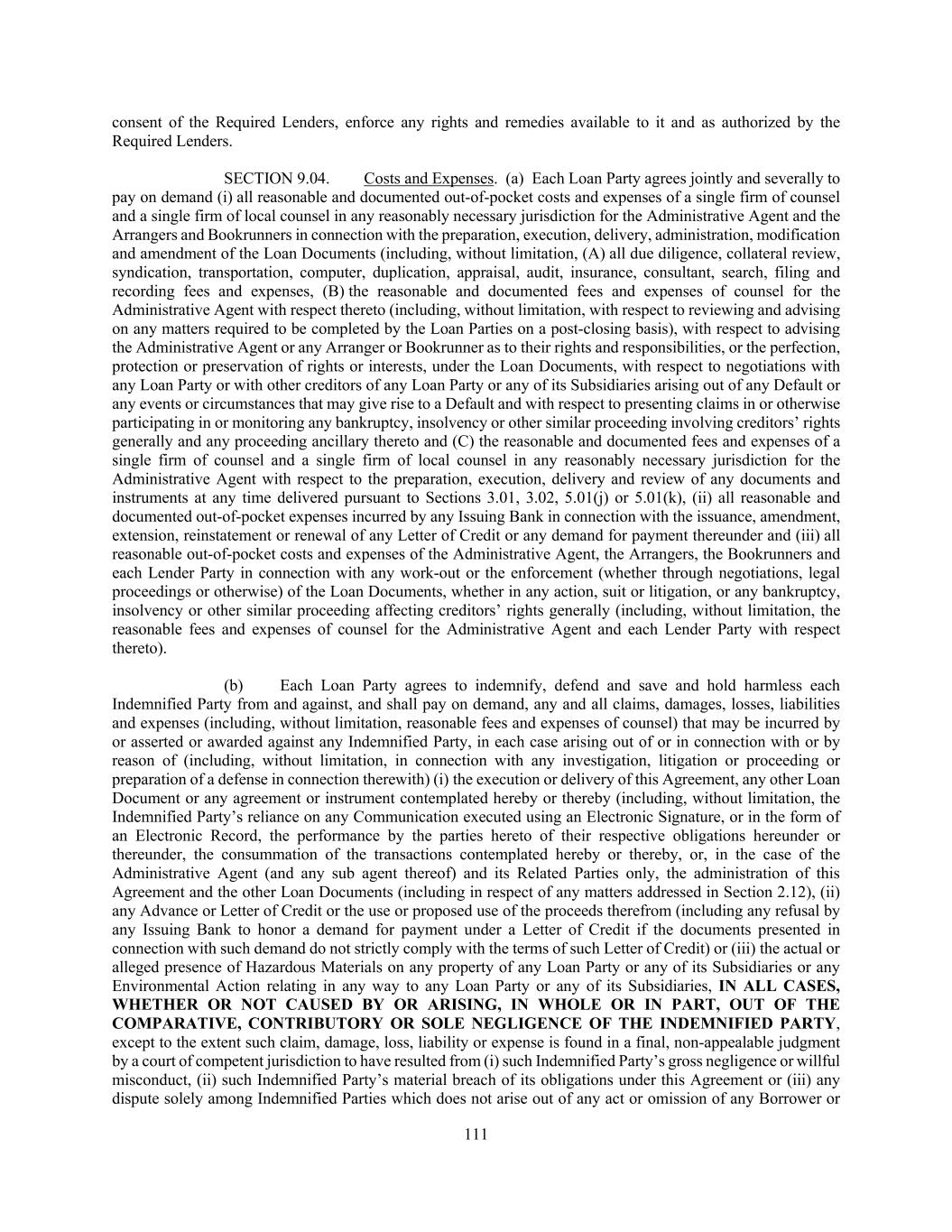 111 consent of the Required Lenders, enforce any rights and remedies available to it and as authorized by the Required Lenders. SECTION 9.04. Costs and Expenses. (a) Each Loan Party agrees jointly and severally to pay on demand (i) all reasonable and documented out-of-pocket costs and expenses of a single firm of counsel and a single firm of local counsel in any reasonably necessary jurisdiction for the Administrative Agent and the Arrangers and Bookrunners in connection with the preparation, execution, delivery, administration, modification and amendment of the Loan Documents (including, without limitation, (A) all due diligence, collateral review, syndication, transportation, computer, duplication, appraisal, audit, insurance, consultant, search, filing and recording fees and expenses, (B) the reasonable and documented fees and expenses of counsel for the Administrative Agent with respect thereto (including, without limitation, with respect to reviewing and advising on any matters required to be completed by the Loan Parties on a post-closing basis), with respect to advising the Administrative Agent or any Arranger or Bookrunner as to their rights and responsibilities, or the perfection, protection or preservation of rights or interests, under the Loan Documents, with respect to negotiations with any Loan Party or with other creditors of any Loan Party or any of its Subsidiaries arising out of any Default or any events or circumstances that may give rise to a Default and with respect to presenting claims in or otherwise participating in or monitoring any bankruptcy, insolvency or other similar proceeding involving creditors’ rights generally and any proceeding ancillary thereto and (C) the reasonable and documented fees and expenses of a single firm of counsel and a single firm of local counsel in any reasonably necessary jurisdiction for the Administrative Agent with respect to the preparation, execution, delivery and review of any documents and instruments at any time delivered pursuant to Sections 3.01, 3.02, 5.01(j) or 5.01(k), (ii) all reasonable and documented out-of-pocket expenses incurred by any Issuing Bank in connection with the issuance, amendment, extension, reinstatement or renewal of any Letter of Credit or any demand for payment thereunder and (iii) all reasonable out-of-pocket costs and expenses of the Administrative Agent, the Arrangers, the Bookrunners and each Lender Party in connection with any work-out or the enforcement (whether through negotiations, legal proceedings or otherwise) of the Loan Documents, whether in any action, suit or litigation, or any bankruptcy, insolvency or other similar proceeding affecting creditors’ rights generally (including, without limitation, the reasonable fees and expenses of counsel for the Administrative Agent and each Lender Party with respect thereto). (b) Each Loan Party agrees to indemnify, defend and save and hold harmless each Indemnified Party from and against, and shall pay on demand, any and all claims, damages, losses, liabilities and expenses (including, without limitation, reasonable fees and expenses of counsel) that may be incurred by or asserted or awarded against any Indemnified Party, in each case arising out of or in connection with or by reason of (including, without limitation, in connection with any investigation, litigation or proceeding or preparation of a defense in connection therewith) (i) the execution or delivery of this Agreement, any other Loan Document or any agreement or instrument contemplated hereby or thereby (including, without limitation, the Indemnified Party’s reliance on any Communication executed using an Electronic Signature, or in the form of an Electronic Record, the performance by the parties hereto of their respective obligations hereunder or thereunder, the consummation of the transactions contemplated hereby or thereby, or, in the case of the Administrative Agent (and any sub agent thereof) and its Related Parties only, the administration of this Agreement and the other Loan Documents (including in respect of any matters addressed in Section 2.12), (ii) any Advance or Letter of Credit or the use or proposed use of the proceeds therefrom (including any refusal by any Issuing Bank to honor a demand for payment under a Letter of Credit if the documents presented in connection with such demand do not strictly comply with the terms of such Letter of Credit) or (iii) the actual or alleged presence of Hazardous Materials on any property of any Loan Party or any of its Subsidiaries or any Environmental Action relating in any way to any Loan Party or any of its Subsidiaries, IN ALL CASES, WHETHER OR NOT CAUSED BY OR ARISING, IN WHOLE OR IN PART, OUT OF THE COMPARATIVE, CONTRIBUTORY OR SOLE NEGLIGENCE OF THE INDEMNIFIED PARTY, except to the extent such claim, damage, loss, liability or expense is found in a final, non-appealable judgment by a court of competent jurisdiction to have resulted from (i) such Indemnified Party’s gross negligence or willful misconduct, (ii) such Indemnified Party’s material breach of its obligations under this Agreement or (iii) any dispute solely among Indemnified Parties which does not arise out of any act or omission of any Borrower or