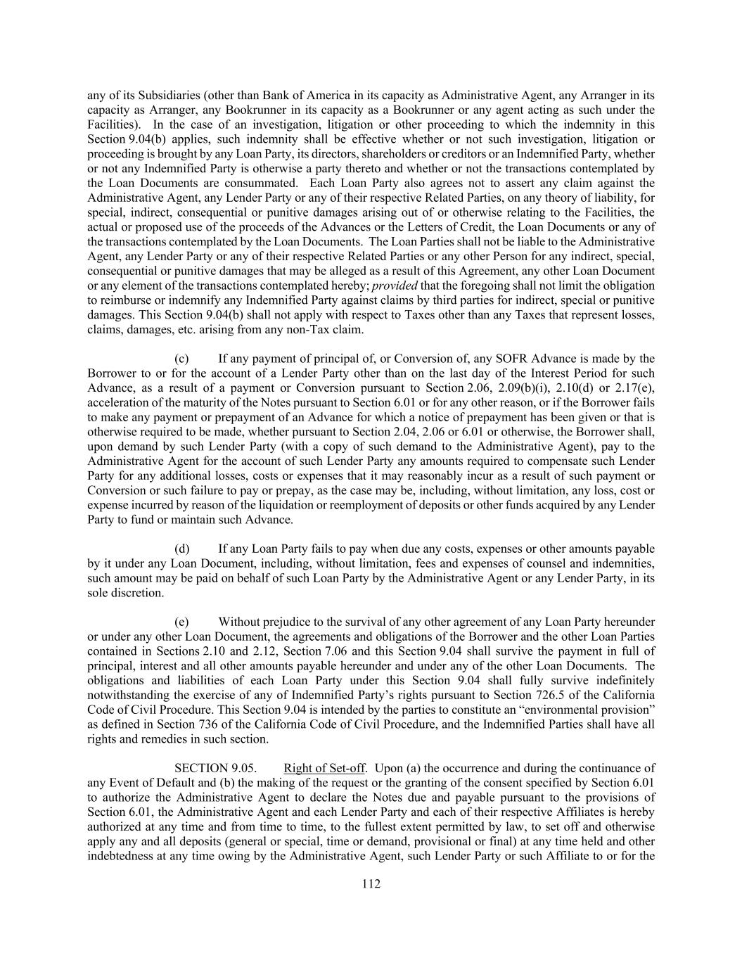 112 any of its Subsidiaries (other than Bank of America in its capacity as Administrative Agent, any Arranger in its capacity as Arranger, any Bookrunner in its capacity as a Bookrunner or any agent acting as such under the Facilities). In the case of an investigation, litigation or other proceeding to which the indemnity in this Section 9.04(b) applies, such indemnity shall be effective whether or not such investigation, litigation or proceeding is brought by any Loan Party, its directors, shareholders or creditors or an Indemnified Party, whether or not any Indemnified Party is otherwise a party thereto and whether or not the transactions contemplated by the Loan Documents are consummated. Each Loan Party also agrees not to assert any claim against the Administrative Agent, any Lender Party or any of their respective Related Parties, on any theory of liability, for special, indirect, consequential or punitive damages arising out of or otherwise relating to the Facilities, the actual or proposed use of the proceeds of the Advances or the Letters of Credit, the Loan Documents or any of the transactions contemplated by the Loan Documents. The Loan Parties shall not be liable to the Administrative Agent, any Lender Party or any of their respective Related Parties or any other Person for any indirect, special, consequential or punitive damages that may be alleged as a result of this Agreement, any other Loan Document or any element of the transactions contemplated hereby; provided that the foregoing shall not limit the obligation to reimburse or indemnify any Indemnified Party against claims by third parties for indirect, special or punitive damages. This Section 9.04(b) shall not apply with respect to Taxes other than any Taxes that represent losses, claims, damages, etc. arising from any non-Tax claim. (c) If any payment of principal of, or Conversion of, any SOFR Advance is made by the Borrower to or for the account of a Lender Party other than on the last day of the Interest Period for such Advance, as a result of a payment or Conversion pursuant to Section 2.06, 2.09(b)(i), 2.10(d) or 2.17(e), acceleration of the maturity of the Notes pursuant to Section 6.01 or for any other reason, or if the Borrower fails to make any payment or prepayment of an Advance for which a notice of prepayment has been given or that is otherwise required to be made, whether pursuant to Section 2.04, 2.06 or 6.01 or otherwise, the Borrower shall, upon demand by such Lender Party (with a copy of such demand to the Administrative Agent), pay to the Administrative Agent for the account of such Lender Party any amounts required to compensate such Lender Party for any additional losses, costs or expenses that it may reasonably incur as a result of such payment or Conversion or such failure to pay or prepay, as the case may be, including, without limitation, any loss, cost or expense incurred by reason of the liquidation or reemployment of deposits or other funds acquired by any Lender Party to fund or maintain such Advance. (d) If any Loan Party fails to pay when due any costs, expenses or other amounts payable by it under any Loan Document, including, without limitation, fees and expenses of counsel and indemnities, such amount may be paid on behalf of such Loan Party by the Administrative Agent or any Lender Party, in its sole discretion. (e) Without prejudice to the survival of any other agreement of any Loan Party hereunder or under any other Loan Document, the agreements and obligations of the Borrower and the other Loan Parties contained in Sections 2.10 and 2.12, Section 7.06 and this Section 9.04 shall survive the payment in full of principal, interest and all other amounts payable hereunder and under any of the other Loan Documents. The obligations and liabilities of each Loan Party under this Section 9.04 shall fully survive indefinitely notwithstanding the exercise of any of Indemnified Party’s rights pursuant to Section 726.5 of the California Code of Civil Procedure. This Section 9.04 is intended by the parties to constitute an “environmental provision” as defined in Section 736 of the California Code of Civil Procedure, and the Indemnified Parties shall have all rights and remedies in such section. SECTION 9.05. Right of Set-off. Upon (a) the occurrence and during the continuance of any Event of Default and (b) the making of the request or the granting of the consent specified by Section 6.01 to authorize the Administrative Agent to declare the Notes due and payable pursuant to the provisions of Section 6.01, the Administrative Agent and each Lender Party and each of their respective Affiliates is hereby authorized at any time and from time to time, to the fullest extent permitted by law, to set off and otherwise apply any and all deposits (general or special, time or demand, provisional or final) at any time held and other indebtedness at any time owing by the Administrative Agent, such Lender Party or such Affiliate to or for the