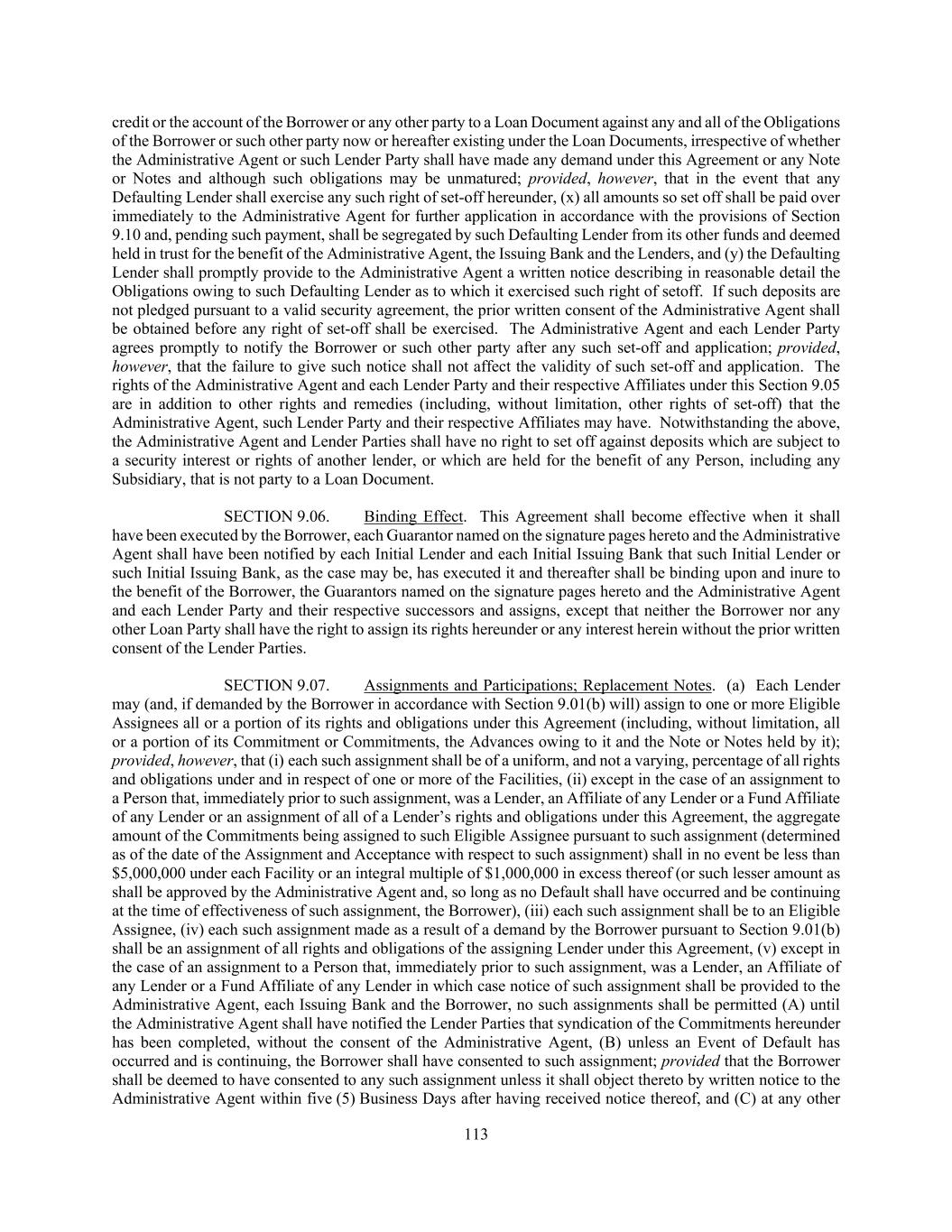 113 credit or the account of the Borrower or any other party to a Loan Document against any and all of the Obligations of the Borrower or such other party now or hereafter existing under the Loan Documents, irrespective of whether the Administrative Agent or such Lender Party shall have made any demand under this Agreement or any Note or Notes and although such obligations may be unmatured; provided, however, that in the event that any Defaulting Lender shall exercise any such right of set-off hereunder, (x) all amounts so set off shall be paid over immediately to the Administrative Agent for further application in accordance with the provisions of Section 9.10 and, pending such payment, shall be segregated by such Defaulting Lender from its other funds and deemed held in trust for the benefit of the Administrative Agent, the Issuing Bank and the Lenders, and (y) the Defaulting Lender shall promptly provide to the Administrative Agent a written notice describing in reasonable detail the Obligations owing to such Defaulting Lender as to which it exercised such right of setoff. If such deposits are not pledged pursuant to a valid security agreement, the prior written consent of the Administrative Agent shall be obtained before any right of set-off shall be exercised. The Administrative Agent and each Lender Party agrees promptly to notify the Borrower or such other party after any such set-off and application; provided, however, that the failure to give such notice shall not affect the validity of such set-off and application. The rights of the Administrative Agent and each Lender Party and their respective Affiliates under this Section 9.05 are in addition to other rights and remedies (including, without limitation, other rights of set-off) that the Administrative Agent, such Lender Party and their respective Affiliates may have. Notwithstanding the above, the Administrative Agent and Lender Parties shall have no right to set off against deposits which are subject to a security interest or rights of another lender, or which are held for the benefit of any Person, including any Subsidiary, that is not party to a Loan Document. SECTION 9.06. Binding Effect. This Agreement shall become effective when it shall have been executed by the Borrower, each Guarantor named on the signature pages hereto and the Administrative Agent shall have been notified by each Initial Lender and each Initial Issuing Bank that such Initial Lender or such Initial Issuing Bank, as the case may be, has executed it and thereafter shall be binding upon and inure to the benefit of the Borrower, the Guarantors named on the signature pages hereto and the Administrative Agent and each Lender Party and their respective successors and assigns, except that neither the Borrower nor any other Loan Party shall have the right to assign its rights hereunder or any interest herein without the prior written consent of the Lender Parties. SECTION 9.07. Assignments and Participations; Replacement Notes. (a) Each Lender may (and, if demanded by the Borrower in accordance with Section 9.01(b) will) assign to one or more Eligible Assignees all or a portion of its rights and obligations under this Agreement (including, without limitation, all or a portion of its Commitment or Commitments, the Advances owing to it and the Note or Notes held by it); provided, however, that (i) each such assignment shall be of a uniform, and not a varying, percentage of all rights and obligations under and in respect of one or more of the Facilities, (ii) except in the case of an assignment to a Person that, immediately prior to such assignment, was a Lender, an Affiliate of any Lender or a Fund Affiliate of any Lender or an assignment of all of a Lender’s rights and obligations under this Agreement, the aggregate amount of the Commitments being assigned to such Eligible Assignee pursuant to such assignment (determined as of the date of the Assignment and Acceptance with respect to such assignment) shall in no event be less than $5,000,000 under each Facility or an integral multiple of $1,000,000 in excess thereof (or such lesser amount as shall be approved by the Administrative Agent and, so long as no Default shall have occurred and be continuing at the time of effectiveness of such assignment, the Borrower), (iii) each such assignment shall be to an Eligible Assignee, (iv) each such assignment made as a result of a demand by the Borrower pursuant to Section 9.01(b) shall be an assignment of all rights and obligations of the assigning Lender under this Agreement, (v) except in the case of an assignment to a Person that, immediately prior to such assignment, was a Lender, an Affiliate of any Lender or a Fund Affiliate of any Lender in which case notice of such assignment shall be provided to the Administrative Agent, each Issuing Bank and the Borrower, no such assignments shall be permitted (A) until the Administrative Agent shall have notified the Lender Parties that syndication of the Commitments hereunder has been completed, without the consent of the Administrative Agent, (B) unless an Event of Default has occurred and is continuing, the Borrower shall have consented to such assignment; provided that the Borrower shall be deemed to have consented to any such assignment unless it shall object thereto by written notice to the Administrative Agent within five (5) Business Days after having received notice thereof, and (C) at any other