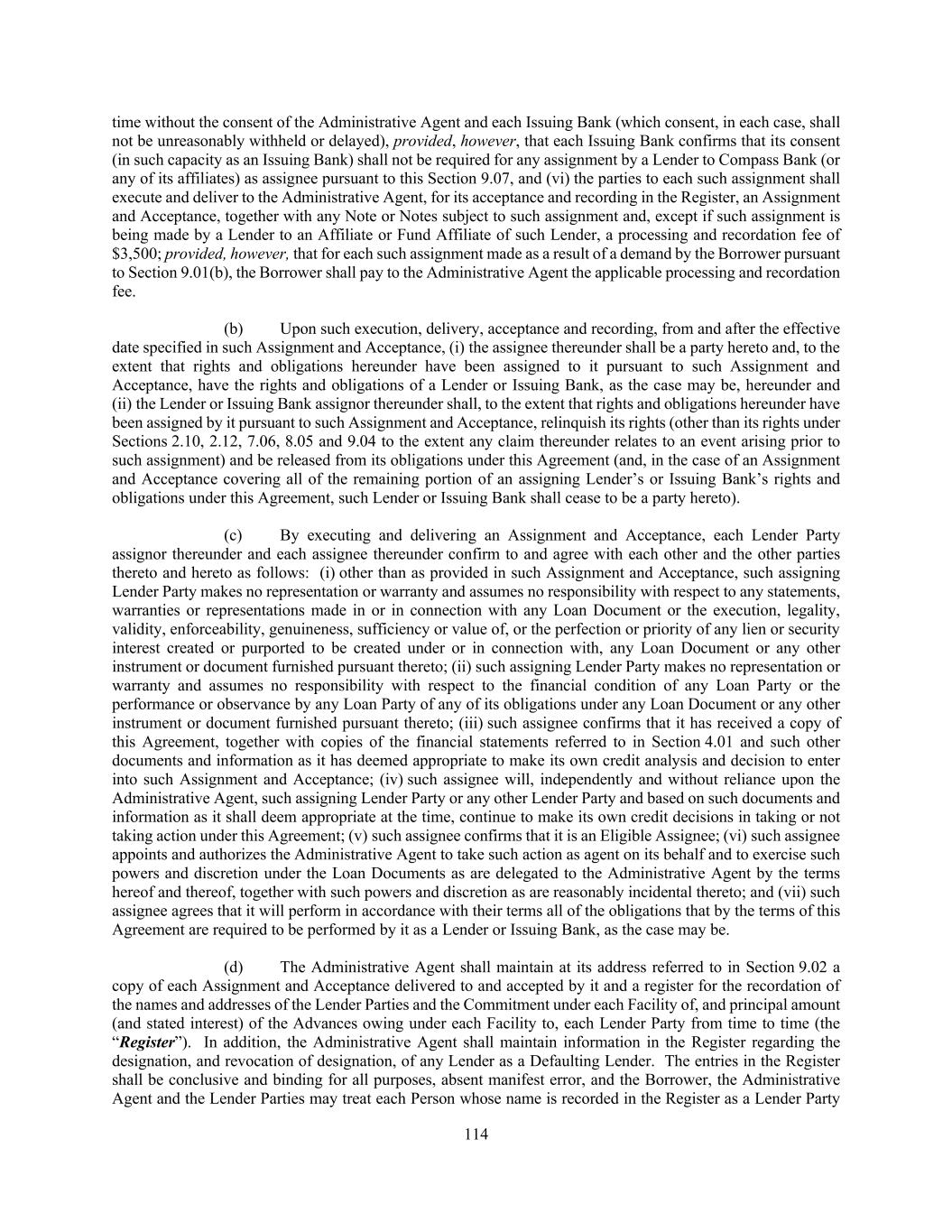 114 time without the consent of the Administrative Agent and each Issuing Bank (which consent, in each case, shall not be unreasonably withheld or delayed), provided, however, that each Issuing Bank confirms that its consent (in such capacity as an Issuing Bank) shall not be required for any assignment by a Lender to Compass Bank (or any of its affiliates) as assignee pursuant to this Section 9.07, and (vi) the parties to each such assignment shall execute and deliver to the Administrative Agent, for its acceptance and recording in the Register, an Assignment and Acceptance, together with any Note or Notes subject to such assignment and, except if such assignment is being made by a Lender to an Affiliate or Fund Affiliate of such Lender, a processing and recordation fee of $3,500; provided, however, that for each such assignment made as a result of a demand by the Borrower pursuant to Section 9.01(b), the Borrower shall pay to the Administrative Agent the applicable processing and recordation fee. (b) Upon such execution, delivery, acceptance and recording, from and after the effective date specified in such Assignment and Acceptance, (i) the assignee thereunder shall be a party hereto and, to the extent that rights and obligations hereunder have been assigned to it pursuant to such Assignment and Acceptance, have the rights and obligations of a Lender or Issuing Bank, as the case may be, hereunder and (ii) the Lender or Issuing Bank assignor thereunder shall, to the extent that rights and obligations hereunder have been assigned by it pursuant to such Assignment and Acceptance, relinquish its rights (other than its rights under Sections 2.10, 2.12, 7.06, 8.05 and 9.04 to the extent any claim thereunder relates to an event arising prior to such assignment) and be released from its obligations under this Agreement (and, in the case of an Assignment and Acceptance covering all of the remaining portion of an assigning Lender’s or Issuing Bank’s rights and obligations under this Agreement, such Lender or Issuing Bank shall cease to be a party hereto). (c) By executing and delivering an Assignment and Acceptance, each Lender Party assignor thereunder and each assignee thereunder confirm to and agree with each other and the other parties thereto and hereto as follows: (i) other than as provided in such Assignment and Acceptance, such assigning Lender Party makes no representation or warranty and assumes no responsibility with respect to any statements, warranties or representations made in or in connection with any Loan Document or the execution, legality, validity, enforceability, genuineness, sufficiency or value of, or the perfection or priority of any lien or security interest created or purported to be created under or in connection with, any Loan Document or any other instrument or document furnished pursuant thereto; (ii) such assigning Lender Party makes no representation or warranty and assumes no responsibility with respect to the financial condition of any Loan Party or the performance or observance by any Loan Party of any of its obligations under any Loan Document or any other instrument or document furnished pursuant thereto; (iii) such assignee confirms that it has received a copy of this Agreement, together with copies of the financial statements referred to in Section 4.01 and such other documents and information as it has deemed appropriate to make its own credit analysis and decision to enter into such Assignment and Acceptance; (iv) such assignee will, independently and without reliance upon the Administrative Agent, such assigning Lender Party or any other Lender Party and based on such documents and information as it shall deem appropriate at the time, continue to make its own credit decisions in taking or not taking action under this Agreement; (v) such assignee confirms that it is an Eligible Assignee; (vi) such assignee appoints and authorizes the Administrative Agent to take such action as agent on its behalf and to exercise such powers and discretion under the Loan Documents as are delegated to the Administrative Agent by the terms hereof and thereof, together with such powers and discretion as are reasonably incidental thereto; and (vii) such assignee agrees that it will perform in accordance with their terms all of the obligations that by the terms of this Agreement are required to be performed by it as a Lender or Issuing Bank, as the case may be. (d) The Administrative Agent shall maintain at its address referred to in Section 9.02 a copy of each Assignment and Acceptance delivered to and accepted by it and a register for the recordation of the names and addresses of the Lender Parties and the Commitment under each Facility of, and principal amount (and stated interest) of the Advances owing under each Facility to, each Lender Party from time to time (the “Register”). In addition, the Administrative Agent shall maintain information in the Register regarding the designation, and revocation of designation, of any Lender as a Defaulting Lender. The entries in the Register shall be conclusive and binding for all purposes, absent manifest error, and the Borrower, the Administrative Agent and the Lender Parties may treat each Person whose name is recorded in the Register as a Lender Party