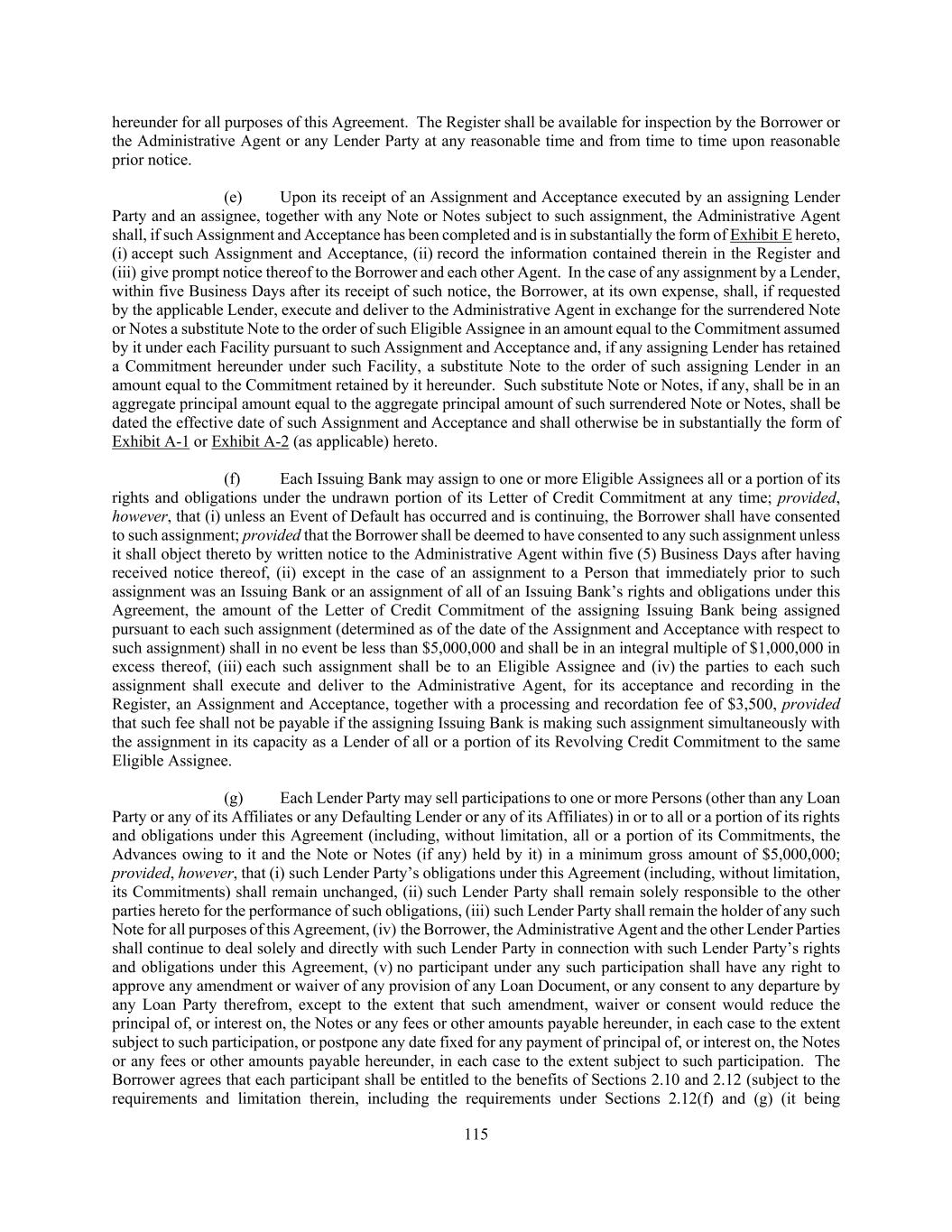 115 hereunder for all purposes of this Agreement. The Register shall be available for inspection by the Borrower or the Administrative Agent or any Lender Party at any reasonable time and from time to time upon reasonable prior notice. (e) Upon its receipt of an Assignment and Acceptance executed by an assigning Lender Party and an assignee, together with any Note or Notes subject to such assignment, the Administrative Agent shall, if such Assignment and Acceptance has been completed and is in substantially the form of Exhibit E hereto, (i) accept such Assignment and Acceptance, (ii) record the information contained therein in the Register and (iii) give prompt notice thereof to the Borrower and each other Agent. In the case of any assignment by a Lender, within five Business Days after its receipt of such notice, the Borrower, at its own expense, shall, if requested by the applicable Lender, execute and deliver to the Administrative Agent in exchange for the surrendered Note or Notes a substitute Note to the order of such Eligible Assignee in an amount equal to the Commitment assumed by it under each Facility pursuant to such Assignment and Acceptance and, if any assigning Lender has retained a Commitment hereunder under such Facility, a substitute Note to the order of such assigning Lender in an amount equal to the Commitment retained by it hereunder. Such substitute Note or Notes, if any, shall be in an aggregate principal amount equal to the aggregate principal amount of such surrendered Note or Notes, shall be dated the effective date of such Assignment and Acceptance and shall otherwise be in substantially the form of Exhibit A-1 or Exhibit A-2 (as applicable) hereto. (f) Each Issuing Bank may assign to one or more Eligible Assignees all or a portion of its rights and obligations under the undrawn portion of its Letter of Credit Commitment at any time; provided, however, that (i) unless an Event of Default has occurred and is continuing, the Borrower shall have consented to such assignment; provided that the Borrower shall be deemed to have consented to any such assignment unless it shall object thereto by written notice to the Administrative Agent within five (5) Business Days after having received notice thereof, (ii) except in the case of an assignment to a Person that immediately prior to such assignment was an Issuing Bank or an assignment of all of an Issuing Bank’s rights and obligations under this Agreement, the amount of the Letter of Credit Commitment of the assigning Issuing Bank being assigned pursuant to each such assignment (determined as of the date of the Assignment and Acceptance with respect to such assignment) shall in no event be less than $5,000,000 and shall be in an integral multiple of $1,000,000 in excess thereof, (iii) each such assignment shall be to an Eligible Assignee and (iv) the parties to each such assignment shall execute and deliver to the Administrative Agent, for its acceptance and recording in the Register, an Assignment and Acceptance, together with a processing and recordation fee of $3,500, provided that such fee shall not be payable if the assigning Issuing Bank is making such assignment simultaneously with the assignment in its capacity as a Lender of all or a portion of its Revolving Credit Commitment to the same Eligible Assignee. (g) Each Lender Party may sell participations to one or more Persons (other than any Loan Party or any of its Affiliates or any Defaulting Lender or any of its Affiliates) in or to all or a portion of its rights and obligations under this Agreement (including, without limitation, all or a portion of its Commitments, the Advances owing to it and the Note or Notes (if any) held by it) in a minimum gross amount of $5,000,000; provided, however, that (i) such Lender Party’s obligations under this Agreement (including, without limitation, its Commitments) shall remain unchanged, (ii) such Lender Party shall remain solely responsible to the other parties hereto for the performance of such obligations, (iii) such Lender Party shall remain the holder of any such Note for all purposes of this Agreement, (iv) the Borrower, the Administrative Agent and the other Lender Parties shall continue to deal solely and directly with such Lender Party in connection with such Lender Party’s rights and obligations under this Agreement, (v) no participant under any such participation shall have any right to approve any amendment or waiver of any provision of any Loan Document, or any consent to any departure by any Loan Party therefrom, except to the extent that such amendment, waiver or consent would reduce the principal of, or interest on, the Notes or any fees or other amounts payable hereunder, in each case to the extent subject to such participation, or postpone any date fixed for any payment of principal of, or interest on, the Notes or any fees or other amounts payable hereunder, in each case to the extent subject to such participation. The Borrower agrees that each participant shall be entitled to the benefits of Sections 2.10 and 2.12 (subject to the requirements and limitation therein, including the requirements under Sections 2.12(f) and (g) (it being