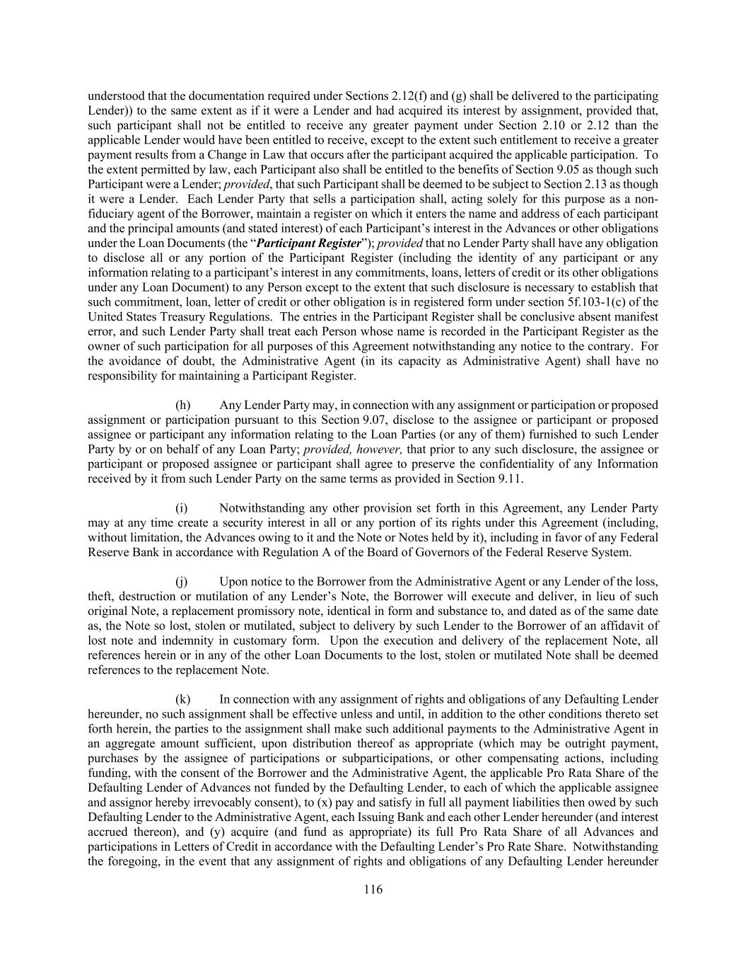 116 understood that the documentation required under Sections 2.12(f) and (g) shall be delivered to the participating Lender)) to the same extent as if it were a Lender and had acquired its interest by assignment, provided that, such participant shall not be entitled to receive any greater payment under Section 2.10 or 2.12 than the applicable Lender would have been entitled to receive, except to the extent such entitlement to receive a greater payment results from a Change in Law that occurs after the participant acquired the applicable participation. To the extent permitted by law, each Participant also shall be entitled to the benefits of Section 9.05 as though such Participant were a Lender; provided, that such Participant shall be deemed to be subject to Section 2.13 as though it were a Lender. Each Lender Party that sells a participation shall, acting solely for this purpose as a non- fiduciary agent of the Borrower, maintain a register on which it enters the name and address of each participant and the principal amounts (and stated interest) of each Participant’s interest in the Advances or other obligations under the Loan Documents (the “Participant Register”); provided that no Lender Party shall have any obligation to disclose all or any portion of the Participant Register (including the identity of any participant or any information relating to a participant’s interest in any commitments, loans, letters of credit or its other obligations under any Loan Document) to any Person except to the extent that such disclosure is necessary to establish that such commitment, loan, letter of credit or other obligation is in registered form under section 5f.103-1(c) of the United States Treasury Regulations. The entries in the Participant Register shall be conclusive absent manifest error, and such Lender Party shall treat each Person whose name is recorded in the Participant Register as the owner of such participation for all purposes of this Agreement notwithstanding any notice to the contrary. For the avoidance of doubt, the Administrative Agent (in its capacity as Administrative Agent) shall have no responsibility for maintaining a Participant Register. (h) Any Lender Party may, in connection with any assignment or participation or proposed assignment or participation pursuant to this Section 9.07, disclose to the assignee or participant or proposed assignee or participant any information relating to the Loan Parties (or any of them) furnished to such Lender Party by or on behalf of any Loan Party; provided, however, that prior to any such disclosure, the assignee or participant or proposed assignee or participant shall agree to preserve the confidentiality of any Information received by it from such Lender Party on the same terms as provided in Section 9.11. (i) Notwithstanding any other provision set forth in this Agreement, any Lender Party may at any time create a security interest in all or any portion of its rights under this Agreement (including, without limitation, the Advances owing to it and the Note or Notes held by it), including in favor of any Federal Reserve Bank in accordance with Regulation A of the Board of Governors of the Federal Reserve System. (j) Upon notice to the Borrower from the Administrative Agent or any Lender of the loss, theft, destruction or mutilation of any Lender’s Note, the Borrower will execute and deliver, in lieu of such original Note, a replacement promissory note, identical in form and substance to, and dated as of the same date as, the Note so lost, stolen or mutilated, subject to delivery by such Lender to the Borrower of an affidavit of lost note and indemnity in customary form. Upon the execution and delivery of the replacement Note, all references herein or in any of the other Loan Documents to the lost, stolen or mutilated Note shall be deemed references to the replacement Note. (k) In connection with any assignment of rights and obligations of any Defaulting Lender hereunder, no such assignment shall be effective unless and until, in addition to the other conditions thereto set forth herein, the parties to the assignment shall make such additional payments to the Administrative Agent in an aggregate amount sufficient, upon distribution thereof as appropriate (which may be outright payment, purchases by the assignee of participations or subparticipations, or other compensating actions, including funding, with the consent of the Borrower and the Administrative Agent, the applicable Pro Rata Share of the Defaulting Lender of Advances not funded by the Defaulting Lender, to each of which the applicable assignee and assignor hereby irrevocably consent), to (x) pay and satisfy in full all payment liabilities then owed by such Defaulting Lender to the Administrative Agent, each Issuing Bank and each other Lender hereunder (and interest accrued thereon), and (y) acquire (and fund as appropriate) its full Pro Rata Share of all Advances and participations in Letters of Credit in accordance with the Defaulting Lender’s Pro Rate Share. Notwithstanding the foregoing, in the event that any assignment of rights and obligations of any Defaulting Lender hereunder
