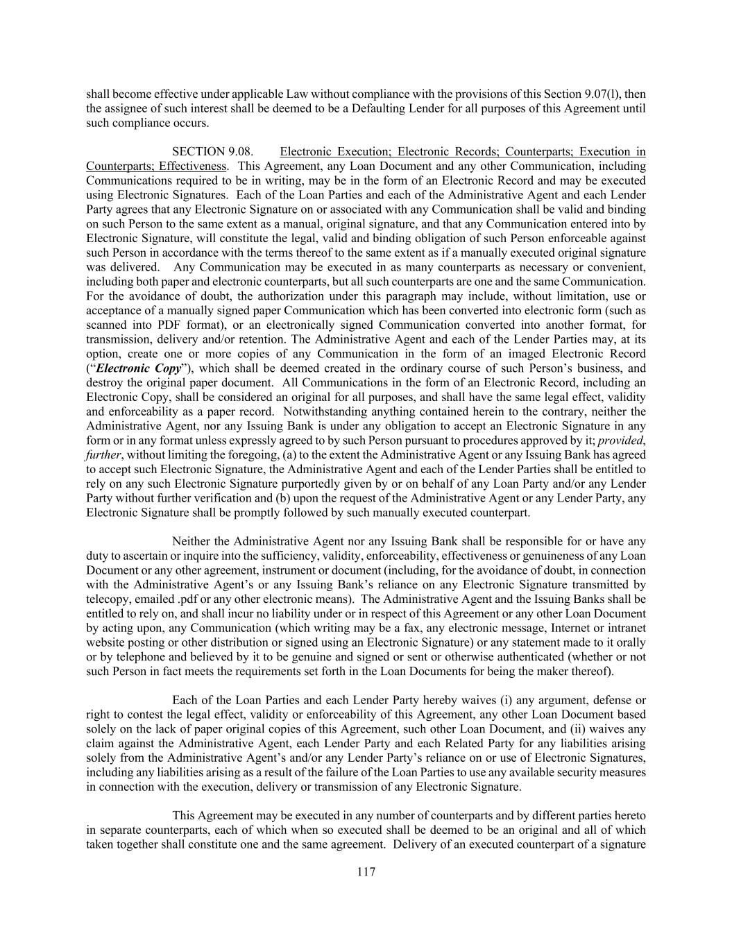 117 shall become effective under applicable Law without compliance with the provisions of this Section 9.07(l), then the assignee of such interest shall be deemed to be a Defaulting Lender for all purposes of this Agreement until such compliance occurs. SECTION 9.08. Electronic Execution; Electronic Records; Counterparts; Execution in Counterparts; Effectiveness. This Agreement, any Loan Document and any other Communication, including Communications required to be in writing, may be in the form of an Electronic Record and may be executed using Electronic Signatures. Each of the Loan Parties and each of the Administrative Agent and each Lender Party agrees that any Electronic Signature on or associated with any Communication shall be valid and binding on such Person to the same extent as a manual, original signature, and that any Communication entered into by Electronic Signature, will constitute the legal, valid and binding obligation of such Person enforceable against such Person in accordance with the terms thereof to the same extent as if a manually executed original signature was delivered. Any Communication may be executed in as many counterparts as necessary or convenient, including both paper and electronic counterparts, but all such counterparts are one and the same Communication. For the avoidance of doubt, the authorization under this paragraph may include, without limitation, use or acceptance of a manually signed paper Communication which has been converted into electronic form (such as scanned into PDF format), or an electronically signed Communication converted into another format, for transmission, delivery and/or retention. The Administrative Agent and each of the Lender Parties may, at its option, create one or more copies of any Communication in the form of an imaged Electronic Record (“Electronic Copy”), which shall be deemed created in the ordinary course of such Person’s business, and destroy the original paper document. All Communications in the form of an Electronic Record, including an Electronic Copy, shall be considered an original for all purposes, and shall have the same legal effect, validity and enforceability as a paper record. Notwithstanding anything contained herein to the contrary, neither the Administrative Agent, nor any Issuing Bank is under any obligation to accept an Electronic Signature in any form or in any format unless expressly agreed to by such Person pursuant to procedures approved by it; provided, further, without limiting the foregoing, (a) to the extent the Administrative Agent or any Issuing Bank has agreed to accept such Electronic Signature, the Administrative Agent and each of the Lender Parties shall be entitled to rely on any such Electronic Signature purportedly given by or on behalf of any Loan Party and/or any Lender Party without further verification and (b) upon the request of the Administrative Agent or any Lender Party, any Electronic Signature shall be promptly followed by such manually executed counterpart. Neither the Administrative Agent nor any Issuing Bank shall be responsible for or have any duty to ascertain or inquire into the sufficiency, validity, enforceability, effectiveness or genuineness of any Loan Document or any other agreement, instrument or document (including, for the avoidance of doubt, in connection with the Administrative Agent’s or any Issuing Bank’s reliance on any Electronic Signature transmitted by telecopy, emailed .pdf or any other electronic means). The Administrative Agent and the Issuing Banks shall be entitled to rely on, and shall incur no liability under or in respect of this Agreement or any other Loan Document by acting upon, any Communication (which writing may be a fax, any electronic message, Internet or intranet website posting or other distribution or signed using an Electronic Signature) or any statement made to it orally or by telephone and believed by it to be genuine and signed or sent or otherwise authenticated (whether or not such Person in fact meets the requirements set forth in the Loan Documents for being the maker thereof). Each of the Loan Parties and each Lender Party hereby waives (i) any argument, defense or right to contest the legal effect, validity or enforceability of this Agreement, any other Loan Document based solely on the lack of paper original copies of this Agreement, such other Loan Document, and (ii) waives any claim against the Administrative Agent, each Lender Party and each Related Party for any liabilities arising solely from the Administrative Agent’s and/or any Lender Party’s reliance on or use of Electronic Signatures, including any liabilities arising as a result of the failure of the Loan Parties to use any available security measures in connection with the execution, delivery or transmission of any Electronic Signature. This Agreement may be executed in any number of counterparts and by different parties hereto in separate counterparts, each of which when so executed shall be deemed to be an original and all of which taken together shall constitute one and the same agreement. Delivery of an executed counterpart of a signature