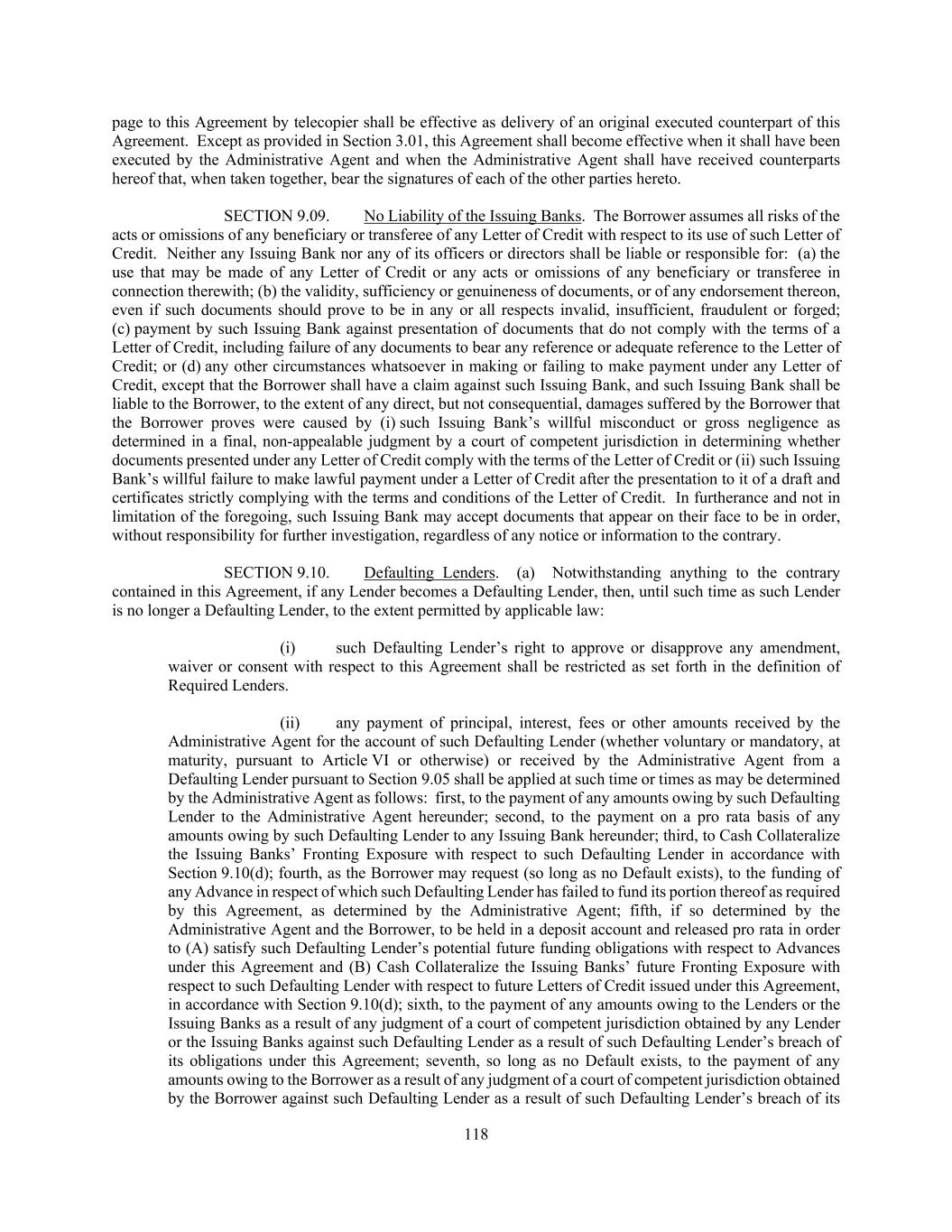 118 page to this Agreement by telecopier shall be effective as delivery of an original executed counterpart of this Agreement. Except as provided in Section 3.01, this Agreement shall become effective when it shall have been executed by the Administrative Agent and when the Administrative Agent shall have received counterparts hereof that, when taken together, bear the signatures of each of the other parties hereto. SECTION 9.09. No Liability of the Issuing Banks. The Borrower assumes all risks of the acts or omissions of any beneficiary or transferee of any Letter of Credit with respect to its use of such Letter of Credit. Neither any Issuing Bank nor any of its officers or directors shall be liable or responsible for: (a) the use that may be made of any Letter of Credit or any acts or omissions of any beneficiary or transferee in connection therewith; (b) the validity, sufficiency or genuineness of documents, or of any endorsement thereon, even if such documents should prove to be in any or all respects invalid, insufficient, fraudulent or forged; (c) payment by such Issuing Bank against presentation of documents that do not comply with the terms of a Letter of Credit, including failure of any documents to bear any reference or adequate reference to the Letter of Credit; or (d) any other circumstances whatsoever in making or failing to make payment under any Letter of Credit, except that the Borrower shall have a claim against such Issuing Bank, and such Issuing Bank shall be liable to the Borrower, to the extent of any direct, but not consequential, damages suffered by the Borrower that the Borrower proves were caused by (i) such Issuing Bank’s willful misconduct or gross negligence as determined in a final, non-appealable judgment by a court of competent jurisdiction in determining whether documents presented under any Letter of Credit comply with the terms of the Letter of Credit or (ii) such Issuing Bank’s willful failure to make lawful payment under a Letter of Credit after the presentation to it of a draft and certificates strictly complying with the terms and conditions of the Letter of Credit. In furtherance and not in limitation of the foregoing, such Issuing Bank may accept documents that appear on their face to be in order, without responsibility for further investigation, regardless of any notice or information to the contrary. SECTION 9.10. Defaulting Lenders. (a) Notwithstanding anything to the contrary contained in this Agreement, if any Lender becomes a Defaulting Lender, then, until such time as such Lender is no longer a Defaulting Lender, to the extent permitted by applicable law: (i) such Defaulting Lender’s right to approve or disapprove any amendment, waiver or consent with respect to this Agreement shall be restricted as set forth in the definition of Required Lenders. (ii) any payment of principal, interest, fees or other amounts received by the Administrative Agent for the account of such Defaulting Lender (whether voluntary or mandatory, at maturity, pursuant to Article VI or otherwise) or received by the Administrative Agent from a Defaulting Lender pursuant to Section 9.05 shall be applied at such time or times as may be determined by the Administrative Agent as follows: first, to the payment of any amounts owing by such Defaulting Lender to the Administrative Agent hereunder; second, to the payment on a pro rata basis of any amounts owing by such Defaulting Lender to any Issuing Bank hereunder; third, to Cash Collateralize the Issuing Banks’ Fronting Exposure with respect to such Defaulting Lender in accordance with Section 9.10(d); fourth, as the Borrower may request (so long as no Default exists), to the funding of any Advance in respect of which such Defaulting Lender has failed to fund its portion thereof as required by this Agreement, as determined by the Administrative Agent; fifth, if so determined by the Administrative Agent and the Borrower, to be held in a deposit account and released pro rata in order to (A) satisfy such Defaulting Lender’s potential future funding obligations with respect to Advances under this Agreement and (B) Cash Collateralize the Issuing Banks’ future Fronting Exposure with respect to such Defaulting Lender with respect to future Letters of Credit issued under this Agreement, in accordance with Section 9.10(d); sixth, to the payment of any amounts owing to the Lenders or the Issuing Banks as a result of any judgment of a court of competent jurisdiction obtained by any Lender or the Issuing Banks against such Defaulting Lender as a result of such Defaulting Lender’s breach of its obligations under this Agreement; seventh, so long as no Default exists, to the payment of any amounts owing to the Borrower as a result of any judgment of a court of competent jurisdiction obtained by the Borrower against such Defaulting Lender as a result of such Defaulting Lender’s breach of its