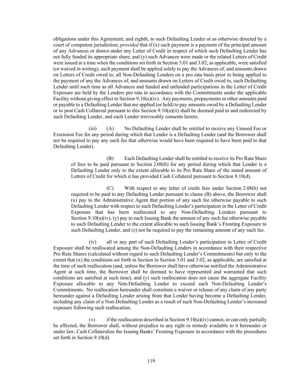 119 obligations under this Agreement; and eighth, to such Defaulting Lender or as otherwise directed by a court of competent jurisdiction; provided that if (x) such payment is a payment of the principal amount of any Advances or drawn under any Letter of Credit in respect of which such Defaulting Lender has not fully funded its appropriate share, and (y) such Advances were made or the related Letters of Credit were issued at a time when the conditions set forth in Section 3.01 and 3.02, as applicable, were satisfied (or waived in writing), such payment shall be applied solely to pay the Advances of, and amounts drawn on Letters of Credit owed to, all Non-Defaulting Lenders on a pro rata basis prior to being applied to the payment of any the Advances of, and amounts drawn on Letters of Credit owed to, such Defaulting Lender until such time as all Advances and funded and unfunded participations in the Letter of Credit Exposure are held by the Lenders pro rata in accordance with the Commitments under the applicable Facility without giving effect to Section 9.10(a)(iv). Any payments, prepayments or other amounts paid or payable to a Defaulting Lender that are applied (or held) to pay amounts owed by a Defaulting Lender or to post Cash Collateral pursuant to this Section 9.10(a)(ii) shall be deemed paid to and redirected by such Defaulting Lender, and each Lender irrevocably consents hereto. (iii) (A) No Defaulting Lender shall be entitled to receive any Unused Fee or Extension Fee for any period during which that Lender is a Defaulting Lender (and the Borrower shall not be required to pay any such fee that otherwise would have been required to have been paid to that Defaulting Lender). (B) Each Defaulting Lender shall be entitled to receive its Pro Rata Share of fees to be paid pursuant to Section 2.08(b) for any period during which that Lender is a Defaulting Lender only to the extent allocable to its Pro Rata Share of the stated amount of Letters of Credit for which it has provided Cash Collateral pursuant to Section 9.10(d). (C) With respect to any letter of credit fees under Section 2.08(b) not required to be paid to any Defaulting Lender pursuant to clause (B) above, the Borrower shall (x) pay to the Administrative Agent that portion of any such fee otherwise payable to such Defaulting Lender with respect to such Defaulting Lender’s participation in the Letter of Credit Exposure that has been reallocated to any Non-Defaulting Lenders pursuant to Section 9.10(a)(iv), (y) pay to each Issuing Bank the amount of any such fee otherwise payable to such Defaulting Lender to the extent allocable to such Issuing Bank’s Fronting Exposure to such Defaulting Lender, and (z) not be required to pay the remaining amount of any such fee. (iv) all or any part of such Defaulting Lender’s participation in Letter of Credit Exposure shall be reallocated among the Non-Defaulting Lenders in accordance with their respective Pro Rata Shares (calculated without regard to such Defaulting Lender’s Commitments) but only to the extent that (x) the conditions set forth in Section in Section 3.01 and 3.02, as applicable, are satisfied at the time of such reallocation (and, unless the Borrower shall have otherwise notified the Administrative Agent at such time, the Borrower shall be deemed to have represented and warranted that such conditions are satisfied at such time), and (y) such reallocation does not cause the aggregate Facility Exposure allocable to any Non-Defaulting Lender to exceed such Non-Defaulting Lender’s Commitments. No reallocation hereunder shall constitute a waiver or release of any claim of any party hereunder against a Defaulting Lender arising from that Lender having become a Defaulting Lender, including any claim of a Non-Defaulting Lender as a result of such Non-Defaulting Lender’s increased exposure following such reallocation. (v) if the reallocation described in Section 9.10(a)(iv) cannot, or can only partially be effected, the Borrower shall, without prejudice to any right or remedy available to it hereunder or under law, Cash Collateralize the Issuing Banks’ Fronting Exposure in accordance with the procedures set forth in Section 9.10(d).