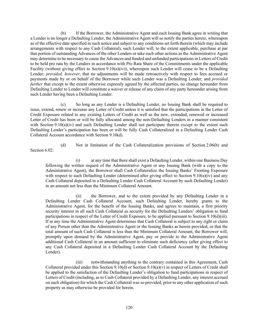 120 (b) If the Borrower, the Administrative Agent and each Issuing Bank agree in writing that a Lender is no longer a Defaulting Lender, the Administrative Agent will so notify the parties hereto, whereupon as of the effective date specified in such notice and subject to any conditions set forth therein (which may include arrangements with respect to any Cash Collateral), such Lender will, to the extent applicable, purchase at par that portion of outstanding Advances of the other Lenders or take such other actions as the Administrative Agent may determine to be necessary to cause the Advances and funded and unfunded participations in Letters of Credit to be held pro rata by the Lenders in accordance with Pro Rata Share of the Commitments under the applicable Facility (without giving effect to Section 9.10(a)(iv)), whereupon such Lender will cease to be a Defaulting Lender; provided, however, that no adjustments will be made retroactively with respect to fees accrued or payments made by or on behalf of the Borrower while such Lender was a Defaulting Lender; and provided further that except to the extent otherwise expressly agreed by the affected parties, no change hereunder from Defaulting Lender to Lender will constitute a waiver or release of any claim of any party hereunder arising from such Lender having been a Defaulting Lender. (c) So long as any Lender is a Defaulting Lender, no Issuing Bank shall be required to issue, extend, renew or increase any Letter of Credit unless it is satisfied that the participations in the Letter of Credit Exposure related to any existing Letters of Credit as well as the new, extended, renewed or increased Letter of Credit has been or will be fully allocated among the non-Defaulting Lenders in a manner consistent with Section 9.10(a)(iv) and such Defaulting Lender shall not participate therein except to the extent such Defaulting Lender’s participation has been or will be fully Cash Collateralized in a Defaulting Lender Cash Collateral Account accordance with Section 9.10(d). (d) Not in limitation of the Cash Collateralization provisions of Section 2.06(b) and Section 6.02: (i) at any time that there shall exist a Defaulting Lender, within one Business Day following the written request of the Administrative Agent or any Issuing Bank (with a copy to the Administrative Agent), the Borrower shall Cash Collateralize the Issuing Banks’ Fronting Exposure with respect to such Defaulting Lender (determined after giving effect to Section 9.10(a)(iv) and any Cash Collateral deposited in a Defaulting Lender Cash Collateral Account by such Defaulting Lender) in an amount not less than the Minimum Collateral Amount. (ii) the Borrower, and to the extent provided by any Defaulting Lender in a Defaulting Lender Cash Collateral Account, such Defaulting Lender, hereby grants to the Administrative Agent, for the benefit of the Issuing Banks, and agrees to maintain, a first priority security interest in all such Cash Collateral as security for the Defaulting Lenders’ obligation to fund participations in respect of the Letter of Credit Exposure, to be applied pursuant to Section 9.10(d)(iii). If at any time the Administrative Agent determines that Cash Collateral is subject to any right or claim of any Person other than the Administrative Agent or the Issuing Banks as herein provided, or that the total amount of such Cash Collateral is less than the Minimum Collateral Amount, the Borrower will, promptly upon demand by the Administrative Agent, pay or provide to the Administrative Agent additional Cash Collateral in an amount sufficient to eliminate such deficiency (after giving effect to any Cash Collateral deposited in a Defaulting Lender Cash Collateral Account by the Defaulting Lender). (iii) notwithstanding anything to the contrary contained in this Agreement, Cash Collateral provided under this Section 9.10(d) or Section 9.10(a)(v) in respect of Letters of Credit shall be applied to the satisfaction of the Defaulting Lender’s obligation to fund participations in respect of Letters of Credit (including, as to Cash Collateral provided by a Defaulting Lender, any interest accrued on such obligation) for which the Cash Collateral was so provided, prior to any other application of such property as may otherwise be provided for herein.