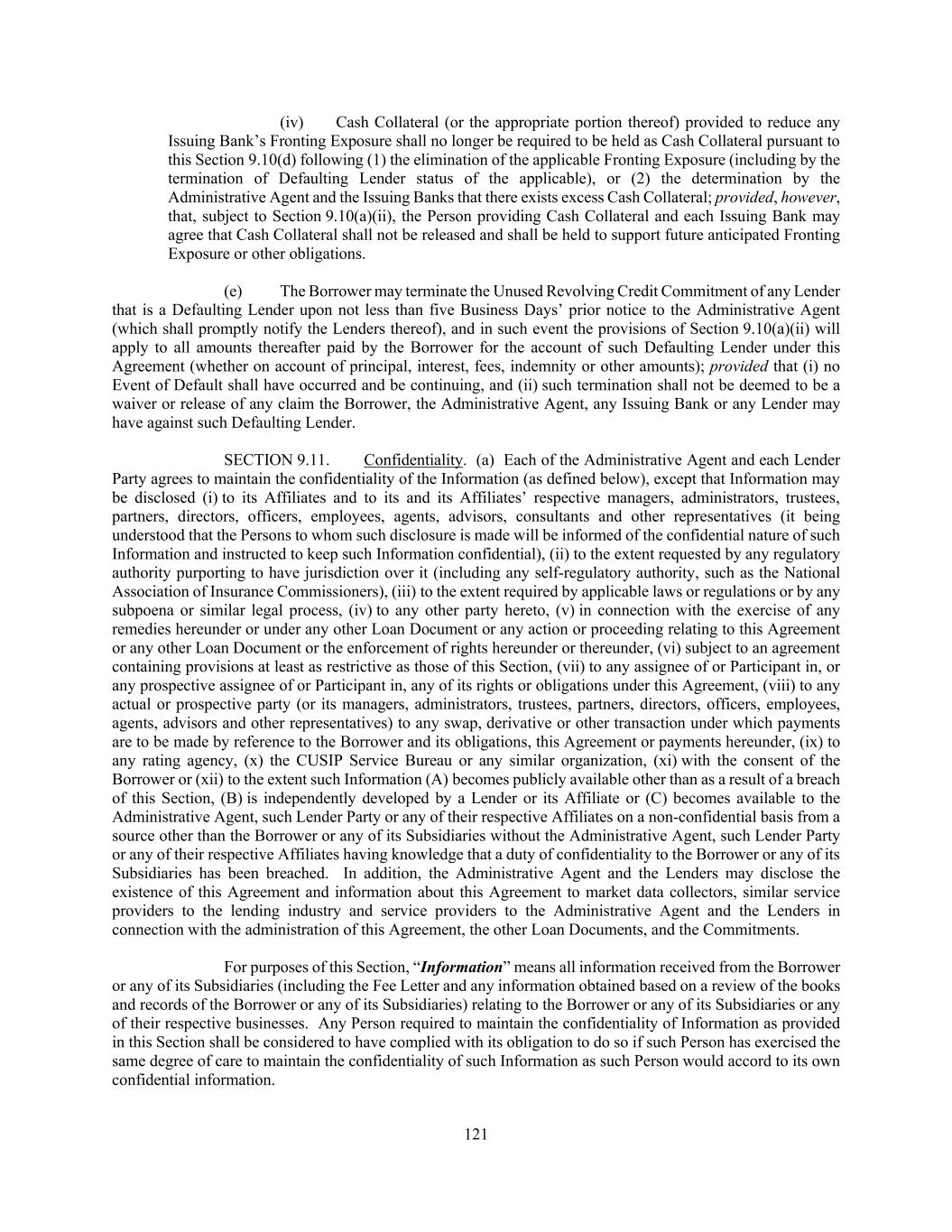 121 (iv) Cash Collateral (or the appropriate portion thereof) provided to reduce any Issuing Bank’s Fronting Exposure shall no longer be required to be held as Cash Collateral pursuant to this Section 9.10(d) following (1) the elimination of the applicable Fronting Exposure (including by the termination of Defaulting Lender status of the applicable), or (2) the determination by the Administrative Agent and the Issuing Banks that there exists excess Cash Collateral; provided, however, that, subject to Section 9.10(a)(ii), the Person providing Cash Collateral and each Issuing Bank may agree that Cash Collateral shall not be released and shall be held to support future anticipated Fronting Exposure or other obligations. (e) The Borrower may terminate the Unused Revolving Credit Commitment of any Lender that is a Defaulting Lender upon not less than five Business Days’ prior notice to the Administrative Agent (which shall promptly notify the Lenders thereof), and in such event the provisions of Section 9.10(a)(ii) will apply to all amounts thereafter paid by the Borrower for the account of such Defaulting Lender under this Agreement (whether on account of principal, interest, fees, indemnity or other amounts); provided that (i) no Event of Default shall have occurred and be continuing, and (ii) such termination shall not be deemed to be a waiver or release of any claim the Borrower, the Administrative Agent, any Issuing Bank or any Lender may have against such Defaulting Lender. SECTION 9.11. Confidentiality. (a) Each of the Administrative Agent and each Lender Party agrees to maintain the confidentiality of the Information (as defined below), except that Information may be disclosed (i) to its Affiliates and to its and its Affiliates’ respective managers, administrators, trustees, partners, directors, officers, employees, agents, advisors, consultants and other representatives (it being understood that the Persons to whom such disclosure is made will be informed of the confidential nature of such Information and instructed to keep such Information confidential), (ii) to the extent requested by any regulatory authority purporting to have jurisdiction over it (including any self-regulatory authority, such as the National Association of Insurance Commissioners), (iii) to the extent required by applicable laws or regulations or by any subpoena or similar legal process, (iv) to any other party hereto, (v) in connection with the exercise of any remedies hereunder or under any other Loan Document or any action or proceeding relating to this Agreement or any other Loan Document or the enforcement of rights hereunder or thereunder, (vi) subject to an agreement containing provisions at least as restrictive as those of this Section, (vii) to any assignee of or Participant in, or any prospective assignee of or Participant in, any of its rights or obligations under this Agreement, (viii) to any actual or prospective party (or its managers, administrators, trustees, partners, directors, officers, employees, agents, advisors and other representatives) to any swap, derivative or other transaction under which payments are to be made by reference to the Borrower and its obligations, this Agreement or payments hereunder, (ix) to any rating agency, (x) the CUSIP Service Bureau or any similar organization, (xi) with the consent of the Borrower or (xii) to the extent such Information (A) becomes publicly available other than as a result of a breach of this Section, (B) is independently developed by a Lender or its Affiliate or (C) becomes available to the Administrative Agent, such Lender Party or any of their respective Affiliates on a non-confidential basis from a source other than the Borrower or any of its Subsidiaries without the Administrative Agent, such Lender Party or any of their respective Affiliates having knowledge that a duty of confidentiality to the Borrower or any of its Subsidiaries has been breached. In addition, the Administrative Agent and the Lenders may disclose the existence of this Agreement and information about this Agreement to market data collectors, similar service providers to the lending industry and service providers to the Administrative Agent and the Lenders in connection with the administration of this Agreement, the other Loan Documents, and the Commitments. For purposes of this Section, “Information” means all information received from the Borrower or any of its Subsidiaries (including the Fee Letter and any information obtained based on a review of the books and records of the Borrower or any of its Subsidiaries) relating to the Borrower or any of its Subsidiaries or any of their respective businesses. Any Person required to maintain the confidentiality of Information as provided in this Section shall be considered to have complied with its obligation to do so if such Person has exercised the same degree of care to maintain the confidentiality of such Information as such Person would accord to its own confidential information.