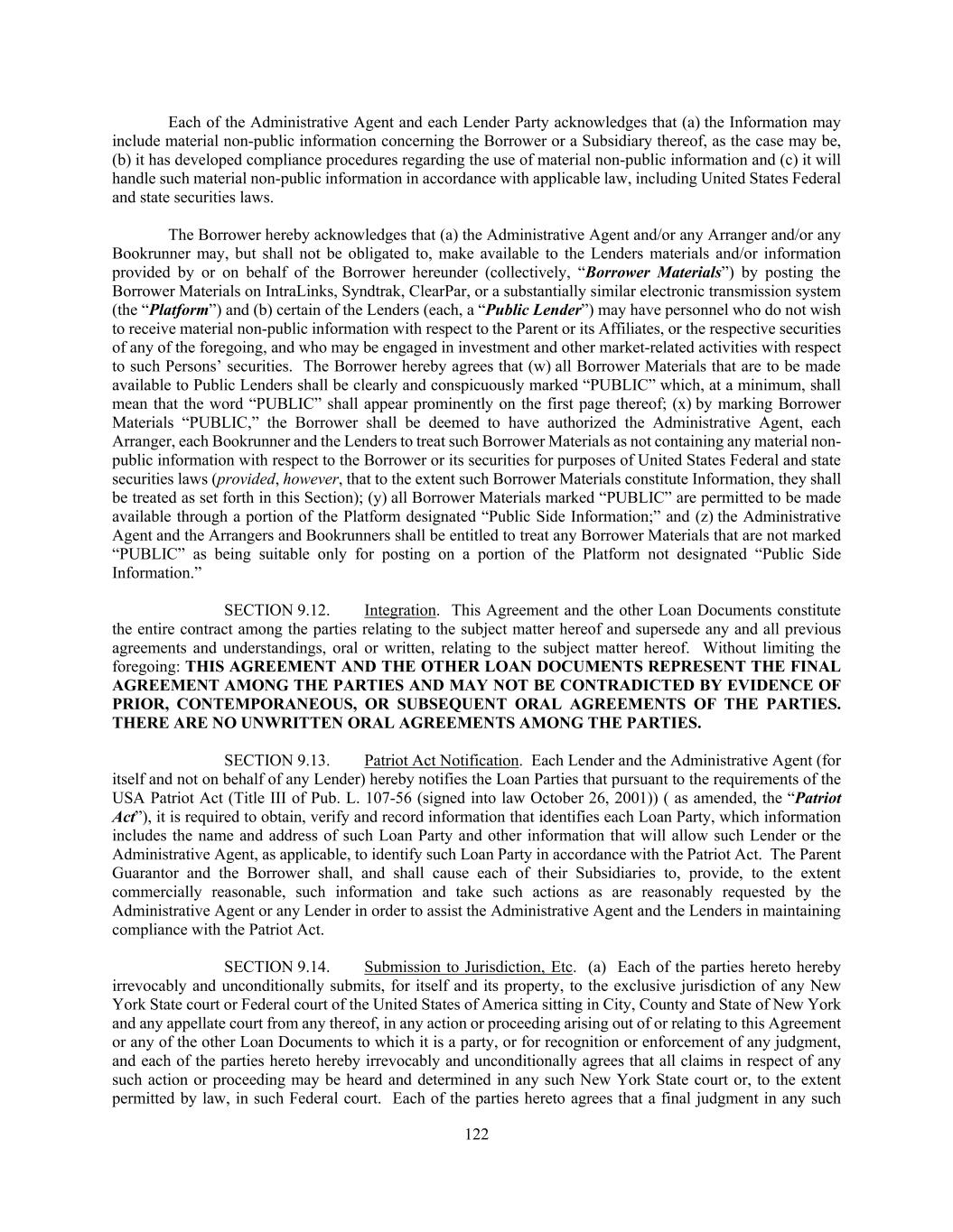 122 Each of the Administrative Agent and each Lender Party acknowledges that (a) the Information may include material non-public information concerning the Borrower or a Subsidiary thereof, as the case may be, (b) it has developed compliance procedures regarding the use of material non-public information and (c) it will handle such material non-public information in accordance with applicable law, including United States Federal and state securities laws. The Borrower hereby acknowledges that (a) the Administrative Agent and/or any Arranger and/or any Bookrunner may, but shall not be obligated to, make available to the Lenders materials and/or information provided by or on behalf of the Borrower hereunder (collectively, “Borrower Materials”) by posting the Borrower Materials on IntraLinks, Syndtrak, ClearPar, or a substantially similar electronic transmission system (the “Platform”) and (b) certain of the Lenders (each, a “Public Lender”) may have personnel who do not wish to receive material non-public information with respect to the Parent or its Affiliates, or the respective securities of any of the foregoing, and who may be engaged in investment and other market-related activities with respect to such Persons’ securities. The Borrower hereby agrees that (w) all Borrower Materials that are to be made available to Public Lenders shall be clearly and conspicuously marked “PUBLIC” which, at a minimum, shall mean that the word “PUBLIC” shall appear prominently on the first page thereof; (x) by marking Borrower Materials “PUBLIC,” the Borrower shall be deemed to have authorized the Administrative Agent, each Arranger, each Bookrunner and the Lenders to treat such Borrower Materials as not containing any material non- public information with respect to the Borrower or its securities for purposes of United States Federal and state securities laws (provided, however, that to the extent such Borrower Materials constitute Information, they shall be treated as set forth in this Section); (y) all Borrower Materials marked “PUBLIC” are permitted to be made available through a portion of the Platform designated “Public Side Information;” and (z) the Administrative Agent and the Arrangers and Bookrunners shall be entitled to treat any Borrower Materials that are not marked “PUBLIC” as being suitable only for posting on a portion of the Platform not designated “Public Side Information.” SECTION 9.12. Integration. This Agreement and the other Loan Documents constitute the entire contract among the parties relating to the subject matter hereof and supersede any and all previous agreements and understandings, oral or written, relating to the subject matter hereof. Without limiting the foregoing: THIS AGREEMENT AND THE OTHER LOAN DOCUMENTS REPRESENT THE FINAL AGREEMENT AMONG THE PARTIES AND MAY NOT BE CONTRADICTED BY EVIDENCE OF PRIOR, CONTEMPORANEOUS, OR SUBSEQUENT ORAL AGREEMENTS OF THE PARTIES. THERE ARE NO UNWRITTEN ORAL AGREEMENTS AMONG THE PARTIES. SECTION 9.13. Patriot Act Notification. Each Lender and the Administrative Agent (for itself and not on behalf of any Lender) hereby notifies the Loan Parties that pursuant to the requirements of the USA Patriot Act (Title III of Pub. L. 107-56 (signed into law October 26, 2001)) ( as amended, the “Patriot Act”), it is required to obtain, verify and record information that identifies each Loan Party, which information includes the name and address of such Loan Party and other information that will allow such Lender or the Administrative Agent, as applicable, to identify such Loan Party in accordance with the Patriot Act. The Parent Guarantor and the Borrower shall, and shall cause each of their Subsidiaries to, provide, to the extent commercially reasonable, such information and take such actions as are reasonably requested by the Administrative Agent or any Lender in order to assist the Administrative Agent and the Lenders in maintaining compliance with the Patriot Act. SECTION 9.14. Submission to Jurisdiction, Etc. (a) Each of the parties hereto hereby irrevocably and unconditionally submits, for itself and its property, to the exclusive jurisdiction of any New York State court or Federal court of the United States of America sitting in City, County and State of New York and any appellate court from any thereof, in any action or proceeding arising out of or relating to this Agreement or any of the other Loan Documents to which it is a party, or for recognition or enforcement of any judgment, and each of the parties hereto hereby irrevocably and unconditionally agrees that all claims in respect of any such action or proceeding may be heard and determined in any such New York State court or, to the extent permitted by law, in such Federal court. Each of the parties hereto agrees that a final judgment in any such