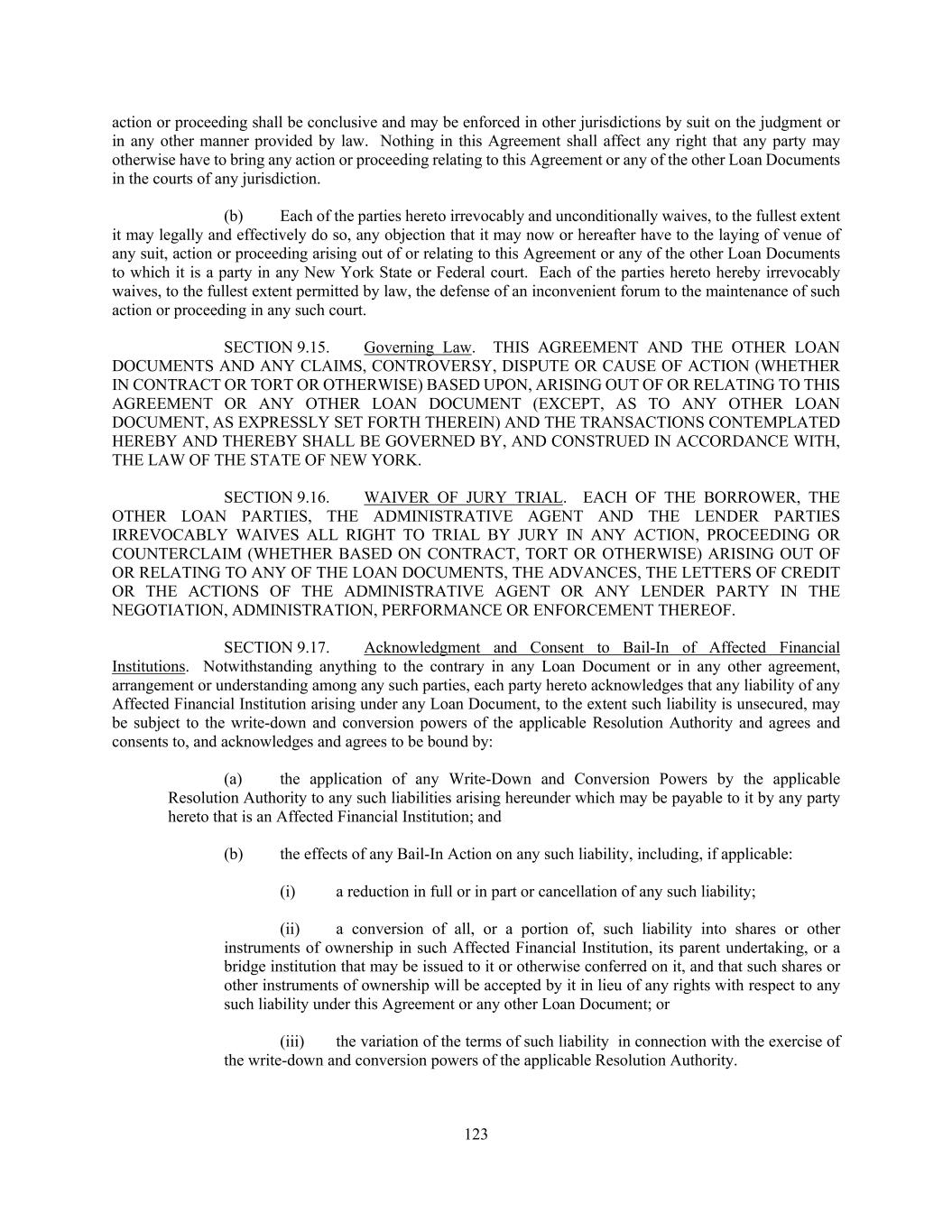 123 action or proceeding shall be conclusive and may be enforced in other jurisdictions by suit on the judgment or in any other manner provided by law. Nothing in this Agreement shall affect any right that any party may otherwise have to bring any action or proceeding relating to this Agreement or any of the other Loan Documents in the courts of any jurisdiction. (b) Each of the parties hereto irrevocably and unconditionally waives, to the fullest extent it may legally and effectively do so, any objection that it may now or hereafter have to the laying of venue of any suit, action or proceeding arising out of or relating to this Agreement or any of the other Loan Documents to which it is a party in any New York State or Federal court. Each of the parties hereto hereby irrevocably waives, to the fullest extent permitted by law, the defense of an inconvenient forum to the maintenance of such action or proceeding in any such court. SECTION 9.15. Governing Law. THIS AGREEMENT AND THE OTHER LOAN DOCUMENTS AND ANY CLAIMS, CONTROVERSY, DISPUTE OR CAUSE OF ACTION (WHETHER IN CONTRACT OR TORT OR OTHERWISE) BASED UPON, ARISING OUT OF OR RELATING TO THIS AGREEMENT OR ANY OTHER LOAN DOCUMENT (EXCEPT, AS TO ANY OTHER LOAN DOCUMENT, AS EXPRESSLY SET FORTH THEREIN) AND THE TRANSACTIONS CONTEMPLATED HEREBY AND THEREBY SHALL BE GOVERNED BY, AND CONSTRUED IN ACCORDANCE WITH, THE LAW OF THE STATE OF NEW YORK. SECTION 9.16. WAIVER OF JURY TRIAL. EACH OF THE BORROWER, THE OTHER LOAN PARTIES, THE ADMINISTRATIVE AGENT AND THE LENDER PARTIES IRREVOCABLY WAIVES ALL RIGHT TO TRIAL BY JURY IN ANY ACTION, PROCEEDING OR COUNTERCLAIM (WHETHER BASED ON CONTRACT, TORT OR OTHERWISE) ARISING OUT OF OR RELATING TO ANY OF THE LOAN DOCUMENTS, THE ADVANCES, THE LETTERS OF CREDIT OR THE ACTIONS OF THE ADMINISTRATIVE AGENT OR ANY LENDER PARTY IN THE NEGOTIATION, ADMINISTRATION, PERFORMANCE OR ENFORCEMENT THEREOF. SECTION 9.17. Acknowledgment and Consent to Bail-In of Affected Financial Institutions. Notwithstanding anything to the contrary in any Loan Document or in any other agreement, arrangement or understanding among any such parties, each party hereto acknowledges that any liability of any Affected Financial Institution arising under any Loan Document, to the extent such liability is unsecured, may be subject to the write-down and conversion powers of the applicable Resolution Authority and agrees and consents to, and acknowledges and agrees to be bound by: (a) the application of any Write-Down and Conversion Powers by the applicable Resolution Authority to any such liabilities arising hereunder which may be payable to it by any party hereto that is an Affected Financial Institution; and (b) the effects of any Bail-In Action on any such liability, including, if applicable: (i) a reduction in full or in part or cancellation of any such liability; (ii) a conversion of all, or a portion of, such liability into shares or other instruments of ownership in such Affected Financial Institution, its parent undertaking, or a bridge institution that may be issued to it or otherwise conferred on it, and that such shares or other instruments of ownership will be accepted by it in lieu of any rights with respect to any such liability under this Agreement or any other Loan Document; or (iii) the variation of the terms of such liability in connection with the exercise of the write-down and conversion powers of the applicable Resolution Authority.