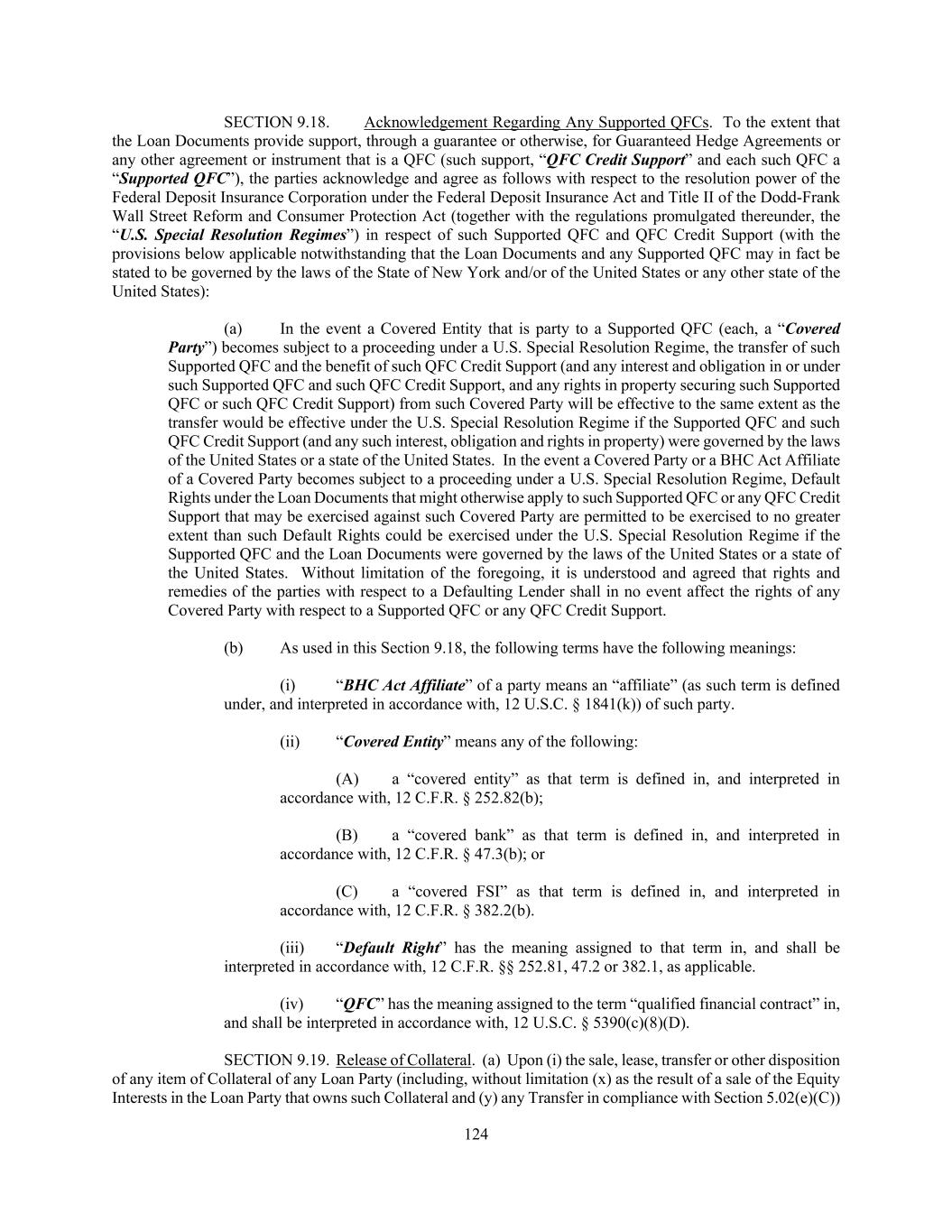 124 SECTION 9.18. Acknowledgement Regarding Any Supported QFCs. To the extent that the Loan Documents provide support, through a guarantee or otherwise, for Guaranteed Hedge Agreements or any other agreement or instrument that is a QFC (such support, “QFC Credit Support” and each such QFC a “Supported QFC”), the parties acknowledge and agree as follows with respect to the resolution power of the Federal Deposit Insurance Corporation under the Federal Deposit Insurance Act and Title II of the Dodd-Frank Wall Street Reform and Consumer Protection Act (together with the regulations promulgated thereunder, the “U.S. Special Resolution Regimes”) in respect of such Supported QFC and QFC Credit Support (with the provisions below applicable notwithstanding that the Loan Documents and any Supported QFC may in fact be stated to be governed by the laws of the State of New York and/or of the United States or any other state of the United States): (a) In the event a Covered Entity that is party to a Supported QFC (each, a “Covered Party”) becomes subject to a proceeding under a U.S. Special Resolution Regime, the transfer of such Supported QFC and the benefit of such QFC Credit Support (and any interest and obligation in or under such Supported QFC and such QFC Credit Support, and any rights in property securing such Supported QFC or such QFC Credit Support) from such Covered Party will be effective to the same extent as the transfer would be effective under the U.S. Special Resolution Regime if the Supported QFC and such QFC Credit Support (and any such interest, obligation and rights in property) were governed by the laws of the United States or a state of the United States. In the event a Covered Party or a BHC Act Affiliate of a Covered Party becomes subject to a proceeding under a U.S. Special Resolution Regime, Default Rights under the Loan Documents that might otherwise apply to such Supported QFC or any QFC Credit Support that may be exercised against such Covered Party are permitted to be exercised to no greater extent than such Default Rights could be exercised under the U.S. Special Resolution Regime if the Supported QFC and the Loan Documents were governed by the laws of the United States or a state of the United States. Without limitation of the foregoing, it is understood and agreed that rights and remedies of the parties with respect to a Defaulting Lender shall in no event affect the rights of any Covered Party with respect to a Supported QFC or any QFC Credit Support. (b) As used in this Section 9.18, the following terms have the following meanings: (i) “BHC Act Affiliate” of a party means an “affiliate” (as such term is defined under, and interpreted in accordance with, 12 U.S.C. § 1841(k)) of such party. (ii) “Covered Entity” means any of the following: (A) a “covered entity” as that term is defined in, and interpreted in accordance with, 12 C.F.R. § 252.82(b); (B) a “covered bank” as that term is defined in, and interpreted in accordance with, 12 C.F.R. § 47.3(b); or (C) a “covered FSI” as that term is defined in, and interpreted in accordance with, 12 C.F.R. § 382.2(b). (iii) “Default Right” has the meaning assigned to that term in, and shall be interpreted in accordance with, 12 C.F.R. §§ 252.81, 47.2 or 382.1, as applicable. (iv) “QFC” has the meaning assigned to the term “qualified financial contract” in, and shall be interpreted in accordance with, 12 U.S.C. § 5390(c)(8)(D). SECTION 9.19. Release of Collateral. (a) Upon (i) the sale, lease, transfer or other disposition of any item of Collateral of any Loan Party (including, without limitation (x) as the result of a sale of the Equity Interests in the Loan Party that owns such Collateral and (y) any Transfer in compliance with Section 5.02(e)(C))