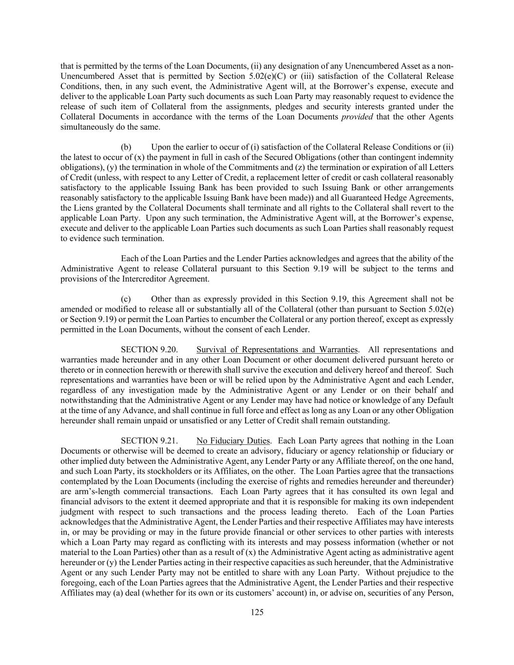 125 that is permitted by the terms of the Loan Documents, (ii) any designation of any Unencumbered Asset as a non- Unencumbered Asset that is permitted by Section 5.02(e)(C) or (iii) satisfaction of the Collateral Release Conditions, then, in any such event, the Administrative Agent will, at the Borrower’s expense, execute and deliver to the applicable Loan Party such documents as such Loan Party may reasonably request to evidence the release of such item of Collateral from the assignments, pledges and security interests granted under the Collateral Documents in accordance with the terms of the Loan Documents provided that the other Agents simultaneously do the same. (b) Upon the earlier to occur of (i) satisfaction of the Collateral Release Conditions or (ii) the latest to occur of (x) the payment in full in cash of the Secured Obligations (other than contingent indemnity obligations), (y) the termination in whole of the Commitments and (z) the termination or expiration of all Letters of Credit (unless, with respect to any Letter of Credit, a replacement letter of credit or cash collateral reasonably satisfactory to the applicable Issuing Bank has been provided to such Issuing Bank or other arrangements reasonably satisfactory to the applicable Issuing Bank have been made)) and all Guaranteed Hedge Agreements, the Liens granted by the Collateral Documents shall terminate and all rights to the Collateral shall revert to the applicable Loan Party. Upon any such termination, the Administrative Agent will, at the Borrower’s expense, execute and deliver to the applicable Loan Parties such documents as such Loan Parties shall reasonably request to evidence such termination. Each of the Loan Parties and the Lender Parties acknowledges and agrees that the ability of the Administrative Agent to release Collateral pursuant to this Section 9.19 will be subject to the terms and provisions of the Intercreditor Agreement. (c) Other than as expressly provided in this Section 9.19, this Agreement shall not be amended or modified to release all or substantially all of the Collateral (other than pursuant to Section 5.02(e) or Section 9.19) or permit the Loan Parties to encumber the Collateral or any portion thereof, except as expressly permitted in the Loan Documents, without the consent of each Lender. SECTION 9.20. Survival of Representations and Warranties. All representations and warranties made hereunder and in any other Loan Document or other document delivered pursuant hereto or thereto or in connection herewith or therewith shall survive the execution and delivery hereof and thereof. Such representations and warranties have been or will be relied upon by the Administrative Agent and each Lender, regardless of any investigation made by the Administrative Agent or any Lender or on their behalf and notwithstanding that the Administrative Agent or any Lender may have had notice or knowledge of any Default at the time of any Advance, and shall continue in full force and effect as long as any Loan or any other Obligation hereunder shall remain unpaid or unsatisfied or any Letter of Credit shall remain outstanding. SECTION 9.21. No Fiduciary Duties. Each Loan Party agrees that nothing in the Loan Documents or otherwise will be deemed to create an advisory, fiduciary or agency relationship or fiduciary or other implied duty between the Administrative Agent, any Lender Party or any Affiliate thereof, on the one hand, and such Loan Party, its stockholders or its Affiliates, on the other. The Loan Parties agree that the transactions contemplated by the Loan Documents (including the exercise of rights and remedies hereunder and thereunder) are arm’s-length commercial transactions. Each Loan Party agrees that it has consulted its own legal and financial advisors to the extent it deemed appropriate and that it is responsible for making its own independent judgment with respect to such transactions and the process leading thereto. Each of the Loan Parties acknowledges that the Administrative Agent, the Lender Parties and their respective Affiliates may have interests in, or may be providing or may in the future provide financial or other services to other parties with interests which a Loan Party may regard as conflicting with its interests and may possess information (whether or not material to the Loan Parties) other than as a result of (x) the Administrative Agent acting as administrative agent hereunder or (y) the Lender Parties acting in their respective capacities as such hereunder, that the Administrative Agent or any such Lender Party may not be entitled to share with any Loan Party. Without prejudice to the foregoing, each of the Loan Parties agrees that the Administrative Agent, the Lender Parties and their respective Affiliates may (a) deal (whether for its own or its customers’ account) in, or advise on, securities of any Person,