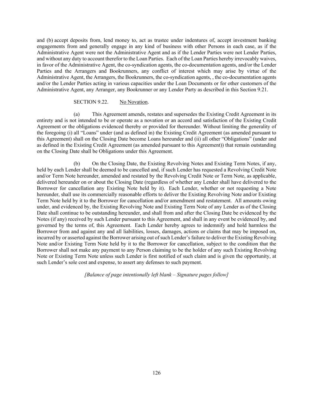 126 and (b) accept deposits from, lend money to, act as trustee under indentures of, accept investment banking engagements from and generally engage in any kind of business with other Persons in each case, as if the Administrative Agent were not the Administrative Agent and as if the Lender Parties were not Lender Parties, and without any duty to account therefor to the Loan Parties. Each of the Loan Parties hereby irrevocably waives, in favor of the Administrative Agent, the co-syndication agents, the co-documentation agents, and/or the Lender Parties and the Arrangers and Bookrunners, any conflict of interest which may arise by virtue of the Administrative Agent, the Arrangers, the Bookrunners, the co-syndication agents, , the co-documentation agents and/or the Lender Parties acting in various capacities under the Loan Documents or for other customers of the Administrative Agent, any Arranger, any Bookrunner or any Lender Party as described in this Section 9.21. SECTION 9.22. No Novation. (a) This Agreement amends, restates and supersedes the Existing Credit Agreement in its entirety and is not intended to be or operate as a novation or an accord and satisfaction of the Existing Credit Agreement or the obligations evidenced thereby or provided for thereunder. Without limiting the generality of the foregoing (i) all “Loans” under (and as defined in) the Existing Credit Agreement (as amended pursuant to this Agreement) shall on the Closing Date become Loans hereunder and (ii) all other “Obligations” (under and as defined in the Existing Credit Agreement (as amended pursuant to this Agreement)) that remain outstanding on the Closing Date shall be Obligations under this Agreement. (b) On the Closing Date, the Existing Revolving Notes and Existing Term Notes, if any, held by each Lender shall be deemed to be cancelled and, if such Lender has requested a Revolving Credit Note and/or Term Note hereunder, amended and restated by the Revolving Credit Note or Term Note, as applicable, delivered hereunder on or about the Closing Date (regardless of whether any Lender shall have delivered to the Borrower for cancellation any Existing Note held by it). Each Lender, whether or not requesting a Note hereunder, shall use its commercially reasonable efforts to deliver the Existing Revolving Note and/or Existing Term Note held by it to the Borrower for cancellation and/or amendment and restatement. All amounts owing under, and evidenced by, the Existing Revolving Note and Existing Term Note of any Lender as of the Closing Date shall continue to be outstanding hereunder, and shall from and after the Closing Date be evidenced by the Notes (if any) received by such Lender pursuant to this Agreement, and shall in any event be evidenced by, and governed by the terms of, this Agreement. Each Lender hereby agrees to indemnify and hold harmless the Borrower from and against any and all liabilities, losses, damages, actions or claims that may be imposed on, incurred by or asserted against the Borrower arising out of such Lender’s failure to deliver the Existing Revolving Note and/or Existing Term Note held by it to the Borrower for cancellation, subject to the condition that the Borrower shall not make any payment to any Person claiming to be the holder of any such Existing Revolving Note or Existing Term Note unless such Lender is first notified of such claim and is given the opportunity, at such Lender’s sole cost and expense, to assert any defenses to such payment. [Balance of page intentionally left blank – Signature pages follow]