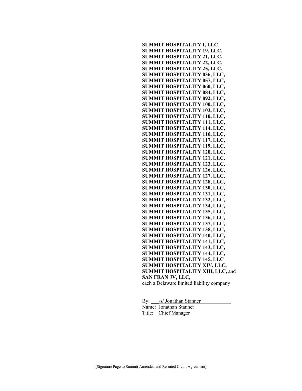 [Signature Page to Summit Amended and Restated Credit Agreement] SUMMIT HOSPITALITY I, LLC, SUMMIT HOSPITALITY 19, LLC, SUMMIT HOSPITALITY 21, LLC, SUMMIT HOSPITALITY 22, LLC, SUMMIT HOSPITALITY 25, LLC, SUMMIT HOSPITALITY 036, LLC, SUMMIT HOSPITALITY 057, LLC, SUMMIT HOSPITALITY 060, LLC, SUMMIT HOSPITALITY 084, LLC, SUMMIT HOSPITALITY 092, LLC, SUMMIT HOSPITALITY 100, LLC, SUMMIT HOSPITALITY 103, LLC, SUMMIT HOSPITALITY 110, LLC, SUMMIT HOSPITALITY 111, LLC, SUMMIT HOSPITALITY 114, LLC, SUMMIT HOSPITALITY 116, LLC, SUMMIT HOSPITALITY 117, LLC, SUMMIT HOSPITALITY 119, LLC, SUMMIT HOSPITALITY 120, LLC, SUMMIT HOSPITALITY 121, LLC, SUMMIT HOSPITALITY 123, LLC, SUMMIT HOSPITALITY 126, LLC, SUMMIT HOSPITALITY 127, LLC, SUMMIT HOSPITALITY 128, LLC, SUMMIT HOSPITALITY 130, LLC, SUMMIT HOSPITALITY 131, LLC, SUMMIT HOSPITALITY 132, LLC, SUMMIT HOSPITALITY 134, LLC, SUMMIT HOSPITALITY 135, LLC, SUMMIT HOSPITALITY 136, LLC, SUMMIT HOSPITALITY 137, LLC, SUMMIT HOSPITALITY 138, LLC, SUMMIT HOSPITALITY 140, LLC, SUMMIT HOSPITALITY 141, LLC, SUMMIT HOSPITALITY 143, LLC, SUMMIT HOSPITALITY 144, LLC, SUMMIT HOSPITALITY 145, LLC SUMMIT HOSPITALITY XIV, LLC, SUMMIT HOSPITALITY XIII, LLC, and SAN FRAN JV, LLC, each a Delaware limited liability company By: ___/s/ Jonathan Stanner Name: Jonathan Stanner Title: Chief Manager