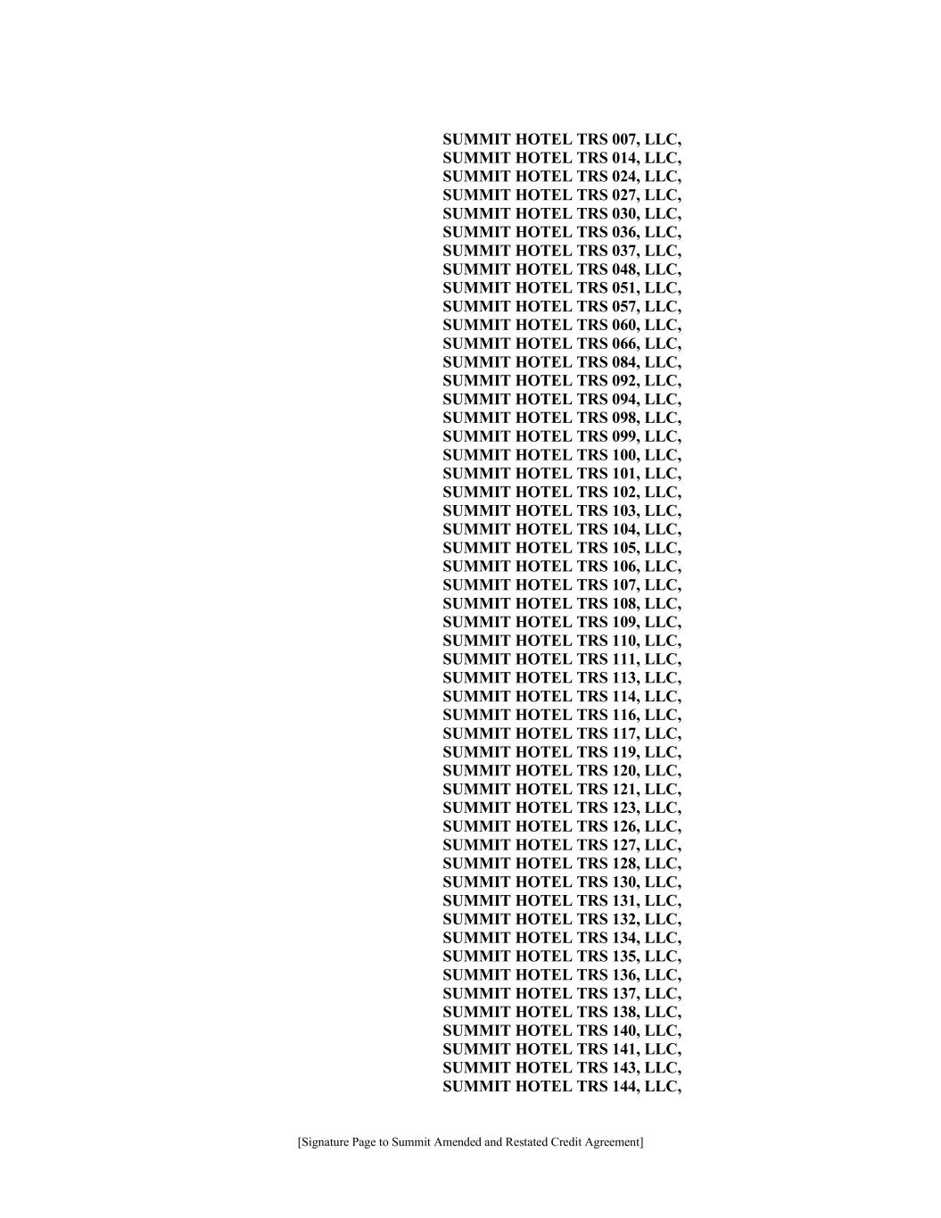 [Signature Page to Summit Amended and Restated Credit Agreement] SUMMIT HOTEL TRS 007, LLC, SUMMIT HOTEL TRS 014, LLC, SUMMIT HOTEL TRS 024, LLC, SUMMIT HOTEL TRS 027, LLC, SUMMIT HOTEL TRS 030, LLC, SUMMIT HOTEL TRS 036, LLC, SUMMIT HOTEL TRS 037, LLC, SUMMIT HOTEL TRS 048, LLC, SUMMIT HOTEL TRS 051, LLC, SUMMIT HOTEL TRS 057, LLC, SUMMIT HOTEL TRS 060, LLC, SUMMIT HOTEL TRS 066, LLC, SUMMIT HOTEL TRS 084, LLC, SUMMIT HOTEL TRS 092, LLC, SUMMIT HOTEL TRS 094, LLC, SUMMIT HOTEL TRS 098, LLC, SUMMIT HOTEL TRS 099, LLC, SUMMIT HOTEL TRS 100, LLC, SUMMIT HOTEL TRS 101, LLC, SUMMIT HOTEL TRS 102, LLC, SUMMIT HOTEL TRS 103, LLC, SUMMIT HOTEL TRS 104, LLC, SUMMIT HOTEL TRS 105, LLC, SUMMIT HOTEL TRS 106, LLC, SUMMIT HOTEL TRS 107, LLC, SUMMIT HOTEL TRS 108, LLC, SUMMIT HOTEL TRS 109, LLC, SUMMIT HOTEL TRS 110, LLC, SUMMIT HOTEL TRS 111, LLC, SUMMIT HOTEL TRS 113, LLC, SUMMIT HOTEL TRS 114, LLC, SUMMIT HOTEL TRS 116, LLC, SUMMIT HOTEL TRS 117, LLC, SUMMIT HOTEL TRS 119, LLC, SUMMIT HOTEL TRS 120, LLC, SUMMIT HOTEL TRS 121, LLC, SUMMIT HOTEL TRS 123, LLC, SUMMIT HOTEL TRS 126, LLC, SUMMIT HOTEL TRS 127, LLC, SUMMIT HOTEL TRS 128, LLC, SUMMIT HOTEL TRS 130, LLC, SUMMIT HOTEL TRS 131, LLC, SUMMIT HOTEL TRS 132, LLC, SUMMIT HOTEL TRS 134, LLC, SUMMIT HOTEL TRS 135, LLC, SUMMIT HOTEL TRS 136, LLC, SUMMIT HOTEL TRS 137, LLC, SUMMIT HOTEL TRS 138, LLC, SUMMIT HOTEL TRS 140, LLC, SUMMIT HOTEL TRS 141, LLC, SUMMIT HOTEL TRS 143, LLC, SUMMIT HOTEL TRS 144, LLC,