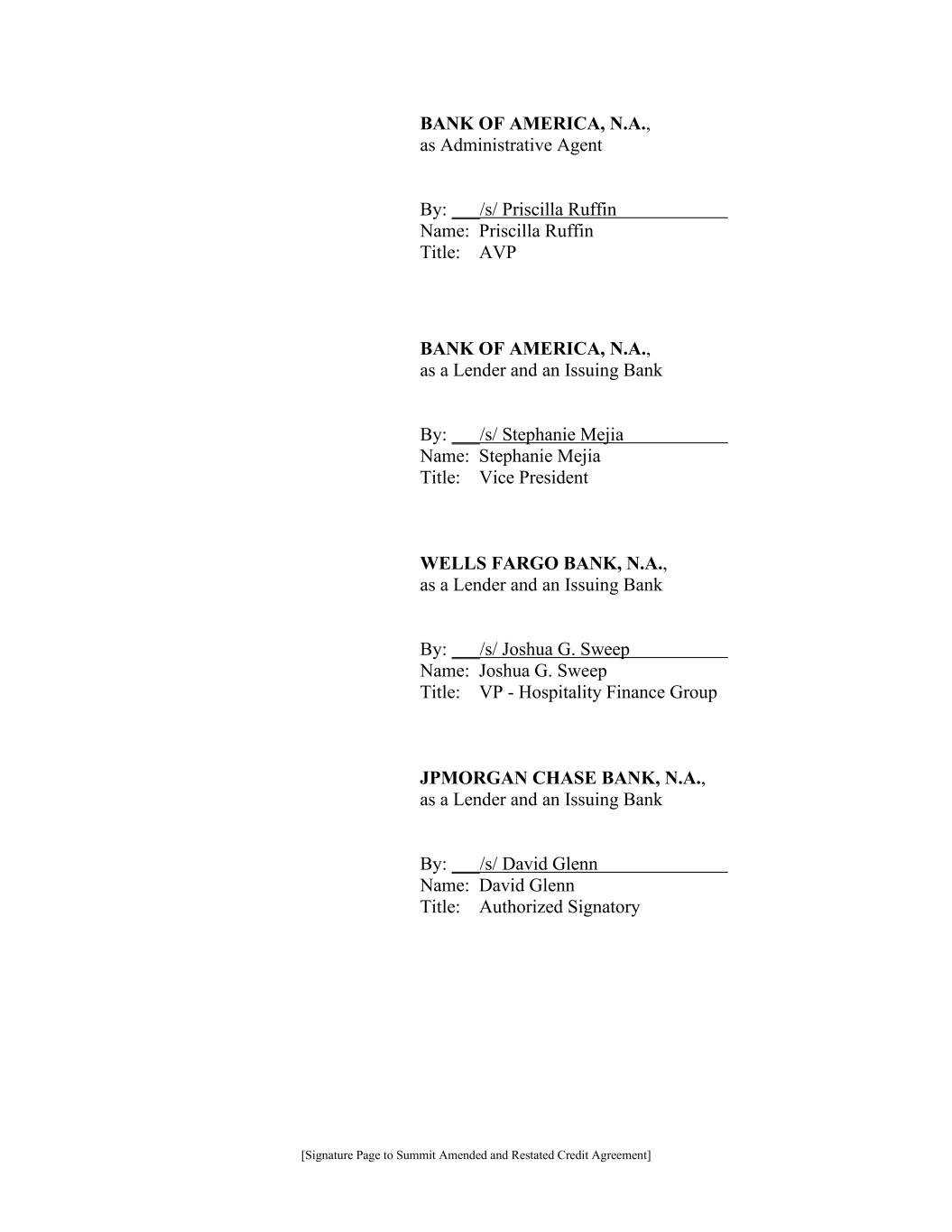 [Signature Page to Summit Amended and Restated Credit Agreement] BANK OF AMERICA, N.A., as Administrative Agent By: ___/s/ Priscilla Ruffin Name: Priscilla Ruffin Title: AVP BANK OF AMERICA, N.A., as a Lender and an Issuing Bank By: ___/s/ Stephanie Mejia Name: Stephanie Mejia Title: Vice President WELLS FARGO BANK, N.A., as a Lender and an Issuing Bank By: ___/s/ Joshua G. Sweep Name: Joshua G. Sweep Title: VP - Hospitality Finance Group JPMORGAN CHASE BANK, N.A., as a Lender and an Issuing Bank By: ___/s/ David Glenn Name: David Glenn Title: Authorized Signatory