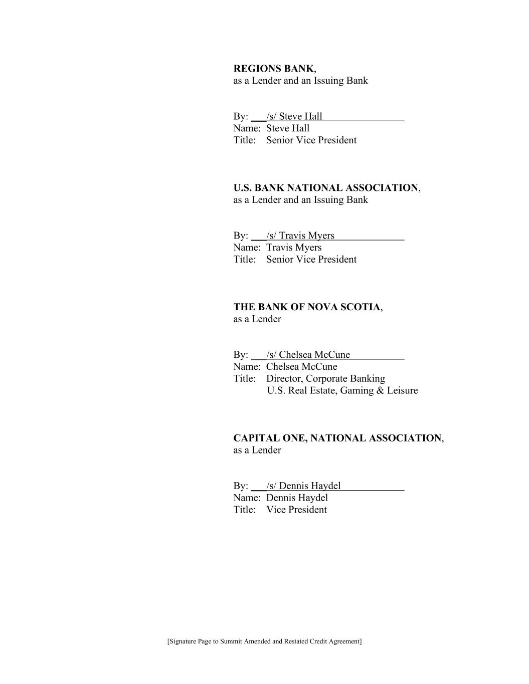 [Signature Page to Summit Amended and Restated Credit Agreement] REGIONS BANK, as a Lender and an Issuing Bank By: ___/s/ Steve Hall Name: Steve Hall Title: Senior Vice President U.S. BANK NATIONAL ASSOCIATION, as a Lender and an Issuing Bank By: ___/s/ Travis Myers Name: Travis Myers Title: Senior Vice President THE BANK OF NOVA SCOTIA, as a Lender By: ___/s/ Chelsea McCune Name: Chelsea McCune Title: Director, Corporate Banking U.S. Real Estate, Gaming & Leisure CAPITAL ONE, NATIONAL ASSOCIATION, as a Lender By: ___/s/ Dennis Haydel Name: Dennis Haydel Title: Vice President