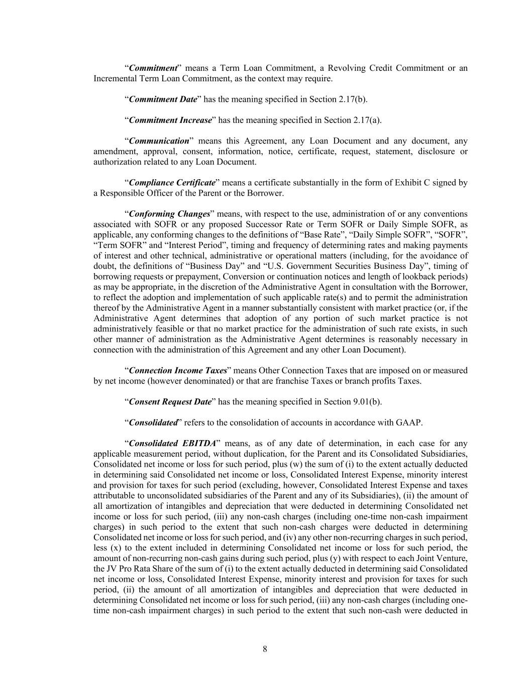 8 “Commitment” means a Term Loan Commitment, a Revolving Credit Commitment or an Incremental Term Loan Commitment, as the context may require. “Commitment Date” has the meaning specified in Section 2.17(b). “Commitment Increase” has the meaning specified in Section 2.17(a). “Communication” means this Agreement, any Loan Document and any document, any amendment, approval, consent, information, notice, certificate, request, statement, disclosure or authorization related to any Loan Document. “Compliance Certificate” means a certificate substantially in the form of Exhibit C signed by a Responsible Officer of the Parent or the Borrower. “Conforming Changes” means, with respect to the use, administration of or any conventions associated with SOFR or any proposed Successor Rate or Term SOFR or Daily Simple SOFR, as applicable, any conforming changes to the definitions of “Base Rate”, “Daily Simple SOFR”, “SOFR”, “Term SOFR” and “Interest Period”, timing and frequency of determining rates and making payments of interest and other technical, administrative or operational matters (including, for the avoidance of doubt, the definitions of “Business Day” and “U.S. Government Securities Business Day”, timing of borrowing requests or prepayment, Conversion or continuation notices and length of lookback periods) as may be appropriate, in the discretion of the Administrative Agent in consultation with the Borrower, to reflect the adoption and implementation of such applicable rate(s) and to permit the administration thereof by the Administrative Agent in a manner substantially consistent with market practice (or, if the Administrative Agent determines that adoption of any portion of such market practice is not administratively feasible or that no market practice for the administration of such rate exists, in such other manner of administration as the Administrative Agent determines is reasonably necessary in connection with the administration of this Agreement and any other Loan Document). “Connection Income Taxes” means Other Connection Taxes that are imposed on or measured by net income (however denominated) or that are franchise Taxes or branch profits Taxes. “Consent Request Date” has the meaning specified in Section 9.01(b). “Consolidated” refers to the consolidation of accounts in accordance with GAAP. “Consolidated EBITDA” means, as of any date of determination, in each case for any applicable measurement period, without duplication, for the Parent and its Consolidated Subsidiaries, Consolidated net income or loss for such period, plus (w) the sum of (i) to the extent actually deducted in determining said Consolidated net income or loss, Consolidated Interest Expense, minority interest and provision for taxes for such period (excluding, however, Consolidated Interest Expense and taxes attributable to unconsolidated subsidiaries of the Parent and any of its Subsidiaries), (ii) the amount of all amortization of intangibles and depreciation that were deducted in determining Consolidated net income or loss for such period, (iii) any non-cash charges (including one-time non-cash impairment charges) in such period to the extent that such non-cash charges were deducted in determining Consolidated net income or loss for such period, and (iv) any other non-recurring charges in such period, less (x) to the extent included in determining Consolidated net income or loss for such period, the amount of non-recurring non-cash gains during such period, plus (y) with respect to each Joint Venture, the JV Pro Rata Share of the sum of (i) to the extent actually deducted in determining said Consolidated net income or loss, Consolidated Interest Expense, minority interest and provision for taxes for such period, (ii) the amount of all amortization of intangibles and depreciation that were deducted in determining Consolidated net income or loss for such period, (iii) any non-cash charges (including one- time non-cash impairment charges) in such period to the extent that such non-cash were deducted in