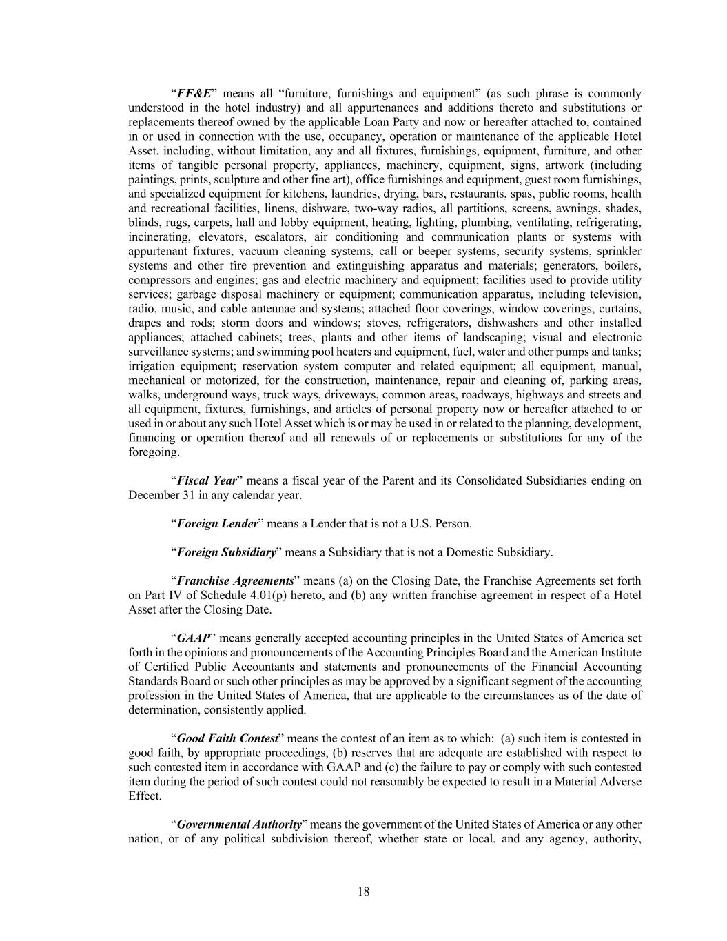 18 “FF&E” means all “furniture, furnishings and equipment” (as such phrase is commonly understood in the hotel industry) and all appurtenances and additions thereto and substitutions or replacements thereof owned by the applicable Loan Party and now or hereafter attached to, contained in or used in connection with the use, occupancy, operation or maintenance of the applicable Hotel Asset, including, without limitation, any and all fixtures, furnishings, equipment, furniture, and other items of tangible personal property, appliances, machinery, equipment, signs, artwork (including paintings, prints, sculpture and other fine art), office furnishings and equipment, guest room furnishings, and specialized equipment for kitchens, laundries, drying, bars, restaurants, spas, public rooms, health and recreational facilities, linens, dishware, two-way radios, all partitions, screens, awnings, shades, blinds, rugs, carpets, hall and lobby equipment, heating, lighting, plumbing, ventilating, refrigerating, incinerating, elevators, escalators, air conditioning and communication plants or systems with appurtenant fixtures, vacuum cleaning systems, call or beeper systems, security systems, sprinkler systems and other fire prevention and extinguishing apparatus and materials; generators, boilers, compressors and engines; gas and electric machinery and equipment; facilities used to provide utility services; garbage disposal machinery or equipment; communication apparatus, including television, radio, music, and cable antennae and systems; attached floor coverings, window coverings, curtains, drapes and rods; storm doors and windows; stoves, refrigerators, dishwashers and other installed appliances; attached cabinets; trees, plants and other items of landscaping; visual and electronic surveillance systems; and swimming pool heaters and equipment, fuel, water and other pumps and tanks; irrigation equipment; reservation system computer and related equipment; all equipment, manual, mechanical or motorized, for the construction, maintenance, repair and cleaning of, parking areas, walks, underground ways, truck ways, driveways, common areas, roadways, highways and streets and all equipment, fixtures, furnishings, and articles of personal property now or hereafter attached to or used in or about any such Hotel Asset which is or may be used in or related to the planning, development, financing or operation thereof and all renewals of or replacements or substitutions for any of the foregoing. “Fiscal Year” means a fiscal year of the Parent and its Consolidated Subsidiaries ending on December 31 in any calendar year. “Foreign Lender” means a Lender that is not a U.S. Person. “Foreign Subsidiary” means a Subsidiary that is not a Domestic Subsidiary. “Franchise Agreements” means (a) on the Closing Date, the Franchise Agreements set forth on Part IV of Schedule 4.01(p) hereto, and (b) any written franchise agreement in respect of a Hotel Asset after the Closing Date. “GAAP” means generally accepted accounting principles in the United States of America set forth in the opinions and pronouncements of the Accounting Principles Board and the American Institute of Certified Public Accountants and statements and pronouncements of the Financial Accounting Standards Board or such other principles as may be approved by a significant segment of the accounting profession in the United States of America, that are applicable to the circumstances as of the date of determination, consistently applied. “Good Faith Contest” means the contest of an item as to which: (a) such item is contested in good faith, by appropriate proceedings, (b) reserves that are adequate are established with respect to such contested item in accordance with GAAP and (c) the failure to pay or comply with such contested item during the period of such contest could not reasonably be expected to result in a Material Adverse Effect. “Governmental Authority” means the government of the United States of America or any other nation, or of any political subdivision thereof, whether state or local, and any agency, authority,