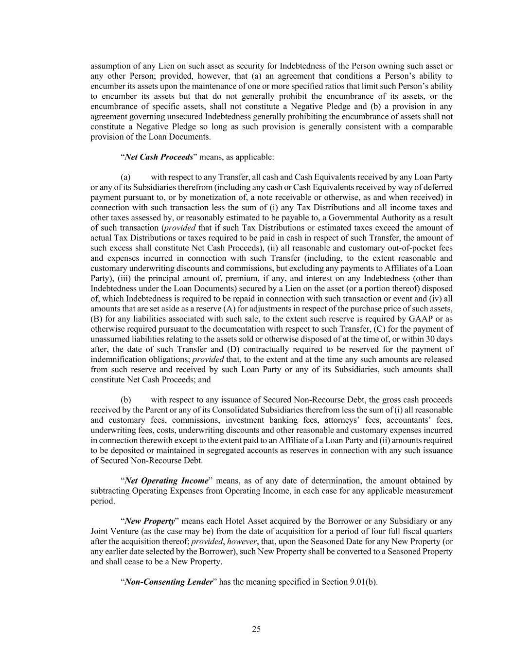 25 assumption of any Lien on such asset as security for Indebtedness of the Person owning such asset or any other Person; provided, however, that (a) an agreement that conditions a Person’s ability to encumber its assets upon the maintenance of one or more specified ratios that limit such Person’s ability to encumber its assets but that do not generally prohibit the encumbrance of its assets, or the encumbrance of specific assets, shall not constitute a Negative Pledge and (b) a provision in any agreement governing unsecured Indebtedness generally prohibiting the encumbrance of assets shall not constitute a Negative Pledge so long as such provision is generally consistent with a comparable provision of the Loan Documents. “Net Cash Proceeds” means, as applicable: (a) with respect to any Transfer, all cash and Cash Equivalents received by any Loan Party or any of its Subsidiaries therefrom (including any cash or Cash Equivalents received by way of deferred payment pursuant to, or by monetization of, a note receivable or otherwise, as and when received) in connection with such transaction less the sum of (i) any Tax Distributions and all income taxes and other taxes assessed by, or reasonably estimated to be payable to, a Governmental Authority as a result of such transaction (provided that if such Tax Distributions or estimated taxes exceed the amount of actual Tax Distributions or taxes required to be paid in cash in respect of such Transfer, the amount of such excess shall constitute Net Cash Proceeds), (ii) all reasonable and customary out-of-pocket fees and expenses incurred in connection with such Transfer (including, to the extent reasonable and customary underwriting discounts and commissions, but excluding any payments to Affiliates of a Loan Party), (iii) the principal amount of, premium, if any, and interest on any Indebtedness (other than Indebtedness under the Loan Documents) secured by a Lien on the asset (or a portion thereof) disposed of, which Indebtedness is required to be repaid in connection with such transaction or event and (iv) all amounts that are set aside as a reserve (A) for adjustments in respect of the purchase price of such assets, (B) for any liabilities associated with such sale, to the extent such reserve is required by GAAP or as otherwise required pursuant to the documentation with respect to such Transfer, (C) for the payment of unassumed liabilities relating to the assets sold or otherwise disposed of at the time of, or within 30 days after, the date of such Transfer and (D) contractually required to be reserved for the payment of indemnification obligations; provided that, to the extent and at the time any such amounts are released from such reserve and received by such Loan Party or any of its Subsidiaries, such amounts shall constitute Net Cash Proceeds; and (b) with respect to any issuance of Secured Non-Recourse Debt, the gross cash proceeds received by the Parent or any of its Consolidated Subsidiaries therefrom less the sum of (i) all reasonable and customary fees, commissions, investment banking fees, attorneys’ fees, accountants’ fees, underwriting fees, costs, underwriting discounts and other reasonable and customary expenses incurred in connection therewith except to the extent paid to an Affiliate of a Loan Party and (ii) amounts required to be deposited or maintained in segregated accounts as reserves in connection with any such issuance of Secured Non-Recourse Debt. “Net Operating Income” means, as of any date of determination, the amount obtained by subtracting Operating Expenses from Operating Income, in each case for any applicable measurement period. “New Property” means each Hotel Asset acquired by the Borrower or any Subsidiary or any Joint Venture (as the case may be) from the date of acquisition for a period of four full fiscal quarters after the acquisition thereof; provided, however, that, upon the Seasoned Date for any New Property (or any earlier date selected by the Borrower), such New Property shall be converted to a Seasoned Property and shall cease to be a New Property. “Non-Consenting Lender” has the meaning specified in Section 9.01(b).