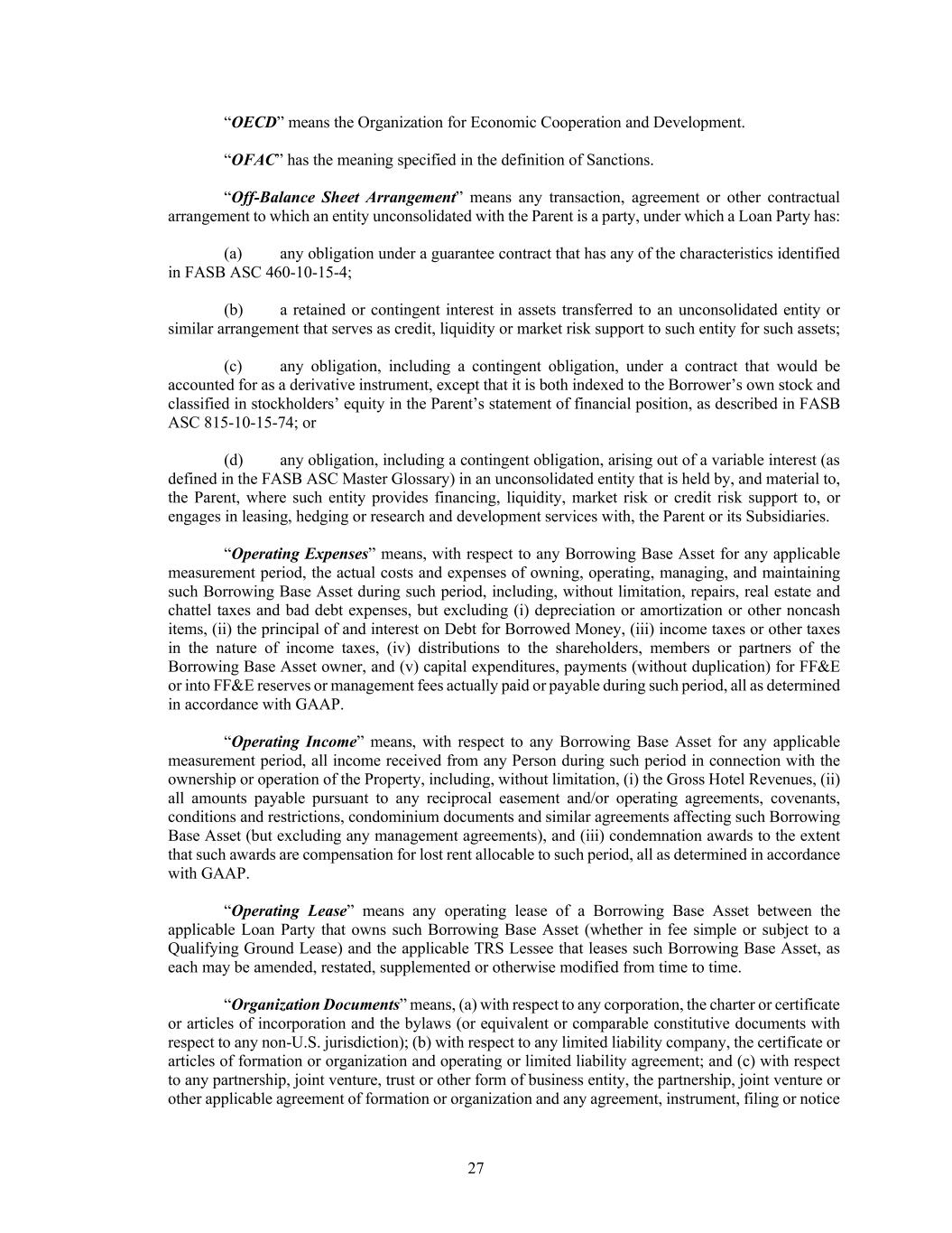 27 “OECD” means the Organization for Economic Cooperation and Development. “OFAC” has the meaning specified in the definition of Sanctions. “Off-Balance Sheet Arrangement” means any transaction, agreement or other contractual arrangement to which an entity unconsolidated with the Parent is a party, under which a Loan Party has: (a) any obligation under a guarantee contract that has any of the characteristics identified in FASB ASC 460-10-15-4; (b) a retained or contingent interest in assets transferred to an unconsolidated entity or similar arrangement that serves as credit, liquidity or market risk support to such entity for such assets; (c) any obligation, including a contingent obligation, under a contract that would be accounted for as a derivative instrument, except that it is both indexed to the Borrower’s own stock and classified in stockholders’ equity in the Parent’s statement of financial position, as described in FASB ASC 815-10-15-74; or (d) any obligation, including a contingent obligation, arising out of a variable interest (as defined in the FASB ASC Master Glossary) in an unconsolidated entity that is held by, and material to, the Parent, where such entity provides financing, liquidity, market risk or credit risk support to, or engages in leasing, hedging or research and development services with, the Parent or its Subsidiaries. “Operating Expenses” means, with respect to any Borrowing Base Asset for any applicable measurement period, the actual costs and expenses of owning, operating, managing, and maintaining such Borrowing Base Asset during such period, including, without limitation, repairs, real estate and chattel taxes and bad debt expenses, but excluding (i) depreciation or amortization or other noncash items, (ii) the principal of and interest on Debt for Borrowed Money, (iii) income taxes or other taxes in the nature of income taxes, (iv) distributions to the shareholders, members or partners of the Borrowing Base Asset owner, and (v) capital expenditures, payments (without duplication) for FF&E or into FF&E reserves or management fees actually paid or payable during such period, all as determined in accordance with GAAP. “Operating Income” means, with respect to any Borrowing Base Asset for any applicable measurement period, all income received from any Person during such period in connection with the ownership or operation of the Property, including, without limitation, (i) the Gross Hotel Revenues, (ii) all amounts payable pursuant to any reciprocal easement and/or operating agreements, covenants, conditions and restrictions, condominium documents and similar agreements affecting such Borrowing Base Asset (but excluding any management agreements), and (iii) condemnation awards to the extent that such awards are compensation for lost rent allocable to such period, all as determined in accordance with GAAP. “Operating Lease” means any operating lease of a Borrowing Base Asset between the applicable Loan Party that owns such Borrowing Base Asset (whether in fee simple or subject to a Qualifying Ground Lease) and the applicable TRS Lessee that leases such Borrowing Base Asset, as each may be amended, restated, supplemented or otherwise modified from time to time. “Organization Documents” means, (a) with respect to any corporation, the charter or certificate or articles of incorporation and the bylaws (or equivalent or comparable constitutive documents with respect to any non-U.S. jurisdiction); (b) with respect to any limited liability company, the certificate or articles of formation or organization and operating or limited liability agreement; and (c) with respect to any partnership, joint venture, trust or other form of business entity, the partnership, joint venture or other applicable agreement of formation or organization and any agreement, instrument, filing or notice