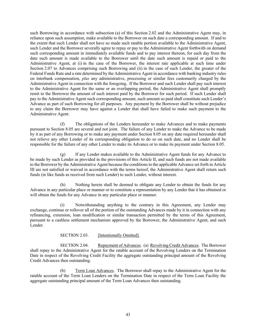 43 such Borrowing in accordance with subsection (a) of this Section 2.02 and the Administrative Agent may, in reliance upon such assumption, make available to the Borrower on such date a corresponding amount. If and to the extent that such Lender shall not have so made such ratable portion available to the Administrative Agent, such Lender and the Borrower severally agree to repay or pay to the Administrative Agent forthwith on demand such corresponding amount in immediately available funds and to pay interest thereon, for each day from the date such amount is made available to the Borrower until the date such amount is repaid or paid to the Administrative Agent, at (i) in the case of the Borrower, the interest rate applicable at such time under Section 2.07 to Advances comprising such Borrowing and (ii) in the case of such Lender, the greater of the Federal Funds Rate and a rate determined by the Administrative Agent in accordance with banking industry rules on interbank compensation, plus any administrative, processing or similar fees customarily charged by the Administrative Agent in connection with the foregoing. If the Borrower and such Lender shall pay such interest to the Administrative Agent for the same or an overlapping period, the Administrative Agent shall promptly remit to the Borrower the amount of such interest paid by the Borrower for such period. If such Lender shall pay to the Administrative Agent such corresponding amount, such amount so paid shall constitute such Lender’s Advance as part of such Borrowing for all purposes. Any payment by the Borrower shall be without prejudice to any claim the Borrower may have against a Lender that shall have failed to make such payment to the Administrative Agent. (f) The obligations of the Lenders hereunder to make Advances and to make payments pursuant to Section 8.05 are several and not joint. The failure of any Lender to make the Advance to be made by it as part of any Borrowing or to make any payment under Section 8.05 on any date required hereunder shall not relieve any other Lender of its corresponding obligation to do so on such date, and no Lender shall be responsible for the failure of any other Lender to make its Advance or to make its payment under Section 8.05. (g) If any Lender makes available to the Administrative Agent funds for any Advance to be made by such Lender as provided in the provisions of this Article II, and such funds are not made available to the Borrower by the Administrative Agent because the conditions to the applicable Advance set forth in Article III are not satisfied or waived in accordance with the terms hereof, the Administrative Agent shall return such funds (in like funds as received from such Lender) to such Lender, without interest. (h) Nothing herein shall be deemed to obligate any Lender to obtain the funds for any Advance in any particular place or manner or to constitute a representation by any Lender that it has obtained or will obtain the funds for any Advance in any particular place or manner. (i) Notwithstanding anything to the contrary in this Agreement, any Lender may exchange, continue or rollover all of the portion of the outstanding Advances made by it in connection with any refinancing, extension, loan modification or similar transaction permitted by the terms of this Agreement, pursuant to a cashless settlement mechanism approved by the Borrower, the Administrative Agent, and such Lender. SECTION 2.03. [Intentionally Omitted]. SECTION 2.04. Repayment of Advances. (a) Revolving Credit Advances. The Borrower shall repay to the Administrative Agent for the ratable account of the Revolving Lenders on the Termination Date in respect of the Revolving Credit Facility the aggregate outstanding principal amount of the Revolving Credit Advances then outstanding. (b) Term Loan Advances. The Borrower shall repay to the Administrative Agent for the ratable account of the Term Loan Lenders on the Termination Date in respect of the Term Loan Facility the aggregate outstanding principal amount of the Term Loan Advances then outstanding.