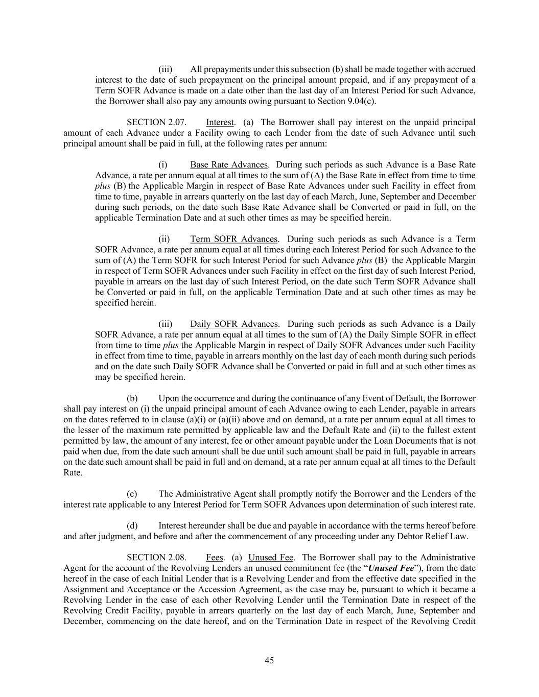45 (iii) All prepayments under this subsection (b) shall be made together with accrued interest to the date of such prepayment on the principal amount prepaid, and if any prepayment of a Term SOFR Advance is made on a date other than the last day of an Interest Period for such Advance, the Borrower shall also pay any amounts owing pursuant to Section 9.04(c). SECTION 2.07. Interest. (a) The Borrower shall pay interest on the unpaid principal amount of each Advance under a Facility owing to each Lender from the date of such Advance until such principal amount shall be paid in full, at the following rates per annum: (i) Base Rate Advances. During such periods as such Advance is a Base Rate Advance, a rate per annum equal at all times to the sum of (A) the Base Rate in effect from time to time plus (B) the Applicable Margin in respect of Base Rate Advances under such Facility in effect from time to time, payable in arrears quarterly on the last day of each March, June, September and December during such periods, on the date such Base Rate Advance shall be Converted or paid in full, on the applicable Termination Date and at such other times as may be specified herein. (ii) Term SOFR Advances. During such periods as such Advance is a Term SOFR Advance, a rate per annum equal at all times during each Interest Period for such Advance to the sum of (A) the Term SOFR for such Interest Period for such Advance plus (B) the Applicable Margin in respect of Term SOFR Advances under such Facility in effect on the first day of such Interest Period, payable in arrears on the last day of such Interest Period, on the date such Term SOFR Advance shall be Converted or paid in full, on the applicable Termination Date and at such other times as may be specified herein. (iii) Daily SOFR Advances. During such periods as such Advance is a Daily SOFR Advance, a rate per annum equal at all times to the sum of (A) the Daily Simple SOFR in effect from time to time plus the Applicable Margin in respect of Daily SOFR Advances under such Facility in effect from time to time, payable in arrears monthly on the last day of each month during such periods and on the date such Daily SOFR Advance shall be Converted or paid in full and at such other times as may be specified herein. (b) Upon the occurrence and during the continuance of any Event of Default, the Borrower shall pay interest on (i) the unpaid principal amount of each Advance owing to each Lender, payable in arrears on the dates referred to in clause (a)(i) or (a)(ii) above and on demand, at a rate per annum equal at all times to the lesser of the maximum rate permitted by applicable law and the Default Rate and (ii) to the fullest extent permitted by law, the amount of any interest, fee or other amount payable under the Loan Documents that is not paid when due, from the date such amount shall be due until such amount shall be paid in full, payable in arrears on the date such amount shall be paid in full and on demand, at a rate per annum equal at all times to the Default Rate. (c) The Administrative Agent shall promptly notify the Borrower and the Lenders of the interest rate applicable to any Interest Period for Term SOFR Advances upon determination of such interest rate. (d) Interest hereunder shall be due and payable in accordance with the terms hereof before and after judgment, and before and after the commencement of any proceeding under any Debtor Relief Law. SECTION 2.08. Fees. (a) Unused Fee. The Borrower shall pay to the Administrative Agent for the account of the Revolving Lenders an unused commitment fee (the “Unused Fee”), from the date hereof in the case of each Initial Lender that is a Revolving Lender and from the effective date specified in the Assignment and Acceptance or the Accession Agreement, as the case may be, pursuant to which it became a Revolving Lender in the case of each other Revolving Lender until the Termination Date in respect of the Revolving Credit Facility, payable in arrears quarterly on the last day of each March, June, September and December, commencing on the date hereof, and on the Termination Date in respect of the Revolving Credit