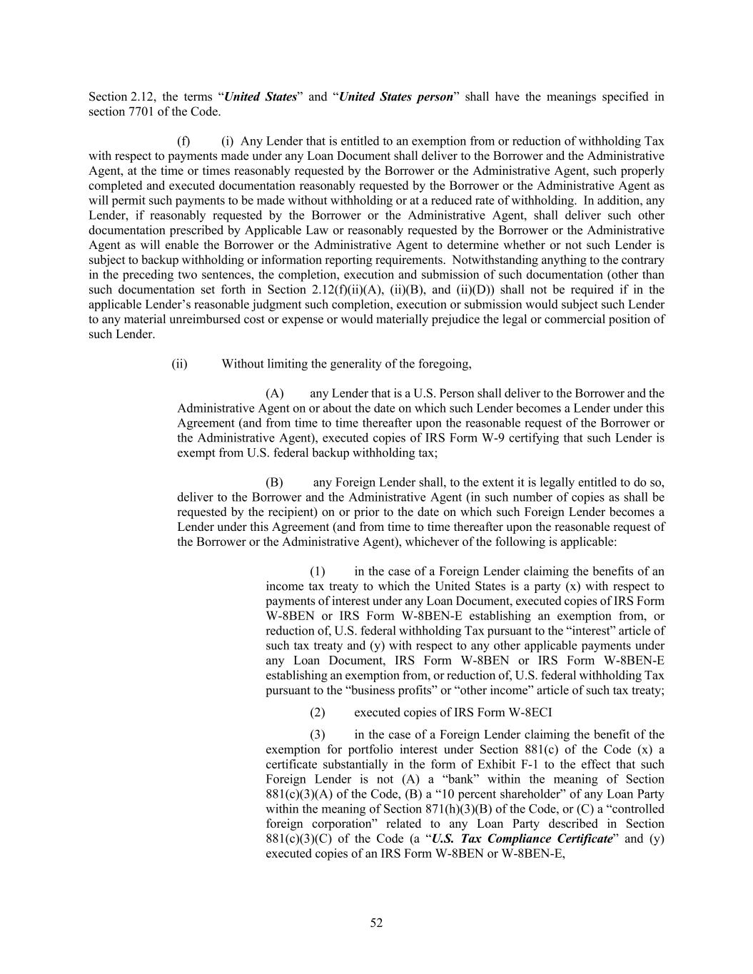 52 Section 2.12, the terms “United States” and “United States person” shall have the meanings specified in section 7701 of the Code. (f) (i) Any Lender that is entitled to an exemption from or reduction of withholding Tax with respect to payments made under any Loan Document shall deliver to the Borrower and the Administrative Agent, at the time or times reasonably requested by the Borrower or the Administrative Agent, such properly completed and executed documentation reasonably requested by the Borrower or the Administrative Agent as will permit such payments to be made without withholding or at a reduced rate of withholding. In addition, any Lender, if reasonably requested by the Borrower or the Administrative Agent, shall deliver such other documentation prescribed by Applicable Law or reasonably requested by the Borrower or the Administrative Agent as will enable the Borrower or the Administrative Agent to determine whether or not such Lender is subject to backup withholding or information reporting requirements. Notwithstanding anything to the contrary in the preceding two sentences, the completion, execution and submission of such documentation (other than such documentation set forth in Section 2.12(f)(ii)(A), (ii)(B), and (ii)(D)) shall not be required if in the applicable Lender’s reasonable judgment such completion, execution or submission would subject such Lender to any material unreimbursed cost or expense or would materially prejudice the legal or commercial position of such Lender. (ii) Without limiting the generality of the foregoing, (A) any Lender that is a U.S. Person shall deliver to the Borrower and the Administrative Agent on or about the date on which such Lender becomes a Lender under this Agreement (and from time to time thereafter upon the reasonable request of the Borrower or the Administrative Agent), executed copies of IRS Form W-9 certifying that such Lender is exempt from U.S. federal backup withholding tax; (B) any Foreign Lender shall, to the extent it is legally entitled to do so, deliver to the Borrower and the Administrative Agent (in such number of copies as shall be requested by the recipient) on or prior to the date on which such Foreign Lender becomes a Lender under this Agreement (and from time to time thereafter upon the reasonable request of the Borrower or the Administrative Agent), whichever of the following is applicable: (1) in the case of a Foreign Lender claiming the benefits of an income tax treaty to which the United States is a party (x) with respect to payments of interest under any Loan Document, executed copies of IRS Form W-8BEN or IRS Form W-8BEN-E establishing an exemption from, or reduction of, U.S. federal withholding Tax pursuant to the “interest” article of such tax treaty and (y) with respect to any other applicable payments under any Loan Document, IRS Form W-8BEN or IRS Form W-8BEN-E establishing an exemption from, or reduction of, U.S. federal withholding Tax pursuant to the “business profits” or “other income” article of such tax treaty; (2) executed copies of IRS Form W-8ECI (3) in the case of a Foreign Lender claiming the benefit of the exemption for portfolio interest under Section 881(c) of the Code (x) a certificate substantially in the form of Exhibit F-1 to the effect that such Foreign Lender is not (A) a “bank” within the meaning of Section 881(c)(3)(A) of the Code, (B) a “10 percent shareholder” of any Loan Party within the meaning of Section 871(h)(3)(B) of the Code, or (C) a “controlled foreign corporation” related to any Loan Party described in Section 881(c)(3)(C) of the Code (a “U.S. Tax Compliance Certificate” and (y) executed copies of an IRS Form W-8BEN or W-8BEN-E,