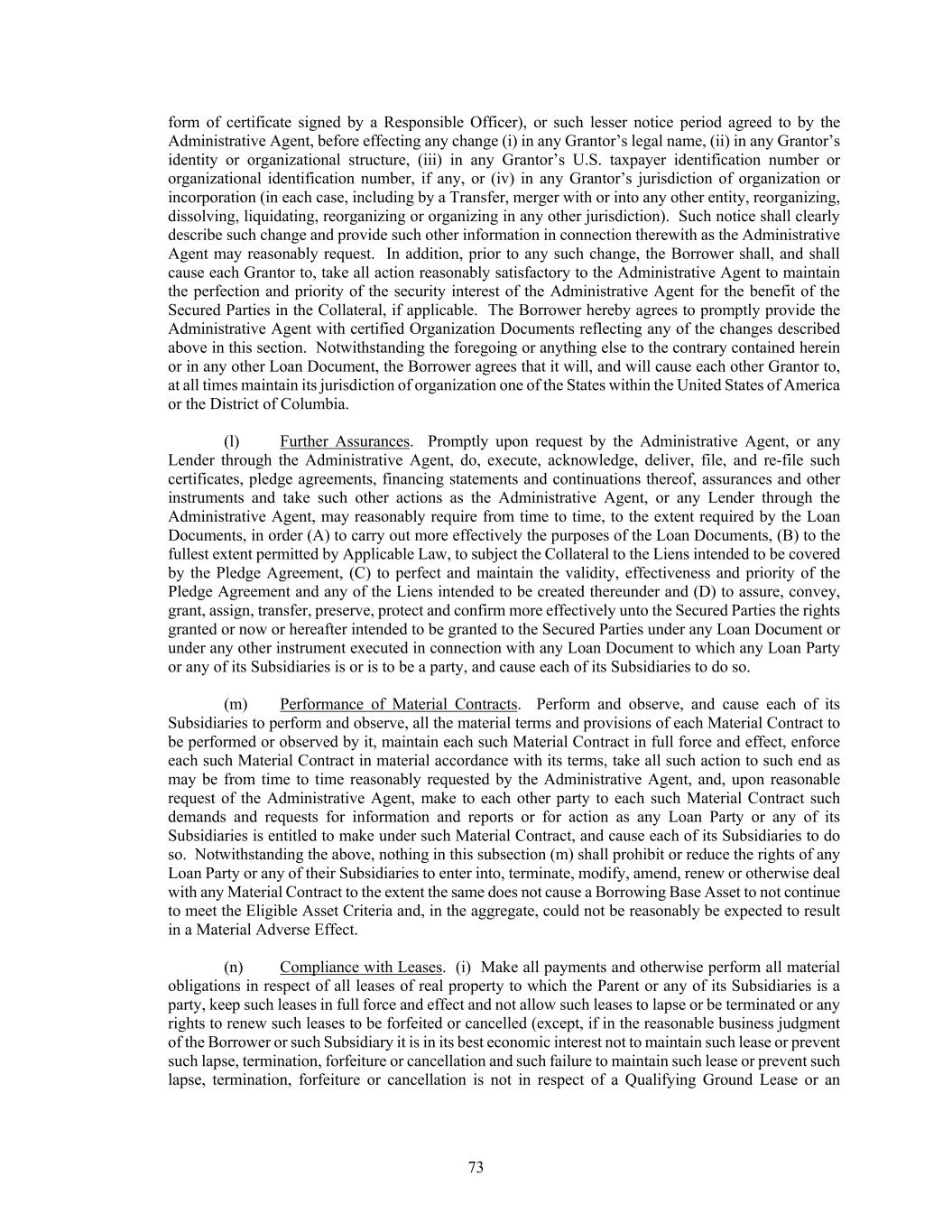 73 form of certificate signed by a Responsible Officer), or such lesser notice period agreed to by the Administrative Agent, before effecting any change (i) in any Grantor’s legal name, (ii) in any Grantor’s identity or organizational structure, (iii) in any Grantor’s U.S. taxpayer identification number or organizational identification number, if any, or (iv) in any Grantor’s jurisdiction of organization or incorporation (in each case, including by a Transfer, merger with or into any other entity, reorganizing, dissolving, liquidating, reorganizing or organizing in any other jurisdiction). Such notice shall clearly describe such change and provide such other information in connection therewith as the Administrative Agent may reasonably request. In addition, prior to any such change, the Borrower shall, and shall cause each Grantor to, take all action reasonably satisfactory to the Administrative Agent to maintain the perfection and priority of the security interest of the Administrative Agent for the benefit of the Secured Parties in the Collateral, if applicable. The Borrower hereby agrees to promptly provide the Administrative Agent with certified Organization Documents reflecting any of the changes described above in this section. Notwithstanding the foregoing or anything else to the contrary contained herein or in any other Loan Document, the Borrower agrees that it will, and will cause each other Grantor to, at all times maintain its jurisdiction of organization one of the States within the United States of America or the District of Columbia. (l) Further Assurances. Promptly upon request by the Administrative Agent, or any Lender through the Administrative Agent, do, execute, acknowledge, deliver, file, and re-file such certificates, pledge agreements, financing statements and continuations thereof, assurances and other instruments and take such other actions as the Administrative Agent, or any Lender through the Administrative Agent, may reasonably require from time to time, to the extent required by the Loan Documents, in order (A) to carry out more effectively the purposes of the Loan Documents, (B) to the fullest extent permitted by Applicable Law, to subject the Collateral to the Liens intended to be covered by the Pledge Agreement, (C) to perfect and maintain the validity, effectiveness and priority of the Pledge Agreement and any of the Liens intended to be created thereunder and (D) to assure, convey, grant, assign, transfer, preserve, protect and confirm more effectively unto the Secured Parties the rights granted or now or hereafter intended to be granted to the Secured Parties under any Loan Document or under any other instrument executed in connection with any Loan Document to which any Loan Party or any of its Subsidiaries is or is to be a party, and cause each of its Subsidiaries to do so. (m) Performance of Material Contracts. Perform and observe, and cause each of its Subsidiaries to perform and observe, all the material terms and provisions of each Material Contract to be performed or observed by it, maintain each such Material Contract in full force and effect, enforce each such Material Contract in material accordance with its terms, take all such action to such end as may be from time to time reasonably requested by the Administrative Agent, and, upon reasonable request of the Administrative Agent, make to each other party to each such Material Contract such demands and requests for information and reports or for action as any Loan Party or any of its Subsidiaries is entitled to make under such Material Contract, and cause each of its Subsidiaries to do so. Notwithstanding the above, nothing in this subsection (m) shall prohibit or reduce the rights of any Loan Party or any of their Subsidiaries to enter into, terminate, modify, amend, renew or otherwise deal with any Material Contract to the extent the same does not cause a Borrowing Base Asset to not continue to meet the Eligible Asset Criteria and, in the aggregate, could not be reasonably be expected to result in a Material Adverse Effect. (n) Compliance with Leases. (i) Make all payments and otherwise perform all material obligations in respect of all leases of real property to which the Parent or any of its Subsidiaries is a party, keep such leases in full force and effect and not allow such leases to lapse or be terminated or any rights to renew such leases to be forfeited or cancelled (except, if in the reasonable business judgment of the Borrower or such Subsidiary it is in its best economic interest not to maintain such lease or prevent such lapse, termination, forfeiture or cancellation and such failure to maintain such lease or prevent such lapse, termination, forfeiture or cancellation is not in respect of a Qualifying Ground Lease or an