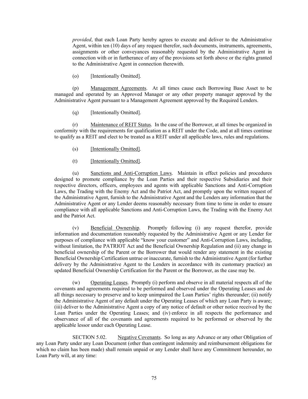 75 provided, that each Loan Party hereby agrees to execute and deliver to the Administrative Agent, within ten (10) days of any request therefor, such documents, instruments, agreements, assignments or other conveyances reasonably requested by the Administrative Agent in connection with or in furtherance of any of the provisions set forth above or the rights granted to the Administrative Agent in connection therewith. (o) [Intentionally Omitted]. (p) Management Agreements. At all times cause each Borrowing Base Asset to be managed and operated by an Approved Manager or any other property manager approved by the Administrative Agent pursuant to a Management Agreement approved by the Required Lenders. (q) [Intentionally Omitted]. (r) Maintenance of REIT Status. In the case of the Borrower, at all times be organized in conformity with the requirements for qualification as a REIT under the Code, and at all times continue to qualify as a REIT and elect to be treated as a REIT under all applicable laws, rules and regulations. (s) [Intentionally Omitted]. (t) [Intentionally Omitted]. (u) Sanctions and Anti-Corruption Laws. Maintain in effect policies and procedures designed to promote compliance by the Loan Parties and their respective Subsidiaries and their respective directors, officers, employees and agents with applicable Sanctions and Anti-Corruption Laws, the Trading with the Enemy Act and the Patriot Act, and promptly upon the written request of the Administrative Agent, furnish to the Administrative Agent and the Lenders any information that the Administrative Agent or any Lender deems reasonably necessary from time to time in order to ensure compliance with all applicable Sanctions and Anti-Corruption Laws, the Trading with the Enemy Act and the Patriot Act. (v) Beneficial Ownership. Promptly following (i) any request therefor, provide information and documentation reasonably requested by the Administrative Agent or any Lender for purposes of compliance with applicable “know your customer” and Anti-Corruption Laws, including, without limitation, the PATRIOT Act and the Beneficial Ownership Regulation and (ii) any change in beneficial ownership of the Parent or the Borrower that would render any statement in the existing Beneficial Ownership Certification untrue or inaccurate, furnish to the Administrative Agent (for further delivery by the Administrative Agent to the Lenders in accordance with its customary practice) an updated Beneficial Ownership Certification for the Parent or the Borrower, as the case may be. (w) Operating Leases. Promptly (i) perform and observe in all material respects all of the covenants and agreements required to be performed and observed under the Operating Leases and do all things necessary to preserve and to keep unimpaired the Loan Parties’ rights thereunder; (ii) notify the Administrative Agent of any default under the Operating Leases of which any Loan Party is aware; (iii) deliver to the Administrative Agent a copy of any notice of default or other notice received by the Loan Parties under the Operating Leases; and (iv) enforce in all respects the performance and observance of all of the covenants and agreements required to be performed or observed by the applicable lessor under each Operating Lease. SECTION 5.02. Negative Covenants. So long as any Advance or any other Obligation of any Loan Party under any Loan Document (other than contingent indemnity and reimbursement obligations for which no claim has been made) shall remain unpaid or any Lender shall have any Commitment hereunder, no Loan Party will, at any time: