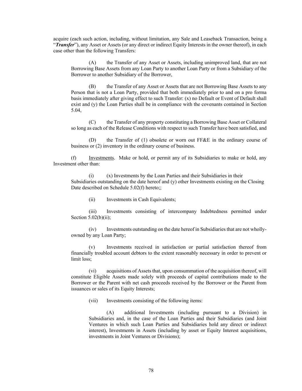 78 acquire (each such action, including, without limitation, any Sale and Leaseback Transaction, being a “Transfer”), any Asset or Assets (or any direct or indirect Equity Interests in the owner thereof), in each case other than the following Transfers: (A) the Transfer of any Asset or Assets, including unimproved land, that are not Borrowing Base Assets from any Loan Party to another Loan Party or from a Subsidiary of the Borrower to another Subsidiary of the Borrower, (B) the Transfer of any Asset or Assets that are not Borrowing Base Assets to any Person that is not a Loan Party, provided that both immediately prior to and on a pro forma basis immediately after giving effect to such Transfer: (x) no Default or Event of Default shall exist and (y) the Loan Parties shall be in compliance with the covenants contained in Section 5.04, (C) the Transfer of any property constituting a Borrowing Base Asset or Collateral so long as each of the Release Conditions with respect to such Transfer have been satisfied, and (D) the Transfer of (1) obsolete or worn out FF&E in the ordinary course of business or (2) inventory in the ordinary course of business. (f) Investments. Make or hold, or permit any of its Subsidiaries to make or hold, any Investment other than: (i) (x) Investments by the Loan Parties and their Subsidiaries in their Subsidiaries outstanding on the date hereof and (y) other Investments existing on the Closing Date described on Schedule 5.02(f) hereto;; (ii) Investments in Cash Equivalents; (iii) Investments consisting of intercompany Indebtedness permitted under Section 5.02(b)(ii); (iv) Investments outstanding on the date hereof in Subsidiaries that are not wholly- owned by any Loan Party; (v) Investments received in satisfaction or partial satisfaction thereof from financially troubled account debtors to the extent reasonably necessary in order to prevent or limit loss; (vi) acquisitions of Assets that, upon consummation of the acquisition thereof, will constitute Eligible Assets made solely with proceeds of capital contributions made to the Borrower or the Parent with net cash proceeds received by the Borrower or the Parent from issuances or sales of its Equity Interests; (vii) Investments consisting of the following items: (A) additional Investments (including pursuant to a Division) in Subsidiaries and, in the case of the Loan Parties and their Subsidiaries (and Joint Ventures in which such Loan Parties and Subsidiaries hold any direct or indirect interest), Investments in Assets (including by asset or Equity Interest acquisitions, investments in Joint Ventures or Divisions);