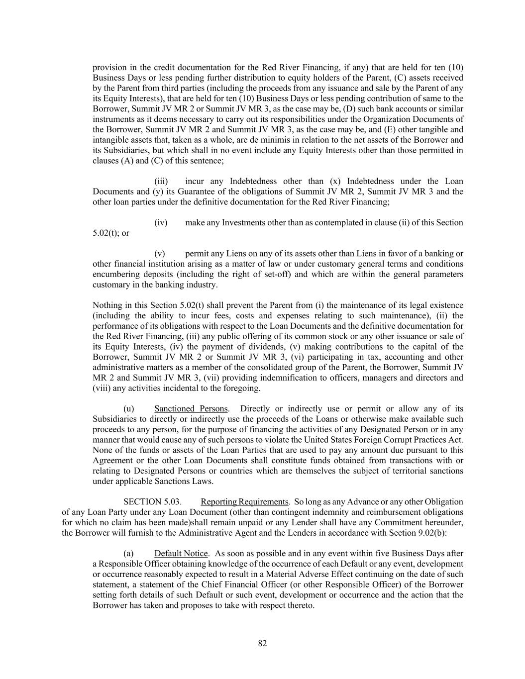 82 provision in the credit documentation for the Red River Financing, if any) that are held for ten (10) Business Days or less pending further distribution to equity holders of the Parent, (C) assets received by the Parent from third parties (including the proceeds from any issuance and sale by the Parent of any its Equity Interests), that are held for ten (10) Business Days or less pending contribution of same to the Borrower, Summit JV MR 2 or Summit JV MR 3, as the case may be, (D) such bank accounts or similar instruments as it deems necessary to carry out its responsibilities under the Organization Documents of the Borrower, Summit JV MR 2 and Summit JV MR 3, as the case may be, and (E) other tangible and intangible assets that, taken as a whole, are de minimis in relation to the net assets of the Borrower and its Subsidiaries, but which shall in no event include any Equity Interests other than those permitted in clauses (A) and (C) of this sentence; (iii) incur any Indebtedness other than (x) Indebtedness under the Loan Documents and (y) its Guarantee of the obligations of Summit JV MR 2, Summit JV MR 3 and the other loan parties under the definitive documentation for the Red River Financing; (iv) make any Investments other than as contemplated in clause (ii) of this Section 5.02(t); or (v) permit any Liens on any of its assets other than Liens in favor of a banking or other financial institution arising as a matter of law or under customary general terms and conditions encumbering deposits (including the right of set-off) and which are within the general parameters customary in the banking industry. Nothing in this Section 5.02(t) shall prevent the Parent from (i) the maintenance of its legal existence (including the ability to incur fees, costs and expenses relating to such maintenance), (ii) the performance of its obligations with respect to the Loan Documents and the definitive documentation for the Red River Financing, (iii) any public offering of its common stock or any other issuance or sale of its Equity Interests, (iv) the payment of dividends, (v) making contributions to the capital of the Borrower, Summit JV MR 2 or Summit JV MR 3, (vi) participating in tax, accounting and other administrative matters as a member of the consolidated group of the Parent, the Borrower, Summit JV MR 2 and Summit JV MR 3, (vii) providing indemnification to officers, managers and directors and (viii) any activities incidental to the foregoing. (u) Sanctioned Persons. Directly or indirectly use or permit or allow any of its Subsidiaries to directly or indirectly use the proceeds of the Loans or otherwise make available such proceeds to any person, for the purpose of financing the activities of any Designated Person or in any manner that would cause any of such persons to violate the United States Foreign Corrupt Practices Act. None of the funds or assets of the Loan Parties that are used to pay any amount due pursuant to this Agreement or the other Loan Documents shall constitute funds obtained from transactions with or relating to Designated Persons or countries which are themselves the subject of territorial sanctions under applicable Sanctions Laws. SECTION 5.03. Reporting Requirements. So long as any Advance or any other Obligation of any Loan Party under any Loan Document (other than contingent indemnity and reimbursement obligations for which no claim has been made)shall remain unpaid or any Lender shall have any Commitment hereunder, the Borrower will furnish to the Administrative Agent and the Lenders in accordance with Section 9.02(b): (a) Default Notice. As soon as possible and in any event within five Business Days after a Responsible Officer obtaining knowledge of the occurrence of each Default or any event, development or occurrence reasonably expected to result in a Material Adverse Effect continuing on the date of such statement, a statement of the Chief Financial Officer (or other Responsible Officer) of the Borrower setting forth details of such Default or such event, development or occurrence and the action that the Borrower has taken and proposes to take with respect thereto.