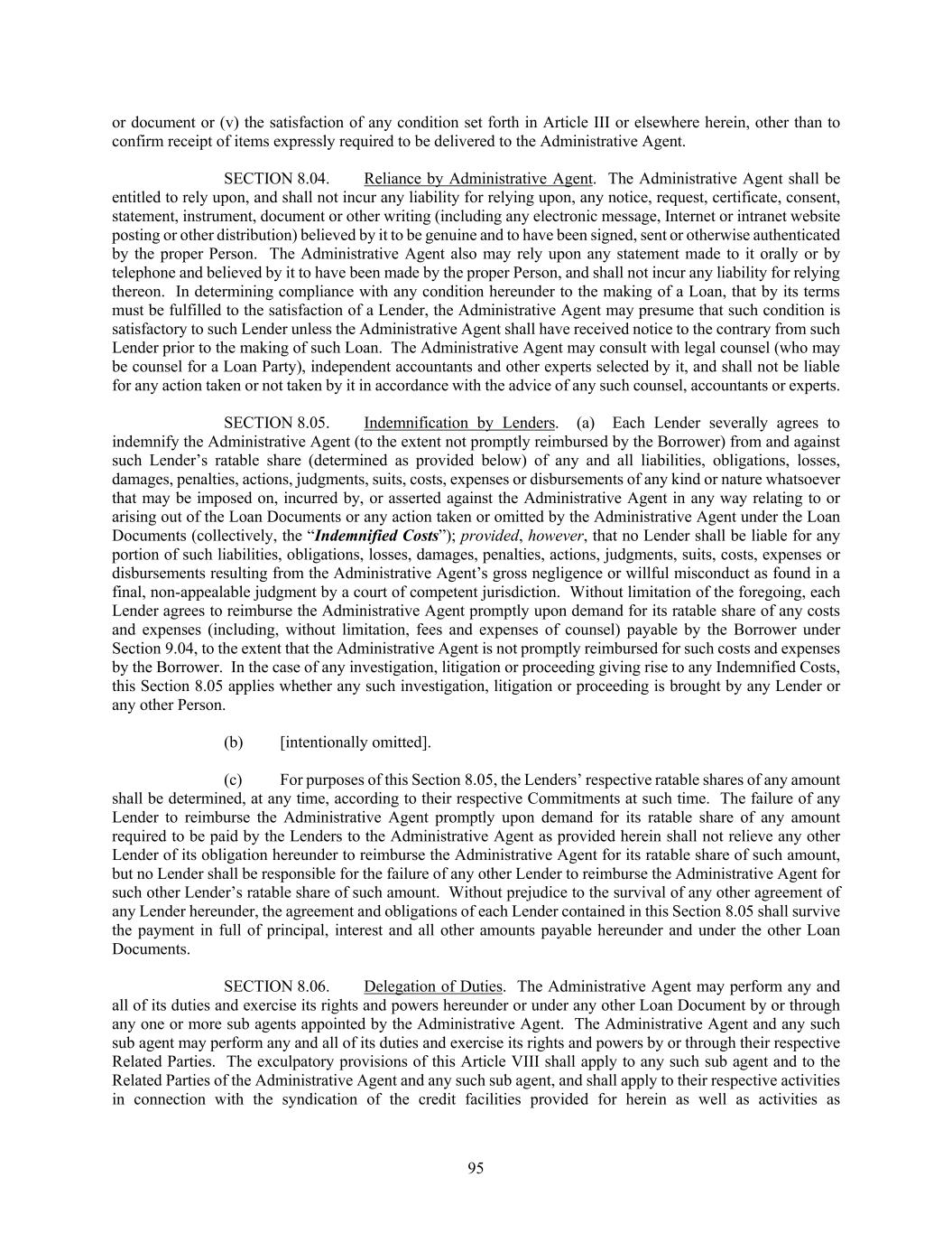 95 or document or (v) the satisfaction of any condition set forth in Article III or elsewhere herein, other than to confirm receipt of items expressly required to be delivered to the Administrative Agent. SECTION 8.04. Reliance by Administrative Agent. The Administrative Agent shall be entitled to rely upon, and shall not incur any liability for relying upon, any notice, request, certificate, consent, statement, instrument, document or other writing (including any electronic message, Internet or intranet website posting or other distribution) believed by it to be genuine and to have been signed, sent or otherwise authenticated by the proper Person. The Administrative Agent also may rely upon any statement made to it orally or by telephone and believed by it to have been made by the proper Person, and shall not incur any liability for relying thereon. In determining compliance with any condition hereunder to the making of a Loan, that by its terms must be fulfilled to the satisfaction of a Lender, the Administrative Agent may presume that such condition is satisfactory to such Lender unless the Administrative Agent shall have received notice to the contrary from such Lender prior to the making of such Loan. The Administrative Agent may consult with legal counsel (who may be counsel for a Loan Party), independent accountants and other experts selected by it, and shall not be liable for any action taken or not taken by it in accordance with the advice of any such counsel, accountants or experts. SECTION 8.05. Indemnification by Lenders. (a) Each Lender severally agrees to indemnify the Administrative Agent (to the extent not promptly reimbursed by the Borrower) from and against such Lender’s ratable share (determined as provided below) of any and all liabilities, obligations, losses, damages, penalties, actions, judgments, suits, costs, expenses or disbursements of any kind or nature whatsoever that may be imposed on, incurred by, or asserted against the Administrative Agent in any way relating to or arising out of the Loan Documents or any action taken or omitted by the Administrative Agent under the Loan Documents (collectively, the “Indemnified Costs”); provided, however, that no Lender shall be liable for any portion of such liabilities, obligations, losses, damages, penalties, actions, judgments, suits, costs, expenses or disbursements resulting from the Administrative Agent’s gross negligence or willful misconduct as found in a final, non-appealable judgment by a court of competent jurisdiction. Without limitation of the foregoing, each Lender agrees to reimburse the Administrative Agent promptly upon demand for its ratable share of any costs and expenses (including, without limitation, fees and expenses of counsel) payable by the Borrower under Section 9.04, to the extent that the Administrative Agent is not promptly reimbursed for such costs and expenses by the Borrower. In the case of any investigation, litigation or proceeding giving rise to any Indemnified Costs, this Section 8.05 applies whether any such investigation, litigation or proceeding is brought by any Lender or any other Person. (b) [intentionally omitted]. (c) For purposes of this Section 8.05, the Lenders’ respective ratable shares of any amount shall be determined, at any time, according to their respective Commitments at such time. The failure of any Lender to reimburse the Administrative Agent promptly upon demand for its ratable share of any amount required to be paid by the Lenders to the Administrative Agent as provided herein shall not relieve any other Lender of its obligation hereunder to reimburse the Administrative Agent for its ratable share of such amount, but no Lender shall be responsible for the failure of any other Lender to reimburse the Administrative Agent for such other Lender’s ratable share of such amount. Without prejudice to the survival of any other agreement of any Lender hereunder, the agreement and obligations of each Lender contained in this Section 8.05 shall survive the payment in full of principal, interest and all other amounts payable hereunder and under the other Loan Documents. SECTION 8.06. Delegation of Duties. The Administrative Agent may perform any and all of its duties and exercise its rights and powers hereunder or under any other Loan Document by or through any one or more sub agents appointed by the Administrative Agent. The Administrative Agent and any such sub agent may perform any and all of its duties and exercise its rights and powers by or through their respective Related Parties. The exculpatory provisions of this Article VIII shall apply to any such sub agent and to the Related Parties of the Administrative Agent and any such sub agent, and shall apply to their respective activities in connection with the syndication of the credit facilities provided for herein as well as activities as