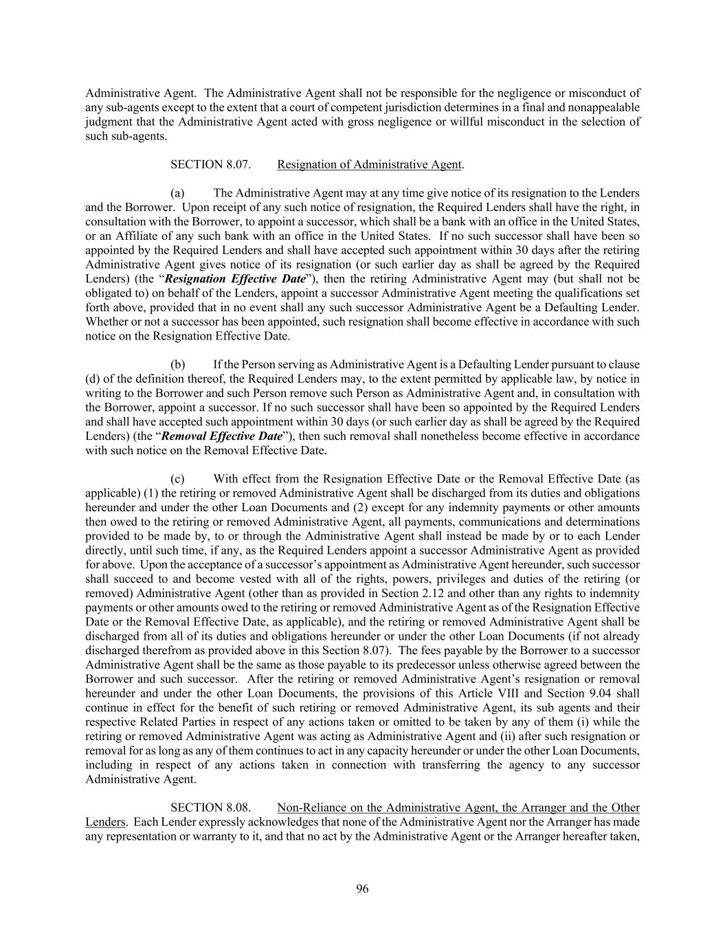 96 Administrative Agent. The Administrative Agent shall not be responsible for the negligence or misconduct of any sub-agents except to the extent that a court of competent jurisdiction determines in a final and nonappealable judgment that the Administrative Agent acted with gross negligence or willful misconduct in the selection of such sub-agents. SECTION 8.07. Resignation of Administrative Agent. (a) The Administrative Agent may at any time give notice of its resignation to the Lenders and the Borrower. Upon receipt of any such notice of resignation, the Required Lenders shall have the right, in consultation with the Borrower, to appoint a successor, which shall be a bank with an office in the United States, or an Affiliate of any such bank with an office in the United States. If no such successor shall have been so appointed by the Required Lenders and shall have accepted such appointment within 30 days after the retiring Administrative Agent gives notice of its resignation (or such earlier day as shall be agreed by the Required Lenders) (the “Resignation Effective Date”), then the retiring Administrative Agent may (but shall not be obligated to) on behalf of the Lenders, appoint a successor Administrative Agent meeting the qualifications set forth above, provided that in no event shall any such successor Administrative Agent be a Defaulting Lender. Whether or not a successor has been appointed, such resignation shall become effective in accordance with such notice on the Resignation Effective Date. (b) If the Person serving as Administrative Agent is a Defaulting Lender pursuant to clause (d) of the definition thereof, the Required Lenders may, to the extent permitted by applicable law, by notice in writing to the Borrower and such Person remove such Person as Administrative Agent and, in consultation with the Borrower, appoint a successor. If no such successor shall have been so appointed by the Required Lenders and shall have accepted such appointment within 30 days (or such earlier day as shall be agreed by the Required Lenders) (the “Removal Effective Date”), then such removal shall nonetheless become effective in accordance with such notice on the Removal Effective Date. (c) With effect from the Resignation Effective Date or the Removal Effective Date (as applicable) (1) the retiring or removed Administrative Agent shall be discharged from its duties and obligations hereunder and under the other Loan Documents and (2) except for any indemnity payments or other amounts then owed to the retiring or removed Administrative Agent, all payments, communications and determinations provided to be made by, to or through the Administrative Agent shall instead be made by or to each Lender directly, until such time, if any, as the Required Lenders appoint a successor Administrative Agent as provided for above. Upon the acceptance of a successor’s appointment as Administrative Agent hereunder, such successor shall succeed to and become vested with all of the rights, powers, privileges and duties of the retiring (or removed) Administrative Agent (other than as provided in Section 2.12 and other than any rights to indemnity payments or other amounts owed to the retiring or removed Administrative Agent as of the Resignation Effective Date or the Removal Effective Date, as applicable), and the retiring or removed Administrative Agent shall be discharged from all of its duties and obligations hereunder or under the other Loan Documents (if not already discharged therefrom as provided above in this Section 8.07). The fees payable by the Borrower to a successor Administrative Agent shall be the same as those payable to its predecessor unless otherwise agreed between the Borrower and such successor. After the retiring or removed Administrative Agent’s resignation or removal hereunder and under the other Loan Documents, the provisions of this Article VIII and Section 9.04 shall continue in effect for the benefit of such retiring or removed Administrative Agent, its sub agents and their respective Related Parties in respect of any actions taken or omitted to be taken by any of them (i) while the retiring or removed Administrative Agent was acting as Administrative Agent and (ii) after such resignation or removal for as long as any of them continues to act in any capacity hereunder or under the other Loan Documents, including in respect of any actions taken in connection with transferring the agency to any successor Administrative Agent. SECTION 8.08. Non-Reliance on the Administrative Agent, the Arranger and the Other Lenders. Each Lender expressly acknowledges that none of the Administrative Agent nor the Arranger has made any representation or warranty to it, and that no act by the Administrative Agent or the Arranger hereafter taken,