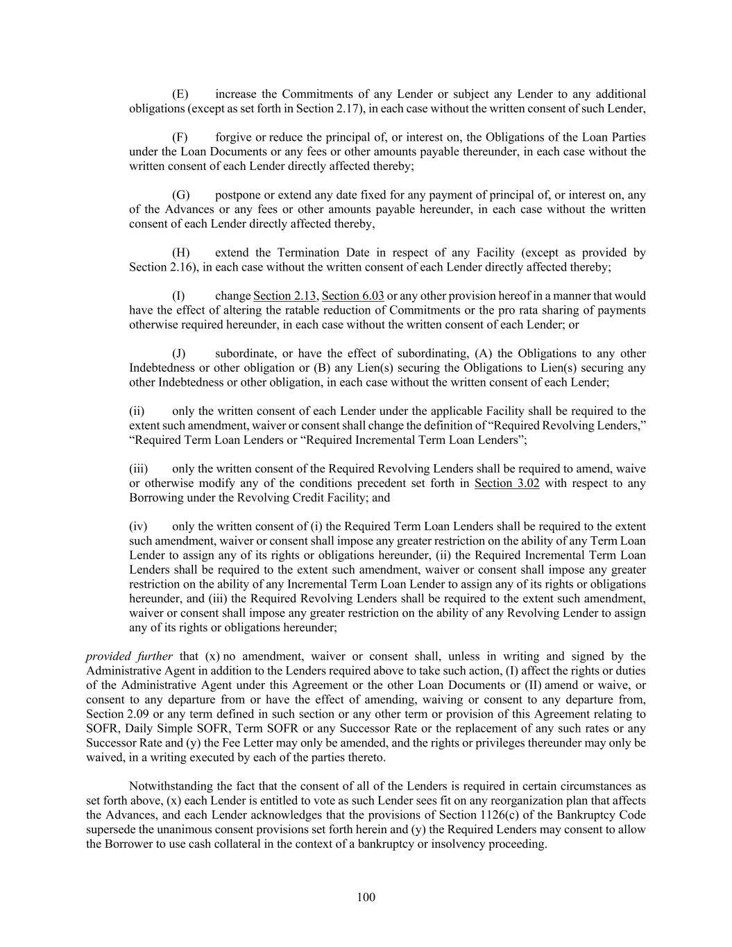 100 (E) increase the Commitments of any Lender or subject any Lender to any additional obligations (except as set forth in Section 2.17), in each case without the written consent of such Lender, (F) forgive or reduce the principal of, or interest on, the Obligations of the Loan Parties under the Loan Documents or any fees or other amounts payable thereunder, in each case without the written consent of each Lender directly affected thereby; (G) postpone or extend any date fixed for any payment of principal of, or interest on, any of the Advances or any fees or other amounts payable hereunder, in each case without the written consent of each Lender directly affected thereby, (H) extend the Termination Date in respect of any Facility (except as provided by Section 2.16), in each case without the written consent of each Lender directly affected thereby; (I) change Section 2.13, Section 6.03 or any other provision hereof in a manner that would have the effect of altering the ratable reduction of Commitments or the pro rata sharing of payments otherwise required hereunder, in each case without the written consent of each Lender; or (J) subordinate, or have the effect of subordinating, (A) the Obligations to any other Indebtedness or other obligation or (B) any Lien(s) securing the Obligations to Lien(s) securing any other Indebtedness or other obligation, in each case without the written consent of each Lender; (ii) only the written consent of each Lender under the applicable Facility shall be required to the extent such amendment, waiver or consent shall change the definition of “Required Revolving Lenders,” “Required Term Loan Lenders or “Required Incremental Term Loan Lenders”; (iii) only the written consent of the Required Revolving Lenders shall be required to amend, waive or otherwise modify any of the conditions precedent set forth in Section 3.02 with respect to any Borrowing under the Revolving Credit Facility; and (iv) only the written consent of (i) the Required Term Loan Lenders shall be required to the extent such amendment, waiver or consent shall impose any greater restriction on the ability of any Term Loan Lender to assign any of its rights or obligations hereunder, (ii) the Required Incremental Term Loan Lenders shall be required to the extent such amendment, waiver or consent shall impose any greater restriction on the ability of any Incremental Term Loan Lender to assign any of its rights or obligations hereunder, and (iii) the Required Revolving Lenders shall be required to the extent such amendment, waiver or consent shall impose any greater restriction on the ability of any Revolving Lender to assign any of its rights or obligations hereunder; provided further that (x) no amendment, waiver or consent shall, unless in writing and signed by the Administrative Agent in addition to the Lenders required above to take such action, (I) affect the rights or duties of the Administrative Agent under this Agreement or the other Loan Documents or (II) amend or waive, or consent to any departure from or have the effect of amending, waiving or consent to any departure from, Section 2.09 or any term defined in such section or any other term or provision of this Agreement relating to SOFR, Daily Simple SOFR, Term SOFR or any Successor Rate or the replacement of any such rates or any Successor Rate and (y) the Fee Letter may only be amended, and the rights or privileges thereunder may only be waived, in a writing executed by each of the parties thereto. Notwithstanding the fact that the consent of all of the Lenders is required in certain circumstances as set forth above, (x) each Lender is entitled to vote as such Lender sees fit on any reorganization plan that affects the Advances, and each Lender acknowledges that the provisions of Section 1126(c) of the Bankruptcy Code supersede the unanimous consent provisions set forth herein and (y) the Required Lenders may consent to allow the Borrower to use cash collateral in the context of a bankruptcy or insolvency proceeding.