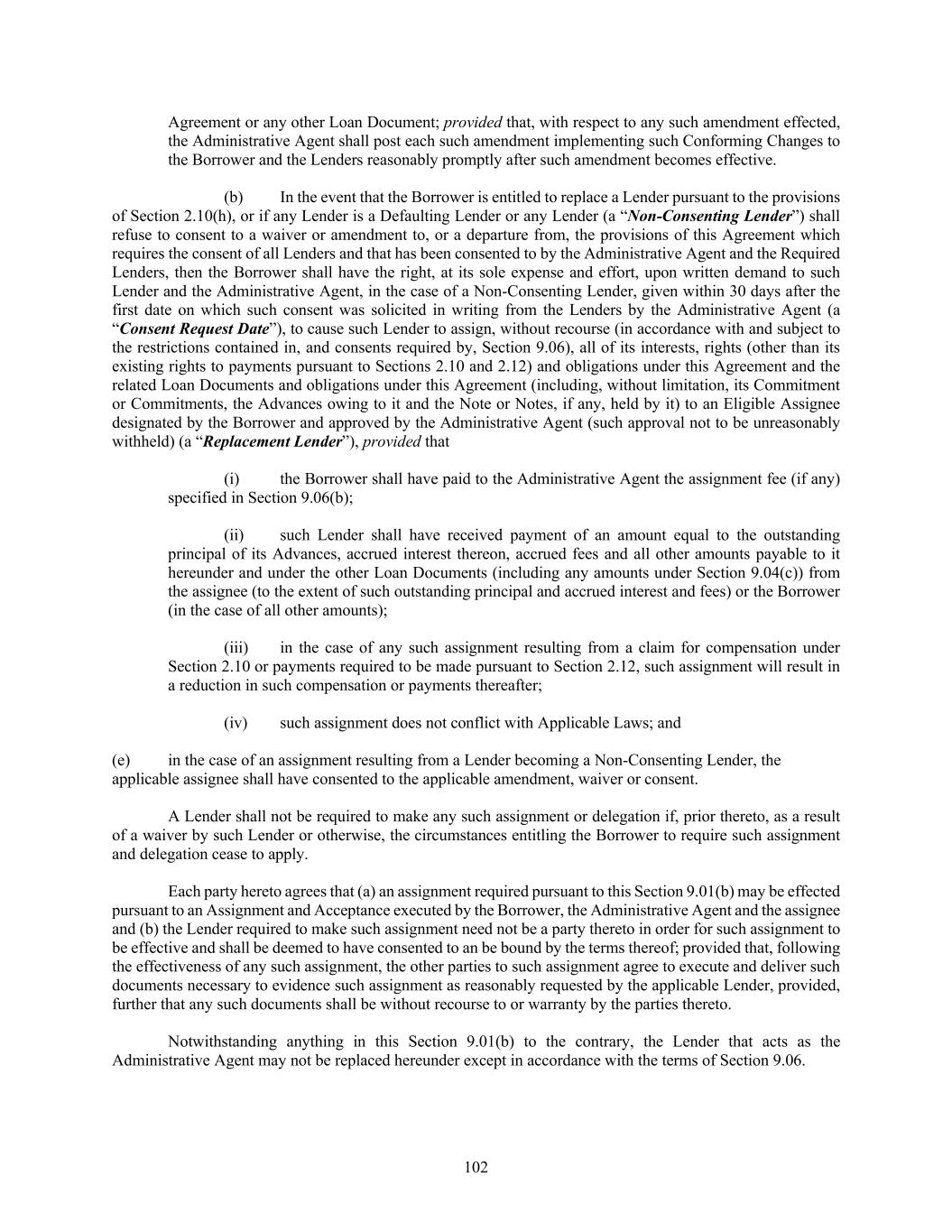 102 Agreement or any other Loan Document; provided that, with respect to any such amendment effected, the Administrative Agent shall post each such amendment implementing such Conforming Changes to the Borrower and the Lenders reasonably promptly after such amendment becomes effective. (b) In the event that the Borrower is entitled to replace a Lender pursuant to the provisions of Section 2.10(h), or if any Lender is a Defaulting Lender or any Lender (a “Non-Consenting Lender”) shall refuse to consent to a waiver or amendment to, or a departure from, the provisions of this Agreement which requires the consent of all Lenders and that has been consented to by the Administrative Agent and the Required Lenders, then the Borrower shall have the right, at its sole expense and effort, upon written demand to such Lender and the Administrative Agent, in the case of a Non-Consenting Lender, given within 30 days after the first date on which such consent was solicited in writing from the Lenders by the Administrative Agent (a “Consent Request Date”), to cause such Lender to assign, without recourse (in accordance with and subject to the restrictions contained in, and consents required by, Section 9.06), all of its interests, rights (other than its existing rights to payments pursuant to Sections 2.10 and 2.12) and obligations under this Agreement and the related Loan Documents and obligations under this Agreement (including, without limitation, its Commitment or Commitments, the Advances owing to it and the Note or Notes, if any, held by it) to an Eligible Assignee designated by the Borrower and approved by the Administrative Agent (such approval not to be unreasonably withheld) (a “Replacement Lender”), provided that (i) the Borrower shall have paid to the Administrative Agent the assignment fee (if any) specified in Section 9.06(b); (ii) such Lender shall have received payment of an amount equal to the outstanding principal of its Advances, accrued interest thereon, accrued fees and all other amounts payable to it hereunder and under the other Loan Documents (including any amounts under Section 9.04(c)) from the assignee (to the extent of such outstanding principal and accrued interest and fees) or the Borrower (in the case of all other amounts); (iii) in the case of any such assignment resulting from a claim for compensation under Section 2.10 or payments required to be made pursuant to Section 2.12, such assignment will result in a reduction in such compensation or payments thereafter; (iv) such assignment does not conflict with Applicable Laws; and (e) in the case of an assignment resulting from a Lender becoming a Non-Consenting Lender, the applicable assignee shall have consented to the applicable amendment, waiver or consent. A Lender shall not be required to make any such assignment or delegation if, prior thereto, as a result of a waiver by such Lender or otherwise, the circumstances entitling the Borrower to require such assignment and delegation cease to apply. Each party hereto agrees that (a) an assignment required pursuant to this Section 9.01(b) may be effected pursuant to an Assignment and Acceptance executed by the Borrower, the Administrative Agent and the assignee and (b) the Lender required to make such assignment need not be a party thereto in order for such assignment to be effective and shall be deemed to have consented to an be bound by the terms thereof; provided that, following the effectiveness of any such assignment, the other parties to such assignment agree to execute and deliver such documents necessary to evidence such assignment as reasonably requested by the applicable Lender, provided, further that any such documents shall be without recourse to or warranty by the parties thereto. Notwithstanding anything in this Section 9.01(b) to the contrary, the Lender that acts as the Administrative Agent may not be replaced hereunder except in accordance with the terms of Section 9.06.