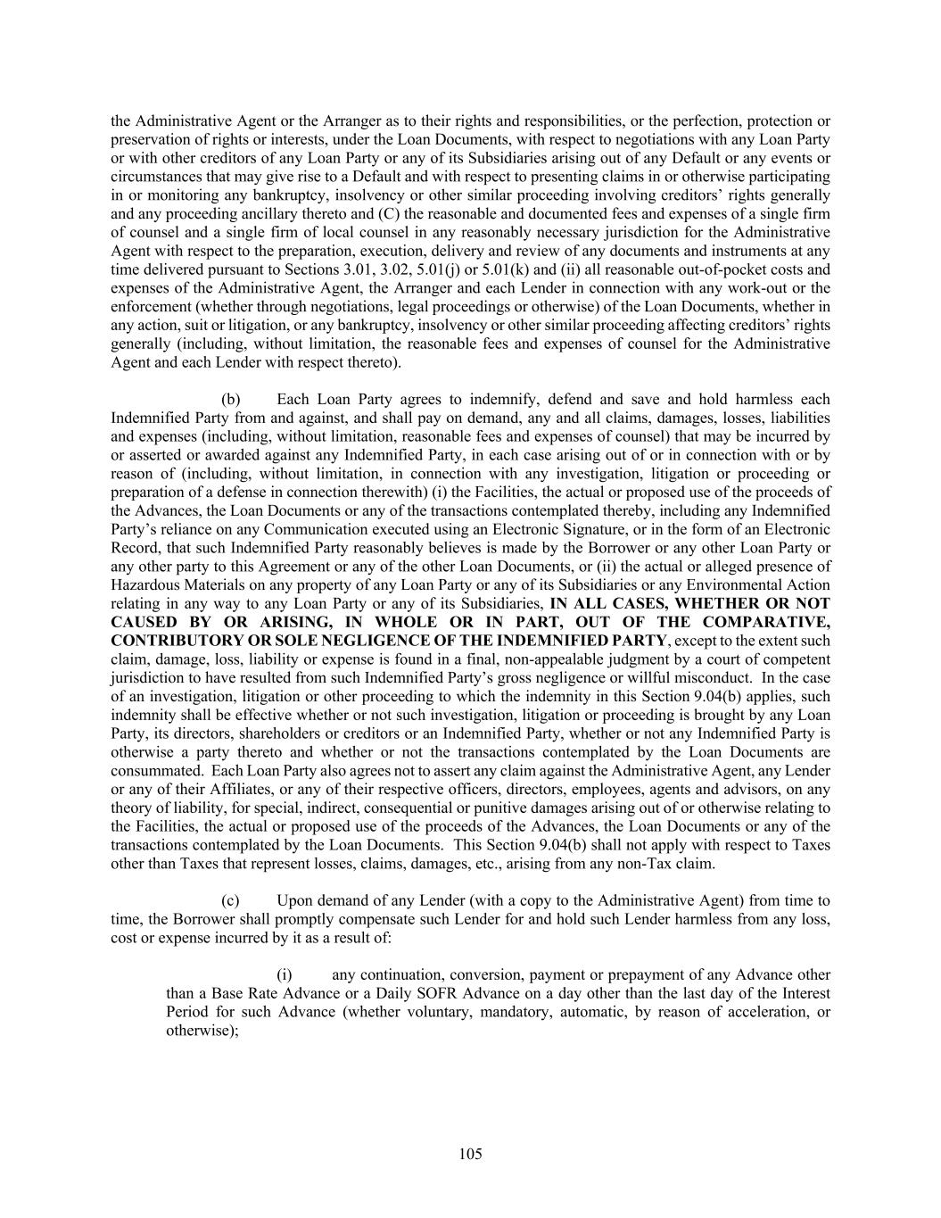 105 the Administrative Agent or the Arranger as to their rights and responsibilities, or the perfection, protection or preservation of rights or interests, under the Loan Documents, with respect to negotiations with any Loan Party or with other creditors of any Loan Party or any of its Subsidiaries arising out of any Default or any events or circumstances that may give rise to a Default and with respect to presenting claims in or otherwise participating in or monitoring any bankruptcy, insolvency or other similar proceeding involving creditors’ rights generally and any proceeding ancillary thereto and (C) the reasonable and documented fees and expenses of a single firm of counsel and a single firm of local counsel in any reasonably necessary jurisdiction for the Administrative Agent with respect to the preparation, execution, delivery and review of any documents and instruments at any time delivered pursuant to Sections 3.01, 3.02, 5.01(j) or 5.01(k) and (ii) all reasonable out-of-pocket costs and expenses of the Administrative Agent, the Arranger and each Lender in connection with any work-out or the enforcement (whether through negotiations, legal proceedings or otherwise) of the Loan Documents, whether in any action, suit or litigation, or any bankruptcy, insolvency or other similar proceeding affecting creditors’ rights generally (including, without limitation, the reasonable fees and expenses of counsel for the Administrative Agent and each Lender with respect thereto). (b) Each Loan Party agrees to indemnify, defend and save and hold harmless each Indemnified Party from and against, and shall pay on demand, any and all claims, damages, losses, liabilities and expenses (including, without limitation, reasonable fees and expenses of counsel) that may be incurred by or asserted or awarded against any Indemnified Party, in each case arising out of or in connection with or by reason of (including, without limitation, in connection with any investigation, litigation or proceeding or preparation of a defense in connection therewith) (i) the Facilities, the actual or proposed use of the proceeds of the Advances, the Loan Documents or any of the transactions contemplated thereby, including any Indemnified Party’s reliance on any Communication executed using an Electronic Signature, or in the form of an Electronic Record, that such Indemnified Party reasonably believes is made by the Borrower or any other Loan Party or any other party to this Agreement or any of the other Loan Documents, or (ii) the actual or alleged presence of Hazardous Materials on any property of any Loan Party or any of its Subsidiaries or any Environmental Action relating in any way to any Loan Party or any of its Subsidiaries, IN ALL CASES, WHETHER OR NOT CAUSED BY OR ARISING, IN WHOLE OR IN PART, OUT OF THE COMPARATIVE, CONTRIBUTORY OR SOLE NEGLIGENCE OF THE INDEMNIFIED PARTY, except to the extent such claim, damage, loss, liability or expense is found in a final, non-appealable judgment by a court of competent jurisdiction to have resulted from such Indemnified Party’s gross negligence or willful misconduct. In the case of an investigation, litigation or other proceeding to which the indemnity in this Section 9.04(b) applies, such indemnity shall be effective whether or not such investigation, litigation or proceeding is brought by any Loan Party, its directors, shareholders or creditors or an Indemnified Party, whether or not any Indemnified Party is otherwise a party thereto and whether or not the transactions contemplated by the Loan Documents are consummated. Each Loan Party also agrees not to assert any claim against the Administrative Agent, any Lender or any of their Affiliates, or any of their respective officers, directors, employees, agents and advisors, on any theory of liability, for special, indirect, consequential or punitive damages arising out of or otherwise relating to the Facilities, the actual or proposed use of the proceeds of the Advances, the Loan Documents or any of the transactions contemplated by the Loan Documents. This Section 9.04(b) shall not apply with respect to Taxes other than Taxes that represent losses, claims, damages, etc., arising from any non-Tax claim. (c) Upon demand of any Lender (with a copy to the Administrative Agent) from time to time, the Borrower shall promptly compensate such Lender for and hold such Lender harmless from any loss, cost or expense incurred by it as a result of: (i) any continuation, conversion, payment or prepayment of any Advance other than a Base Rate Advance or a Daily SOFR Advance on a day other than the last day of the Interest Period for such Advance (whether voluntary, mandatory, automatic, by reason of acceleration, or otherwise);