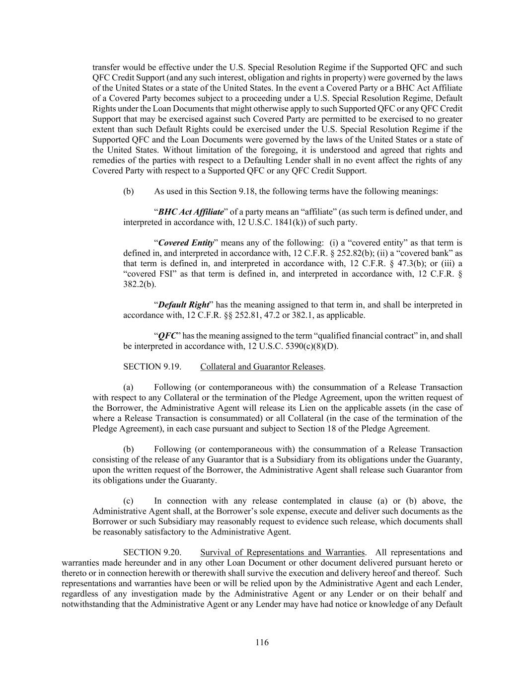 116 transfer would be effective under the U.S. Special Resolution Regime if the Supported QFC and such QFC Credit Support (and any such interest, obligation and rights in property) were governed by the laws of the United States or a state of the United States. In the event a Covered Party or a BHC Act Affiliate of a Covered Party becomes subject to a proceeding under a U.S. Special Resolution Regime, Default Rights under the Loan Documents that might otherwise apply to such Supported QFC or any QFC Credit Support that may be exercised against such Covered Party are permitted to be exercised to no greater extent than such Default Rights could be exercised under the U.S. Special Resolution Regime if the Supported QFC and the Loan Documents were governed by the laws of the United States or a state of the United States. Without limitation of the foregoing, it is understood and agreed that rights and remedies of the parties with respect to a Defaulting Lender shall in no event affect the rights of any Covered Party with respect to a Supported QFC or any QFC Credit Support. (b) As used in this Section 9.18, the following terms have the following meanings: “BHC Act Affiliate” of a party means an “affiliate” (as such term is defined under, and interpreted in accordance with, 12 U.S.C. 1841(k)) of such party. “Covered Entity” means any of the following: (i) a “covered entity” as that term is defined in, and interpreted in accordance with, 12 C.F.R. § 252.82(b); (ii) a “covered bank” as that term is defined in, and interpreted in accordance with, 12 C.F.R. § 47.3(b); or (iii) a “covered FSI” as that term is defined in, and interpreted in accordance with, 12 C.F.R. § 382.2(b). “Default Right” has the meaning assigned to that term in, and shall be interpreted in accordance with, 12 C.F.R. §§ 252.81, 47.2 or 382.1, as applicable. “QFC” has the meaning assigned to the term “qualified financial contract” in, and shall be interpreted in accordance with, 12 U.S.C. 5390(c)(8)(D). SECTION 9.19. Collateral and Guarantor Releases. (a) Following (or contemporaneous with) the consummation of a Release Transaction with respect to any Collateral or the termination of the Pledge Agreement, upon the written request of the Borrower, the Administrative Agent will release its Lien on the applicable assets (in the case of where a Release Transaction is consummated) or all Collateral (in the case of the termination of the Pledge Agreement), in each case pursuant and subject to Section 18 of the Pledge Agreement. (b) Following (or contemporaneous with) the consummation of a Release Transaction consisting of the release of any Guarantor that is a Subsidiary from its obligations under the Guaranty, upon the written request of the Borrower, the Administrative Agent shall release such Guarantor from its obligations under the Guaranty. (c) In connection with any release contemplated in clause (a) or (b) above, the Administrative Agent shall, at the Borrower’s sole expense, execute and deliver such documents as the Borrower or such Subsidiary may reasonably request to evidence such release, which documents shall be reasonably satisfactory to the Administrative Agent. SECTION 9.20. Survival of Representations and Warranties. All representations and warranties made hereunder and in any other Loan Document or other document delivered pursuant hereto or thereto or in connection herewith or therewith shall survive the execution and delivery hereof and thereof. Such representations and warranties have been or will be relied upon by the Administrative Agent and each Lender, regardless of any investigation made by the Administrative Agent or any Lender or on their behalf and notwithstanding that the Administrative Agent or any Lender may have had notice or knowledge of any Default