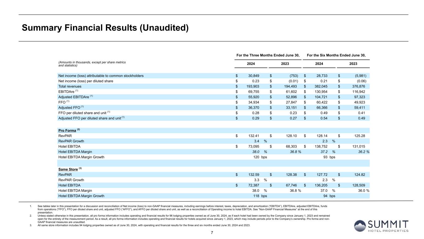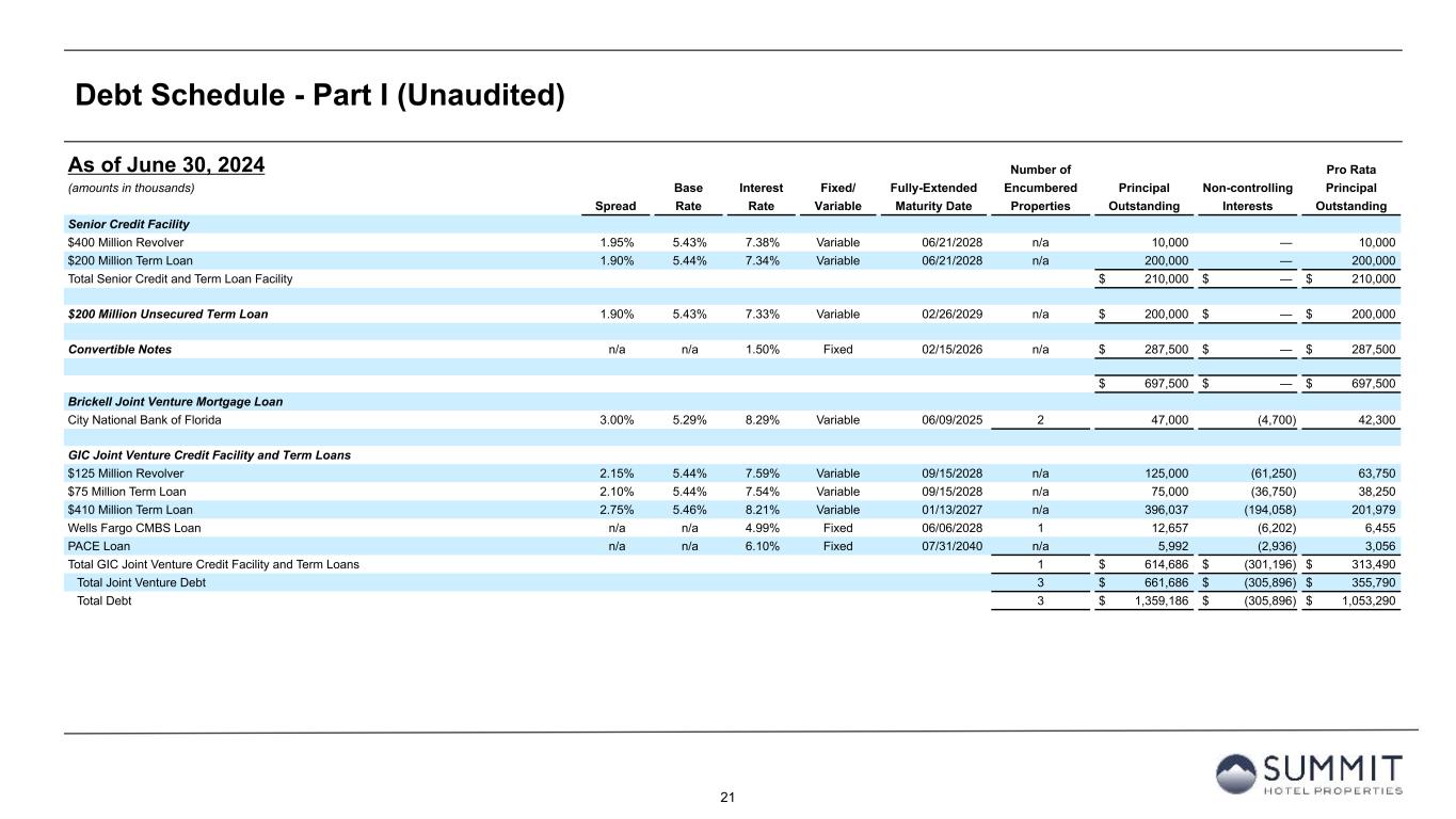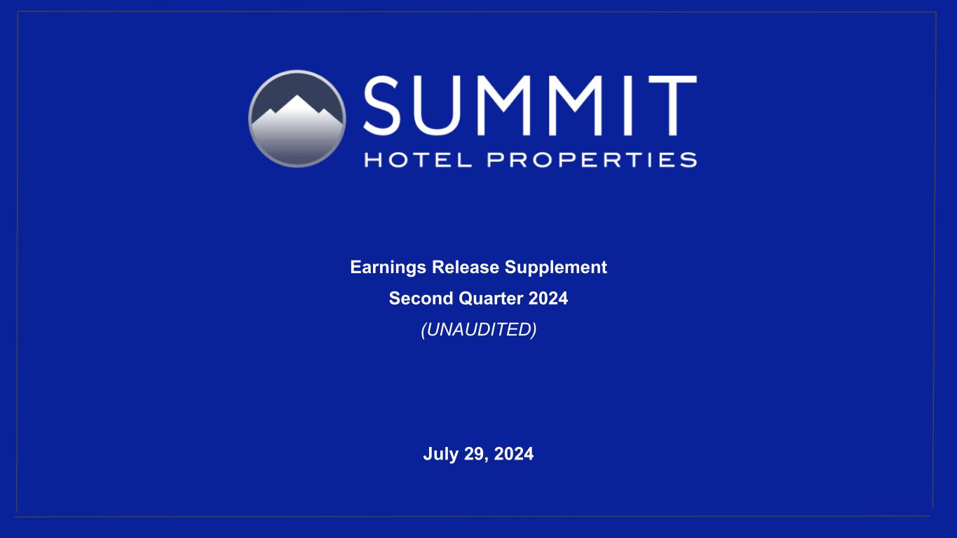 14 Reconciliation to Adjusted FFO - By Ownership Interest (Unaudited) 1. The total of these line items represents depreciation and amortization as reported on the Company’s Condensed Consolidated Statements of Operations for the periods presented. 2. Non-cash interest income relates to the amortization of the discount on certain notes receivable. The discount on these notes receivable was recorded at inception of the related loans based on the estimated value of the embedded purchase options in the notes receivable. 3. The Company includes the outstanding OP units issued by Summit Hotel OP, LP, the Company’s operating partnership, held by limited partners other than the Company because the OP units are redeemable for cash or, at the Company’s option, shares of the Company’s common stock on a one-for-one basis. 4. GIC Joint Venture is 51% owned by Summit while Other Joint Ventures are 90% owned by Summit. Summit GIC Other GIC JV Other JVs YTD 2024 Wholly-Owned Joint Venture Joint Ventures Combined Pro Rata Adj Pro Rata Adj Pro Rata (Amounts in thousands, except statistics) YTD 2024 YTD 2023 YTD 2024 YTD 2023 YTD 2024 YTD 2023 YTD 2024 YTD 2023 YTD 2024 YTD 2023 YTD 2024 YTD 2023 YTD 2024 YTD 2023 Net income (loss) 41,764 5,657 (1,930) (8,058) 1,697 1,321 41,531 (1,080) 907 3,783 (170) (132) 42,268 2,571 Preferred dividends (7,938) (7,938) — — — — (7,938) (7,938) — — — — (7,938) (7,938) Distributions to and accretion of redeemable non- controlling interests (1,314) (1,314) — — — — (1,314) (1,314) — — — — (1,314) (1,314) Net income (loss) applicable to common shares and common units $ 32,512 $ (3,595) $ (1,930) $ (8,058) $ 1,697 $ 1,321 $ 32,279 $ (10,332) $ 907 $ 3,783 $ (170) $ (132) $ 33,016 $ (6,681) Real estate-related depreciation 38,334 38,209 30,396 31,841 2,139 2,004 70,869 72,054 (14,894) (15,602) (214) (200) 55,761 56,252 (Gain) loss on disposal of assets and other dispositions, net (28,290) 336 (127) 32 — — (28,417) 368 62 (16) — — (28,355) 352 FFO applicable to common shares and common units $ 42,556 $ 34,950 $ 28,339 $ 23,815 $ 3,836 $ 3,325 $ 74,731 $ 62,090 $ (13,925) $ (11,835) $ (384) $ (332) $ 60,422 $ 49,923 Recoveries of credit losses — (250) — — — — — (250) — — — — — (250) Equity Based Compensation 4,483 4,046 — — — — 4,483 4,046 — — — — 4,483 4,046 Amortization of Deferred Financing Costs 2,320 1,817 890 938 30 30 3,240 2,785 (436) (460) (3) (3) 2,801 2,322 Amortization of Franchise Fees 168 129 157 157 — — 325 286 (77) (77) — — 248 209 Amortization of intangible assets — — 1,822 1,822 — — 1,822 1,822 (893) (893) — — 929 929 Transaction costs and other — 13 — 11 — — — 24 — (5) — — — 19 Debt Transaction Costs 567 269 14 59 — — 581 328 (7) (29) — — 574 299 Gain on extinguishment of debt (3,000) — — — — — (3,000) — — — — — (3,000) — Non-Cash Interest Income (266) (263) — — — — (266) (263) — — — — (266) (263) Non-Cash Lease expense, net 244 238 (22) 24 — — 222 262 11 (12) — — 233 250 Casualty losses (gains), net 386 820 (863) 556 (404) 95 (881) 1,471 423 (272) 40 (10) (418) 1,189 Non-Cash Items and Other 362 705 (3) 63 — — 359 768 1 (30) — — 360 738 AFFO applicable to common shares and common units (1) $ 47,820 $ 42,474 $ 30,334 $ 27,445 $ 3,462 $ 3,450 $ 81,616 $ 73,369 $ (14,903) $ (13,613) $ (347) $ (345) $ 66,366 $ 59,411 FFO per share of Common Stock and Common Units $ 0.49 $ 0.41 AFFO per share of Common Stock and Common Units $ 0.54 $ 0.49 Weighted-average diluted shares of Common Stock and Common Units 123,664 122,223