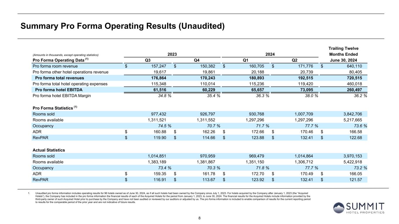 7 Summary Financial Results (Unaudited) For the Three Months Ended June 30, For the Six Months Ended June 30, (Amounts in thousands, except per share metrics and statistics) 2024 2023 2024 2023 Net income (loss) attributable to common stockholders $ 30,849 $ (753) $ 28,733 $ (5,981) Net income (loss) per diluted share $ 0.23 $ (0.01) $ 0.21 $ (0.06) Total revenues $ 193,903 $ 194,493 $ 382,045 $ 376,876 EBITDAre (1) $ 69,755 $ 61,602 $ 130,954 $ 116,942 Adjusted EBITDAre (1) $ 55,920 $ 52,896 $ 104,721 $ 97,323 FFO (1) $ 34,934 $ 27,847 $ 60,422 $ 49,923 Adjusted FFO (1) $ 36,370 $ 33,151 $ 66,366 $ 59,411 FFO per diluted share and unit (1) $ 0.28 $ 0.23 $ 0.49 $ 0.41 Adjusted FFO per diluted share and unit (1) $ 0.29 $ 0.27 $ 0.54 $ 0.49 Pro Forma (2) RevPAR $ 132.41 $ 128.10 $ 128.14 $ 125.28 RevPAR Growth 3.4 % 2.3 % Hotel EBITDA $ 73,095 $ 68,303 $ 138,752 $ 131,015 Hotel EBITDA Margin 38.0 % 36.8 % 37.2 % 36.2 % Hotel EBITDA Margin Growth 120 bps 93 bps Same Store (3) RevPAR $ 132.59 $ 128.38 $ 127.72 $ 124.82 RevPAR Growth 3.3 % 2.3 % Hotel EBITDA $ 72,387 $ 67,746 $ 136,205 $ 128,509 Hotel EBITDA Margin 38.0 % 36.8 % 37.0 % 36.0 % Hotel EBITDA Margin Growth 118 bps 94 bps 1. See tables later in this presentation for a discussion and reconciliation of Net income (loss) to non-GAAP financial measures, including earnings before interest, taxes, depreciation, and amortization (“EBITDA”), EBITDAre, adjusted EBITDAre, funds from operations (“FFO”), FFO per diluted share and unit, adjusted FFO (“AFFO”), and AFFO per diluted share and unit, as well as a reconciliation of Operating income to hotel EBITDA. See “Non-GAAP Financial Measures” at the end of this presentation. 2. Unless stated otherwise in this presentation, all pro forma information includes operating and financial results for 96 lodging properties owned as of June 30, 2024, as if each hotel had been owned by the Company since January 1, 2023 and remained open for the entirety of the measurement period. As a result, all pro forma information includes operating and financial results for hotels acquired since January 1, 2023, which may include periods prior to the Company’s ownership. Pro forma and non- GAAP financial measures are unaudited. 3. All same store information includes 94 lodging properties owned as of June 30, 2024, with operating and financial results for the three and six months ended June 30, 2024 and 2023.