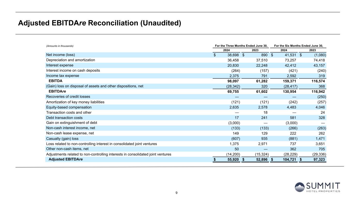 8 Summary Pro Forma Operating Results (Unaudited) 1. Unaudited pro forma information includes operating results for 96 hotels owned as of June 30, 2024, as if all such hotels had been owned by the Company since July 1, 2023. For hotels acquired by the Company after January 1, 2023 (the “Acquired Hotels”), the Company has included in the pro forma information the financial results of each of the Acquired Hotels for the period from January 1, 2023, to June 30, 2024. The financial results for the Acquired Hotels include information provided by the third-party owner of such Acquired Hotel prior to purchase by the Company and have not been audited or reviewed by our auditors or adjusted by us. The pro forma information is included to enable comparison of results for the current reporting period to results for the comparable period of the prior year and are not indicative of future results. Trailing Twelve (Amounts in thousands, except operating statistics) 2023 2024 Months Ended Pro Forma Operating Data (1) Q3 Q4 Q1 Q2 June 30, 2024 Pro forma room revenue $ 157,247 $ 150,382 $ 160,705 $ 171,776 $ 640,110 Pro forma other hotel operations revenue 19,617 19,861 20,188 20,739 80,405 Pro forma total revenues 176,864 170,243 180,893 192,515 720,515 Pro forma total hotel operating expenses 115,348 110,014 115,236 119,420 460,018 Pro forma hotel EBITDA 61,516 60,229 65,657 73,095 260,497 Pro forma hotel EBITDA Margin 34.8 % 35.4 % 36.3 % 38.0 % 36.2 % Pro Forma Statistics (1) Rooms sold 977,432 926,797 930,768 1,007,709 3,842,706 Rooms available 1,311,521 1,311,552 1,297,296 1,297,296 5,217,665 Occupancy 74.5 % 70.7 % 71.7 % 77.7 % 73.6 % ADR $ 160.88 $ 162.26 $ 172.66 $ 170.46 $ 166.58 RevPAR $ 119.90 $ 114.66 $ 123.88 $ 132.41 $ 122.68 Actual Statistics Rooms sold 1,014,851 970,959 969,479 1,014,864 3,970,153 Rooms available 1,383,189 1,381,867 1,351,150 1,306,712 5,422,918 Occupancy 73.4 % 70.3 % 71.8 % 77.7 % 73.2 % ADR $ 159.35 $ 161.78 $ 172.70 $ 170.49 $ 166.05 RevPAR $ 116.91 $ 113.67 $ 123.92 $ 132.41 $ 121.57